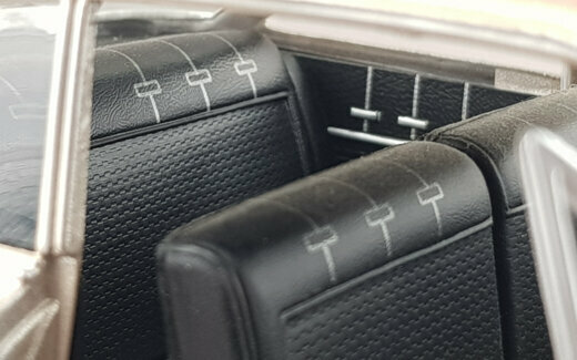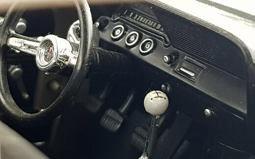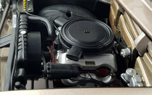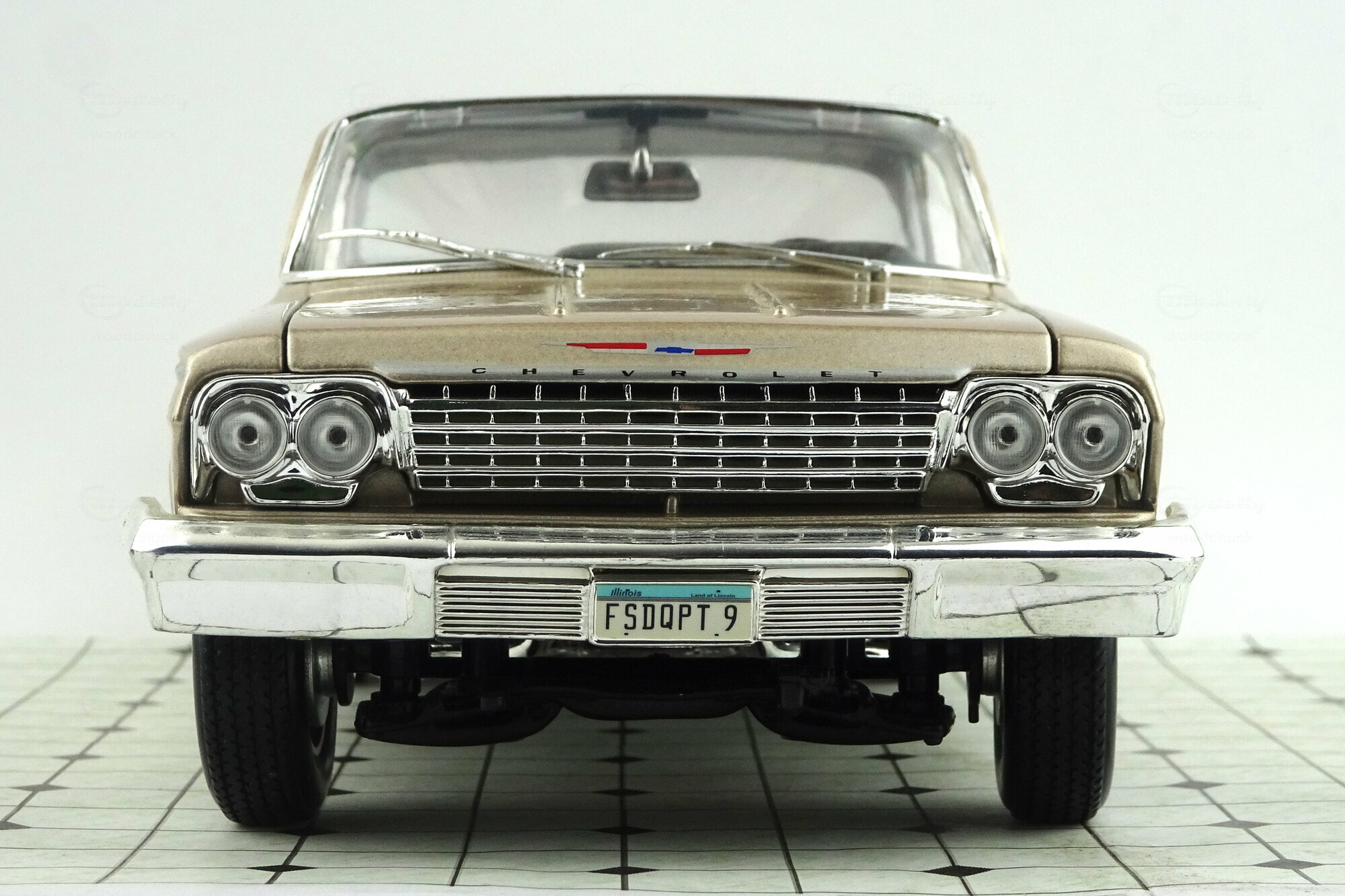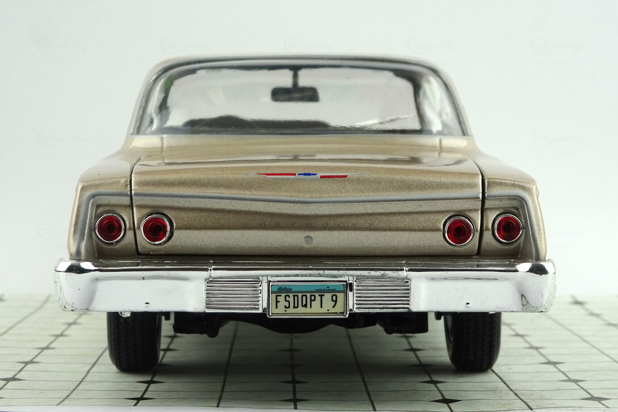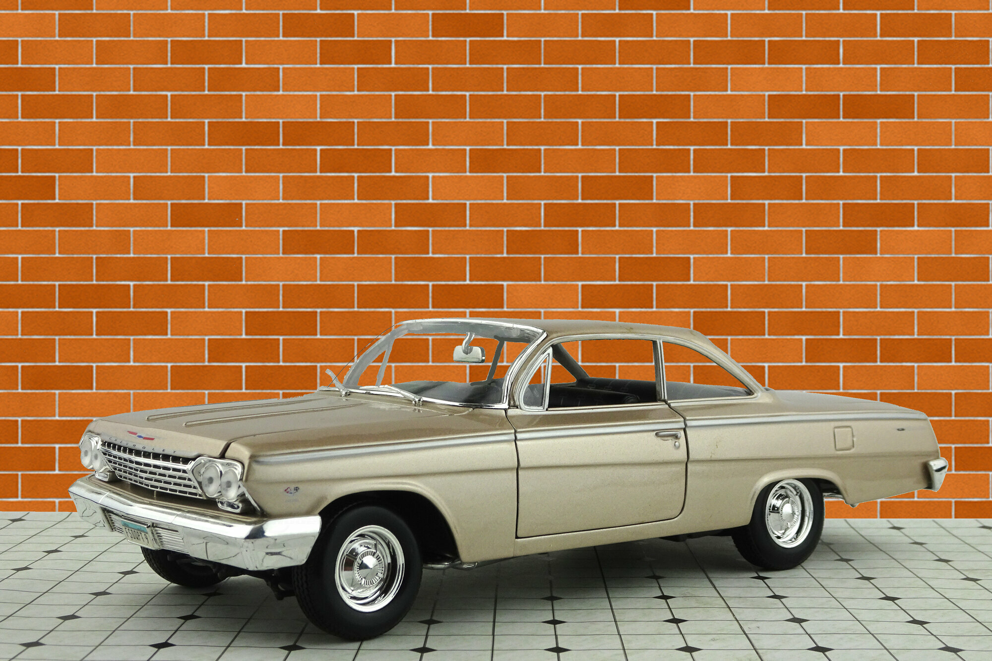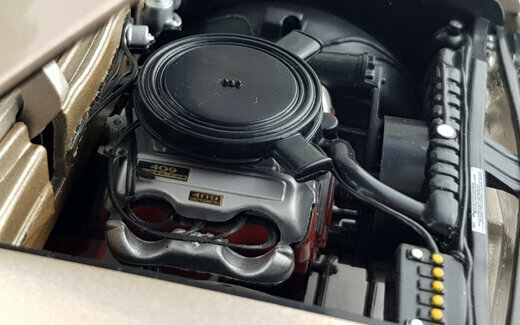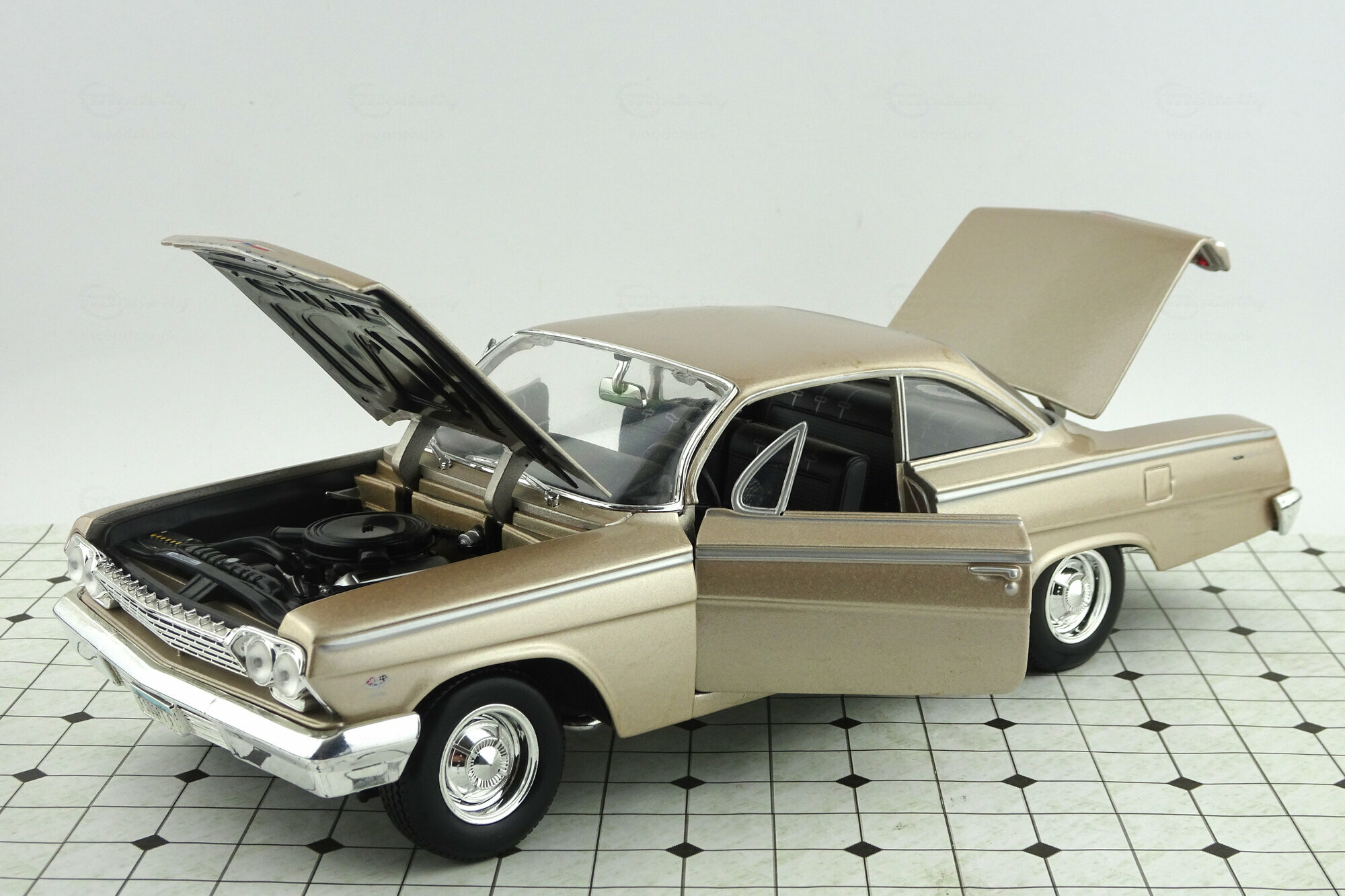 Das ab 2002 von Maisto in verschiedenen Farben erhältliche DieCast Modell der Bel Air Sport Coupé von 1962 gibt das Original auch wenn die Proportionen nicht so ganz stimmen, das Modell ist deutlich zu hoch, dennoch rech gut wieder. Auch der Spritzguss sowie die Lackierung sind ohne Tadel. Bei den äußeren Details hätte man sich etwas mehr Chrom (auch wenn das Original hier ebenfalls sehr spärlich ist) bei den Zierleisten wie auch einen Seitenspiegel gewünscht. Die Türgriffe sind etwas armselig und auf der Unterseite haben wir dann etwas zu viel Chrom. Die Räder sind wiederrum recht gut gelungen und die Hinterachse ist gefedert. Es lassen sich beide Türen, die Motorhaube sowie der Kofferraum öffnen. Dieser ist ziemlich leer und birgt keine Besonderheiten. Unter der Motorhaube sieht es schon deutlich besser aus. Hier findet man einen recht gut gestalteten Motorraum sowie eine für diese Modellklasse erstaunlich gut detaillierten „409“ v8 Motor. Der Innenraum ist etwas einfacher gehalten, das Armaturenbrett jedoch recht ordentlich gelungen. Abgesehen von der Höhe sind die Maßstabsabweichungen weniger als 2 %. Eingedenk der Tatsache dass der Einstandspreis einmal unter 30 € lag haben wir hier ein rech ansehnliches Modell. Aktuell ist das Modell im Netz zu Preisen um die 40 € zu bekommen.