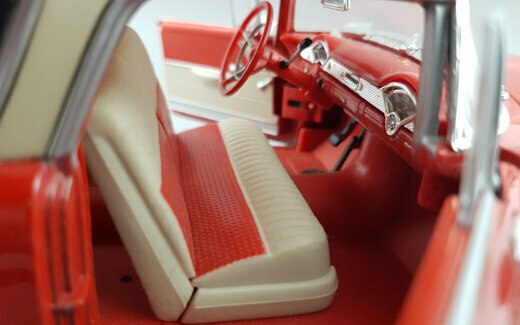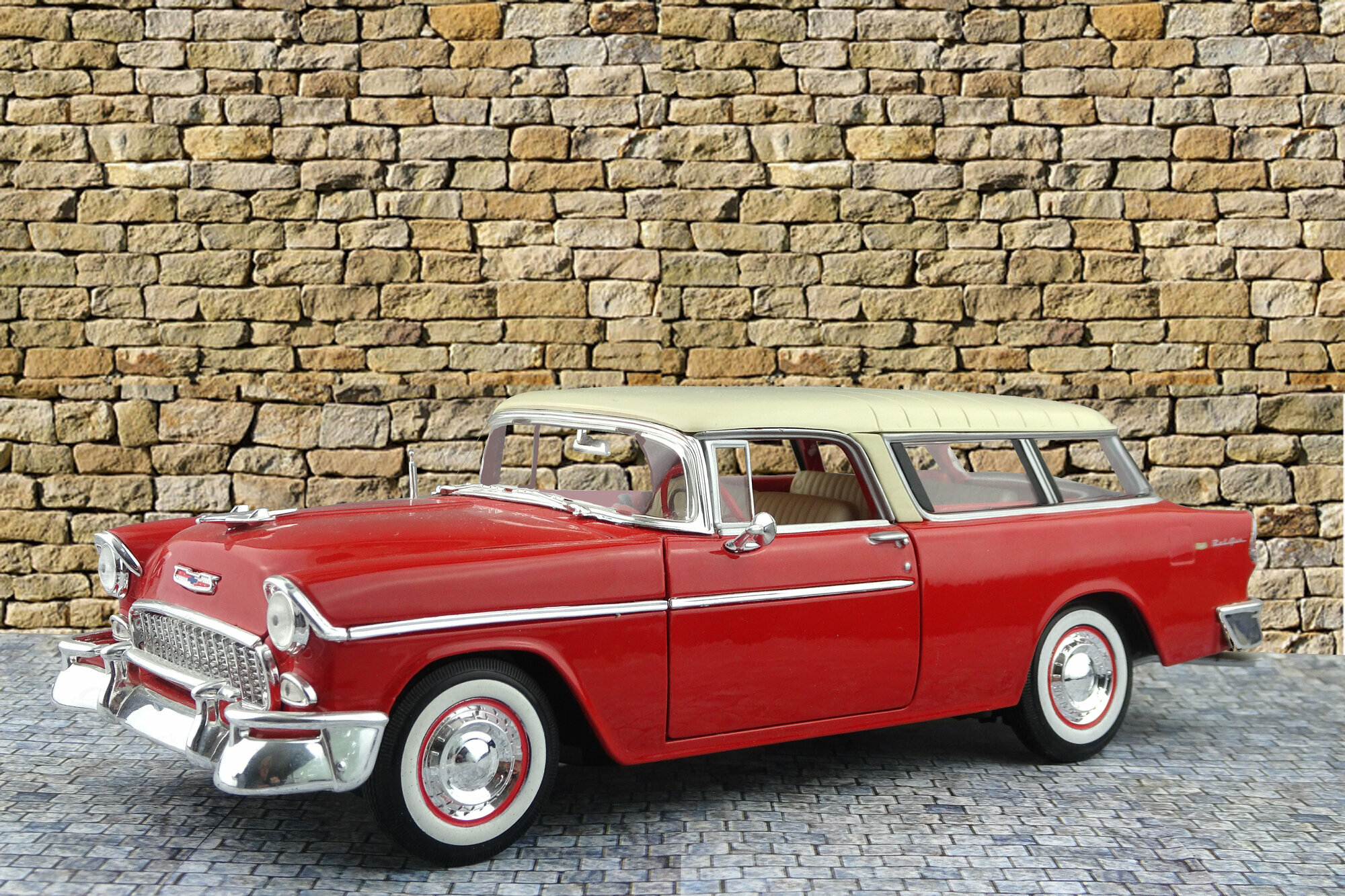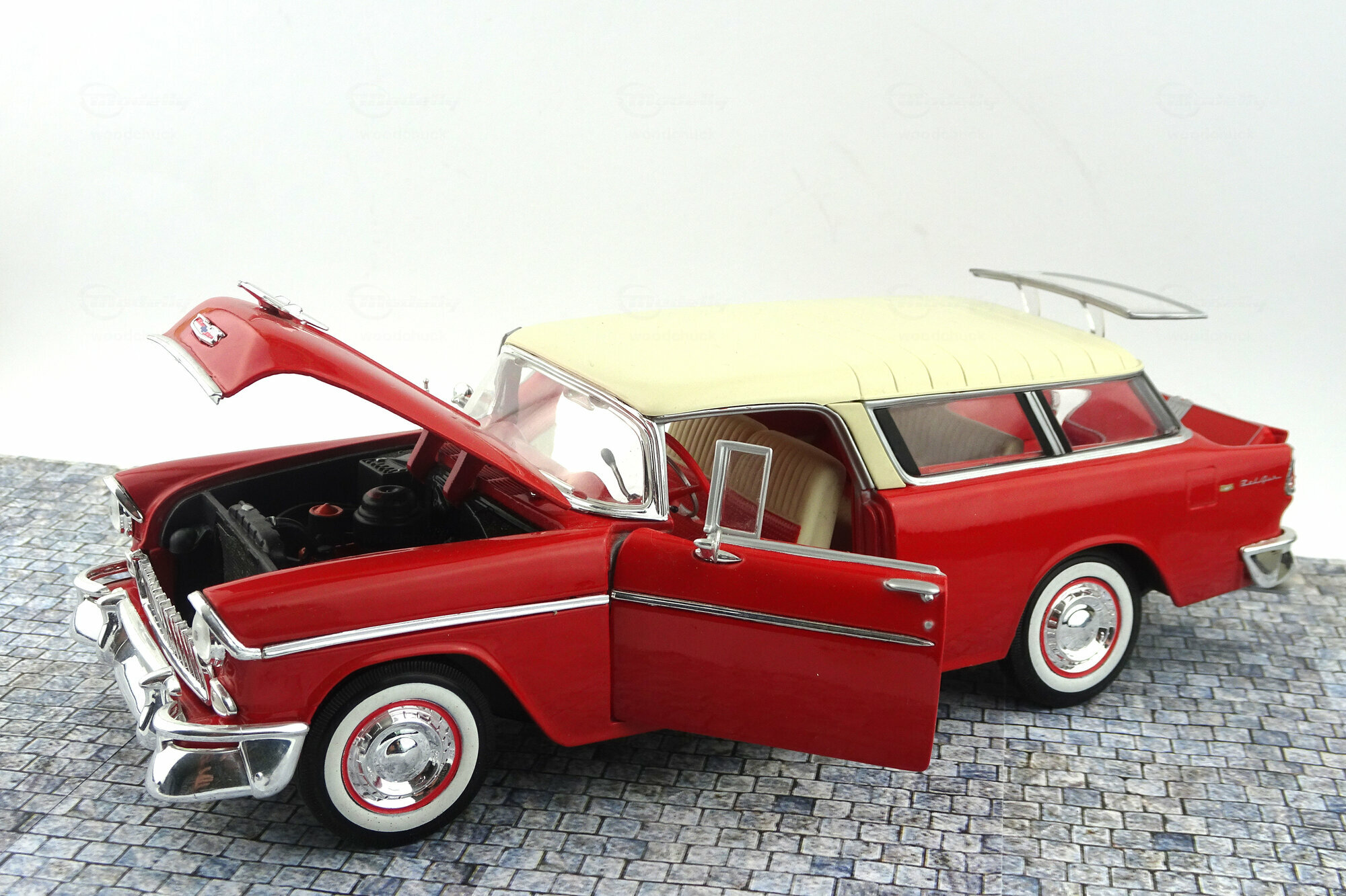 Zum ersten Male wurde der Name BelAir von Chevrolet 1952 für die zweitürigen Hardtops der Modellreihe DeLuxe verwendet. Erst ab 1953 wurde der BelAir zur Premium-Modellreihe oberhalb der 150 und 210 Serien die jedoch das gleiche Karosseriedesign hatten. Als Motoren standen Sechszylinder-Reihenmotoren mit 3,5 und 4 Litern Hubraum der Typen Thriftmaster und Blue Flame zur Verfügung. Es gab 2 und 4türigr Limousinen, Cabriolets sowie Coupés und ab 1954 eine Kombiversion. 1955 erhielten die Modelle ein komplett neues Styling und es wurden optional V8 Motoren angeboten. Dies galt auch für die Kombi-Variante die als Nomad bzw. Townsman vermarktet wurde und als 3- oder 5-türige Version erhältlich war. Der 4,3 Liter V8 Motor leistete 165 PS und verhalf dem 5 m langen und 1,9 m breiten sowie 1,5 t schweren Modell zu einer Höchst-geschwindigkeit von 160 km/h. 1955 wurden 8.386 Kombi-Versionen produziert. Für 1956 gab es ein Facelift bei welchem der „Ferrari-Grill“ einem über die volle Wagenbreite verlaufenden wich und die Heckflossen deutlich herausgearbeitet waren. Auffällig bei den Modellen 55 und 56 war eine, einem futuristischen Jetflugzeug nachempfundene Kühlerfigur. Das nochmals überarbeitete Modell von 1957 wurde dann zu einem der bekanntesten amerikanischen Autos. Der BelAir wurde in insgesamt 7 Generationen bis 1975 hergestellt