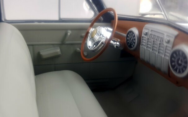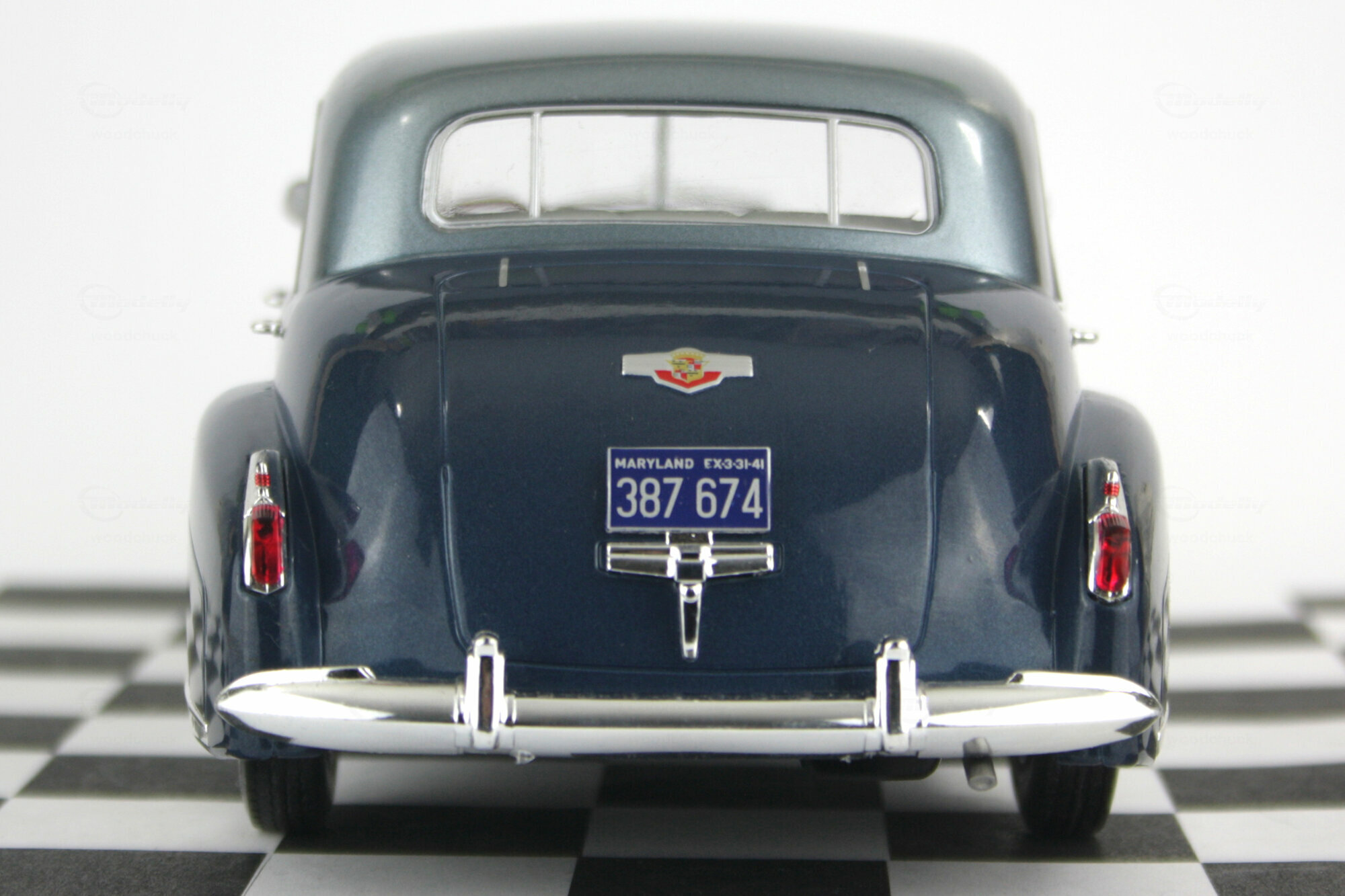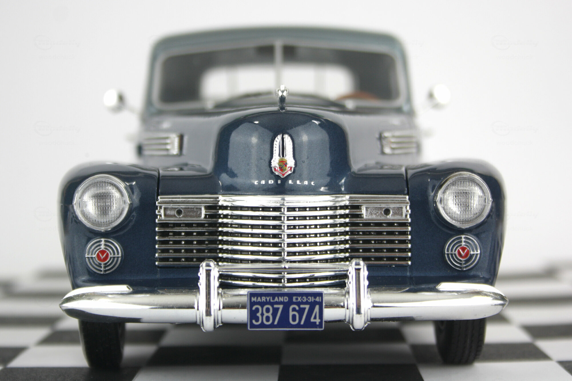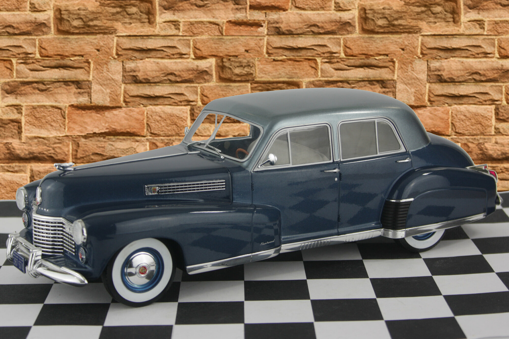 Model Car Group brachte das Modell des 1941 Cadillac „Sixty-Special“ im September 2017 in dunkelroter, später dann auch noch in metallic Blau, Lackierung heraus. Die Metallkarosserie ist gur gearbeitet, recht ordentlich detailliert und mit einer sauberen zweifarbigen Lackierung versehen. Leider lassen sich weder Türen noch Hauben öffnen, so daß auch keine Motornachbildung vorhanden ist. Der Unterboden ist mit einer Prägung der Achsen, Federung und Chassisstruktur versehen. Die Räder sind leider äußerst einfach ausgefallen. Der Innenraum ist sehr zwiespältig. Vorn habe wir ein recht schön, wenn auch grob, detailliertes Armaturenbrett mit einem ebensolchen Lenkrad. Die Sitze sind recht gut modelliert aber ohne jeglichen farblichen Akzent. Das gleiche kann man von den Seitenverkleidungen, die bei meinem Modell nur auf der linken Seite vorhanden waren, ebenfalls sagen. Der Boden ist armselig. Leider ist das Modell glatte 7 mm zu kurz, da aber auch bei der Breite 2 mm fehlen stimmen die Proportionen, ansonsten wird der Maßstab eingehalten. Bei einem Preis von um die 50 € kann man jedoch über die kleinen Unzulänglichkeiten hinwegsehen und erhalt so ein recht ordentliches Modell dieses klassischen Cadillacs.