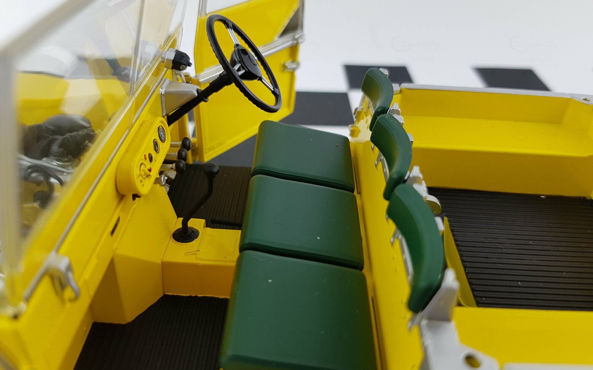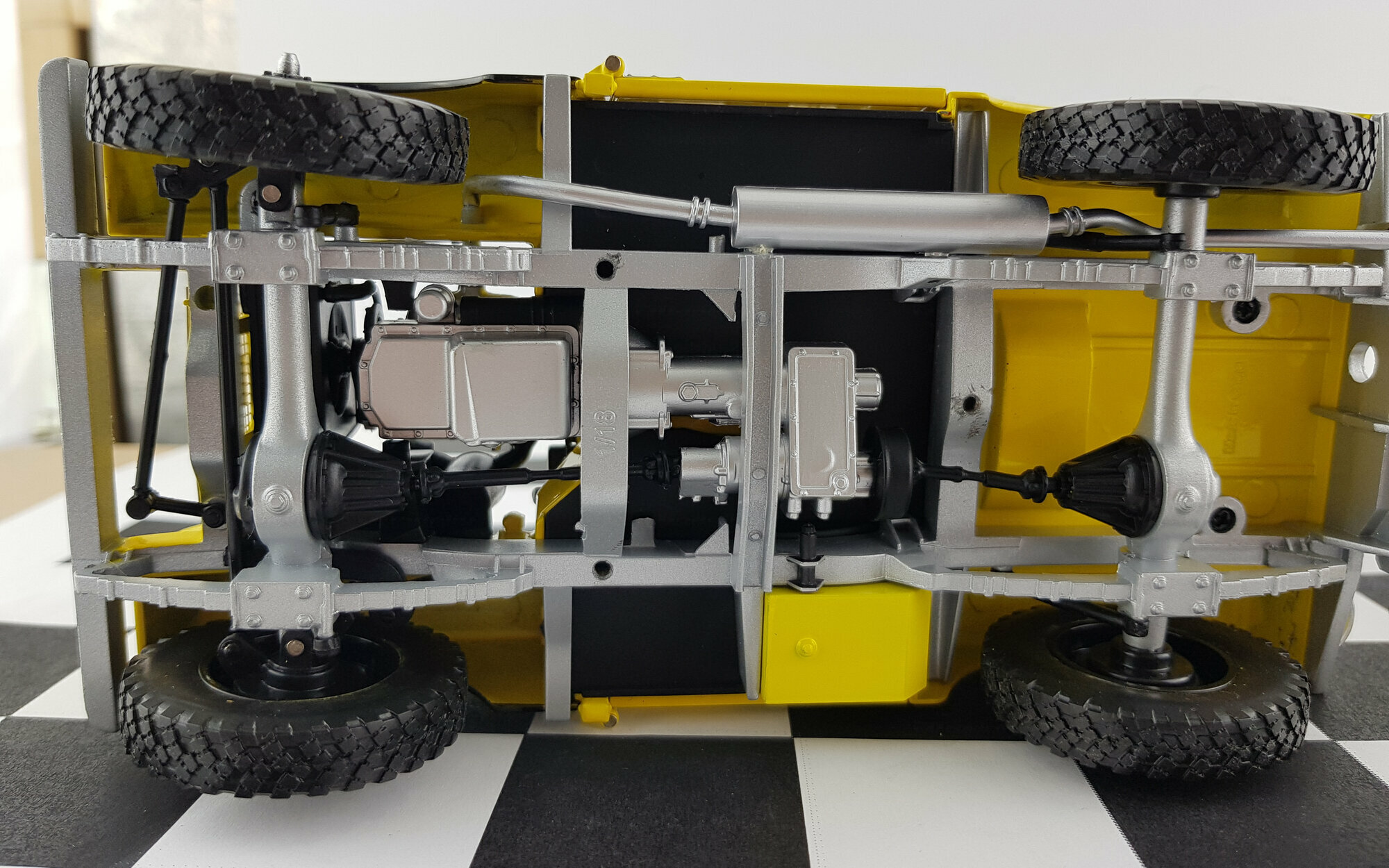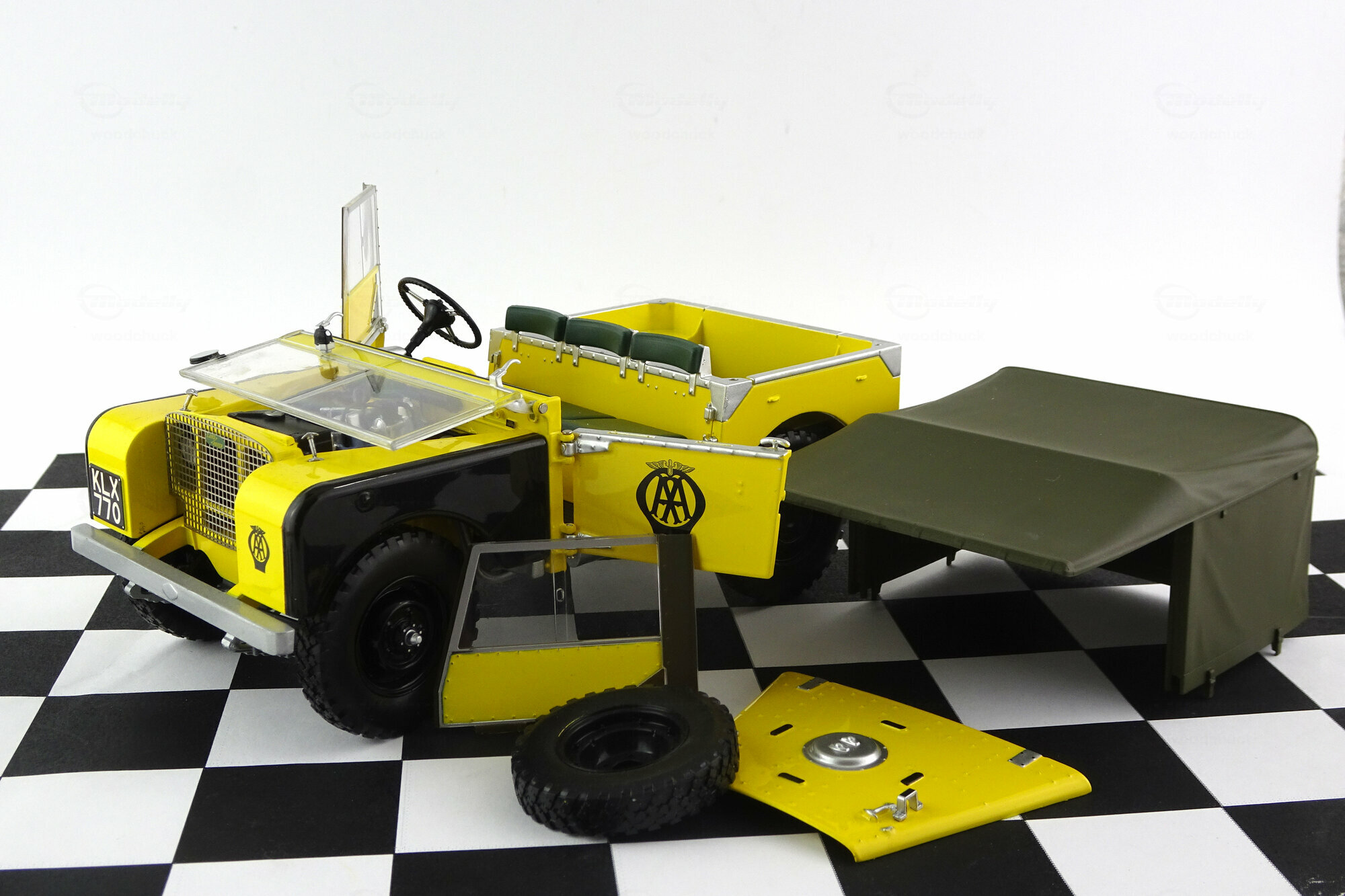 Minichamps hat das Modell des Land Rover Series I erstmals im typischen Airforce Green 2012 auf den Markt gebracht. Später folgten dann noch weitere Farben und Modellvarianten wie die gelbe des Britischen Automobilclubs. Das Modell ist, wie bei Minichamps üblich, hervorragend gefertigt und lackiert und verfügt über alle Varianten-spezifischen Beschriftungen. Die äußere Detaillierung ist sehr schön und besonders ist das geätzte Kühlergitter hinter dem sich die Scheinwerfer befinden zu erwähnen. Das sehr schön nachgebildete Stoffverdeck läßt sich ebenso wie die oberen Türhälften komplett und die Motorhaube komplett abnehmen. Die Türen lassen sich öffnen und die Frontscheibe nach vor klappen. Die Nachbildung des Motors ist hervorragend gelungen und zeigt sehr viele feine Details. Die spartanische Ausstattung des Innenraumes wurde originalgetreu wiedergegeben. Auf der Unterseite findet man ein vollständiges Chassis aus Kunststoff, eine ebenso gut detaillierte Unterseite des Motors mit Allradgetriebe, 2 Kardanwellen und 2 Differentialgetrieben in den Achsen. Proportionen um Maßstab stimmen sehr gut. Insgesamt ein sehr hochwertiges Modell dieses klassischen Oldtimers. Das Modell ist bei Händlern in verschiedenen Versionen um die 120,-- € zu bekommen.