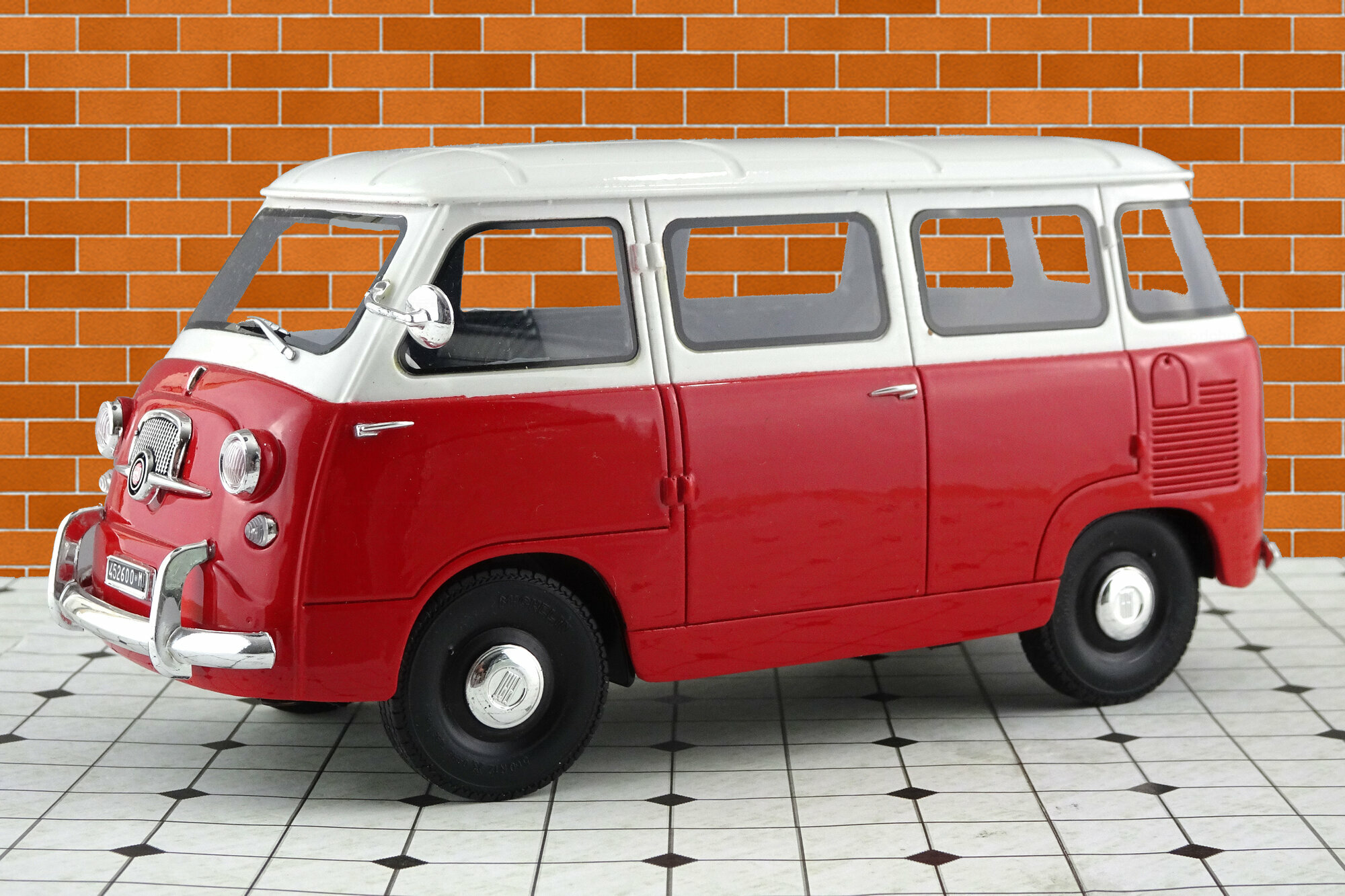 Der italienische Modellhersteller Miniminiera brachte im Mai 2017 ein Resinmodell des Fiat 600 Coriasco Pulmino als Bus Version heraus. Das Modell gab es in rot/weißer und blau/weißer Lackierung. Die äußeren Details sind soweit recht ordentlich gelungen, die Gravuren der Karosserie erscheinen etwas zu grob. Die Räder Wirken authentisch, die Felgen sind jedoch zu klein. Hier wurde auch der Unterboden mit einer Gravur der Details versehen und Motor und Achsen sind als separate Teile ausgeführt und die Vorderachse ist lenkbar. Die Inneneinrichtung hat ein paar Details, ist aber recht einfach ausgeführt. Da diese in schwarz gehalten ist und die Scheiben dunkel getönt sind (authentisch?) ist eh kaum etwas davon zu sehen. Blickt man von oben durch die Heckscheibe, kann man ganz unten eine vollständige Motornachbildung mit Zündkabeln erkennen (Schade). Die auf den Radstand sind alle Maße ein paar Millimeter zu groß geraten, die Proportionen wirken jedoch stimmig. Das Modell war nur noch bei italienischen Netzanbietern zu Preisen von 250 € was ich für deutlich zu hoch halte zuhaben.