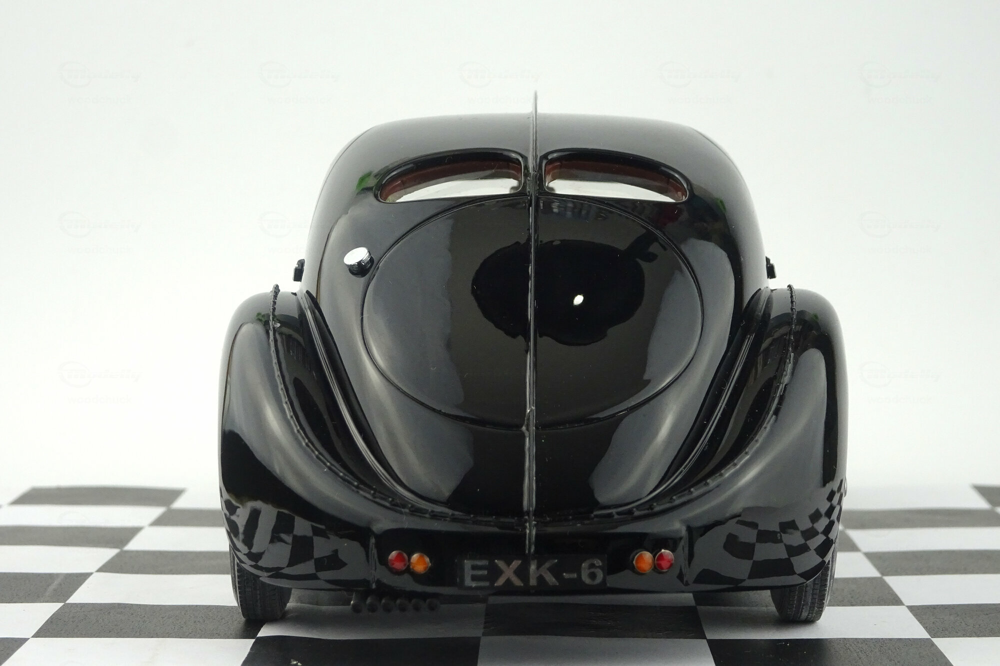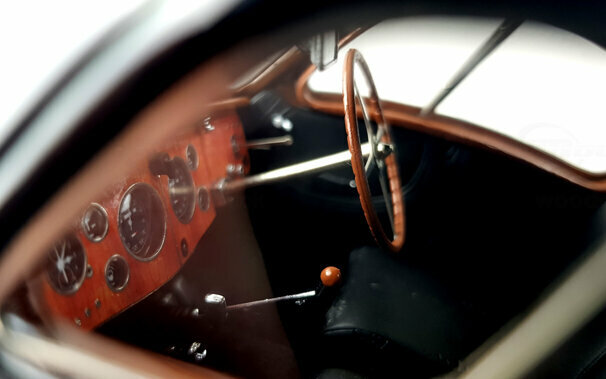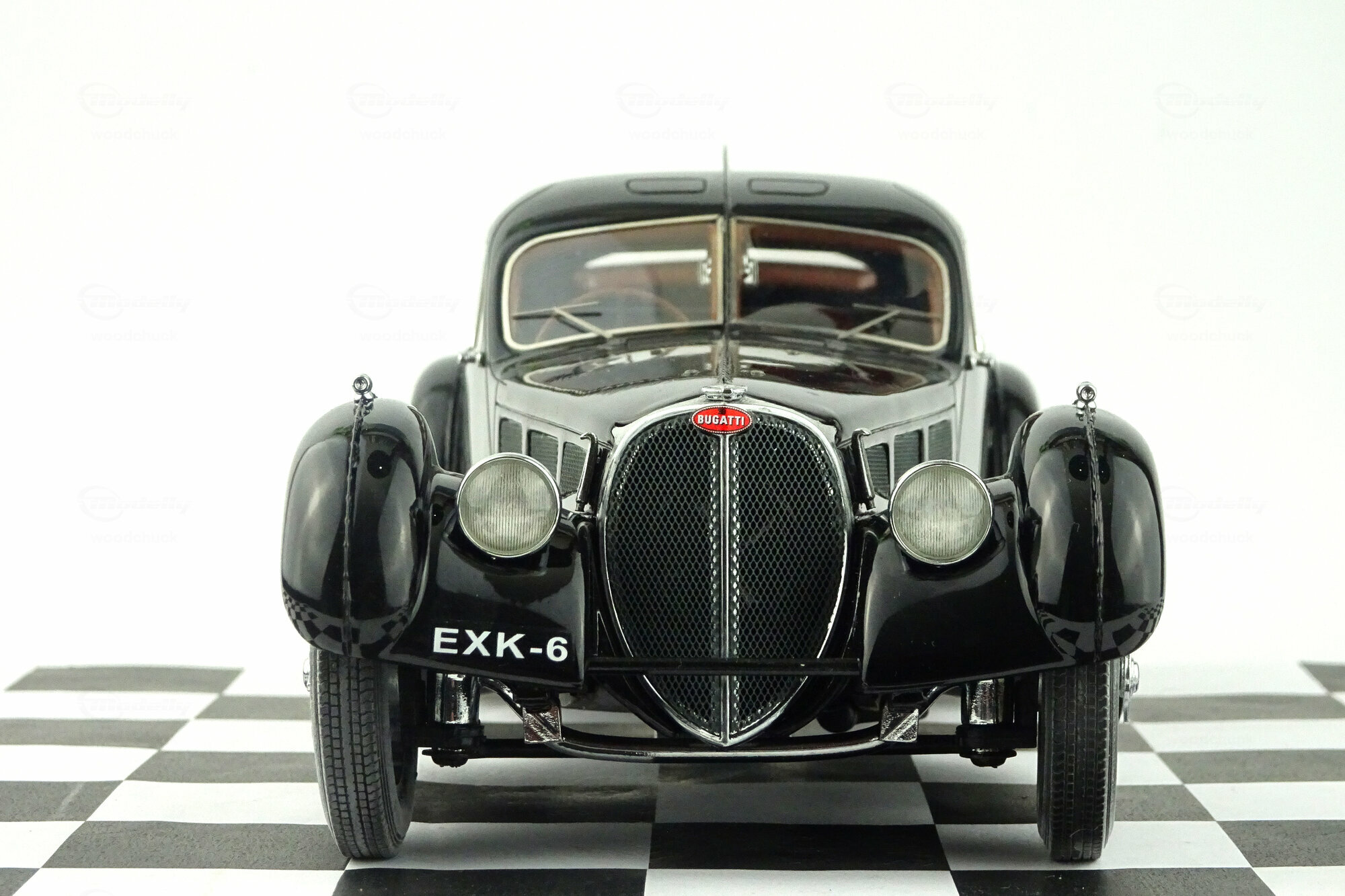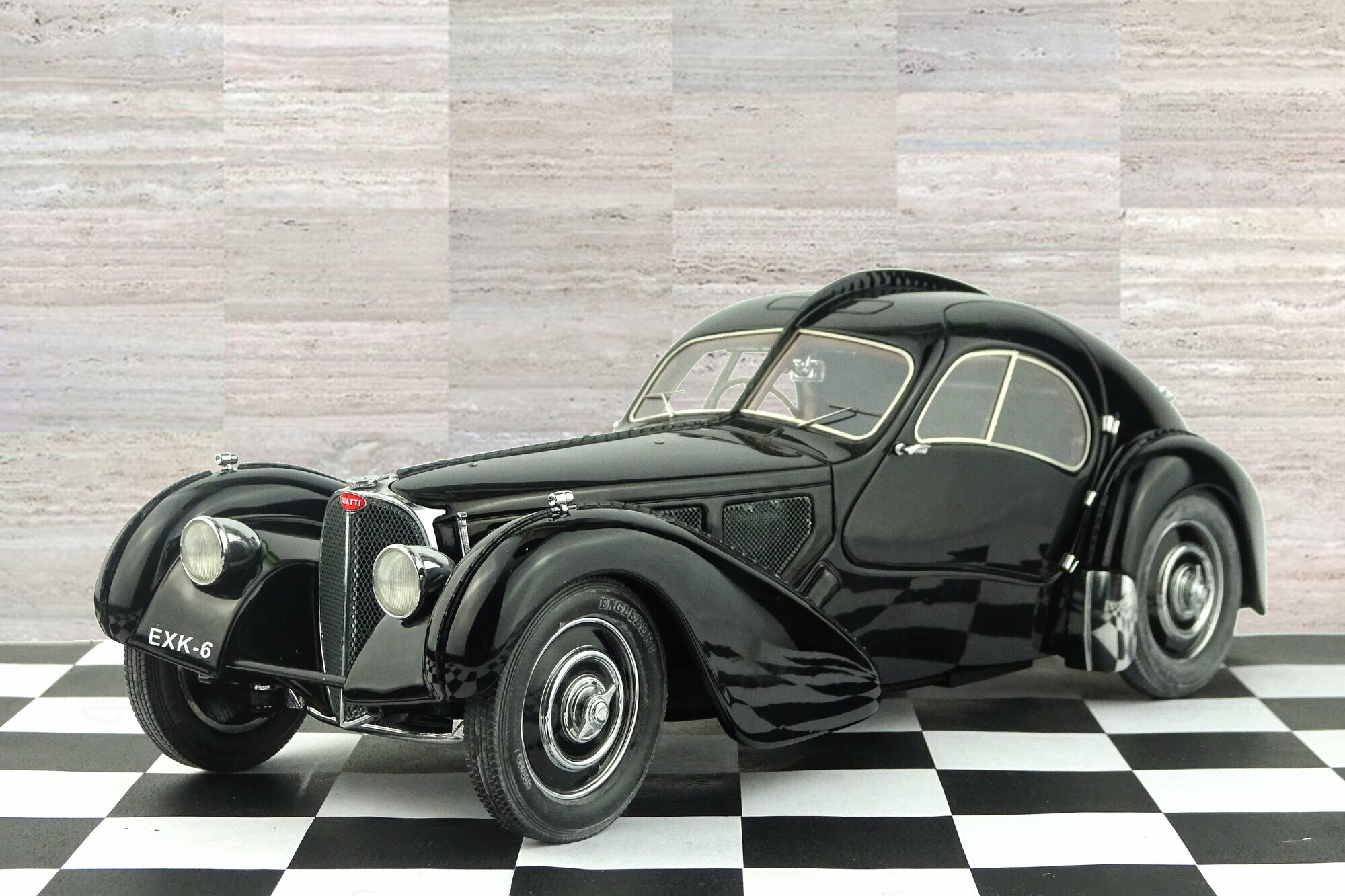 Der Typ 57 wurde unter der Regie von Jean Bugatti entwickelt und von 1934 bis 1940 in 3 Serien mit verschiedensten Aufbauten produziert. Je nach Quelle wurden von „57“ 630 bis 830 Modelle gefertigt und damit war er das Bugatti Modell was am längsten und in der größten Stückzahl gebaut wurde. Der 57 SC Atlantic war ein Sport Coupé welches aus dem Prototypen Aerolithe entwickelt wurde. Es hatte eine schlankere Karosserieform, einen deutlich tiefer angesetzten Kühler und die Türen waren weit ins Dach hineingeschnitten was den Einstieg in das niedrige Fahrzeug erleichterte. 1936 wurden 3 und 1938 noch 1 weiteres Exemplar gebaut. Dieses Fahrzeug mit der Fahrgestellnummer 57591 stellt das Vorbild für das Modell dar. Es wurde 1938 mit einer dunkelblauen Lackierung an einen britischen Kunden ausgeliefert. Heute befindet es sich, mittlerweile schwarz lackiert, im Besitz der Ralph Lauren Sammlung und gilt mit einem Schätzwert von 30 – 40 Millionen US $ als teuerster „Gebrauchtwagen“ der Welt. Der „Atlantic“ war mit einer Länge von 4,15 m und einer Breite von 1,50 m recht klein und mit unter 1 Tonne damals ein „Leichtgewicht“. Der 8 Zylinder-Reihenmotor mit 3,3 l Hubraum leistete aufgeladen 200 PS und verlieh dem Wagen eine Höchstgeschwindigkeit von über 200 km/h.
