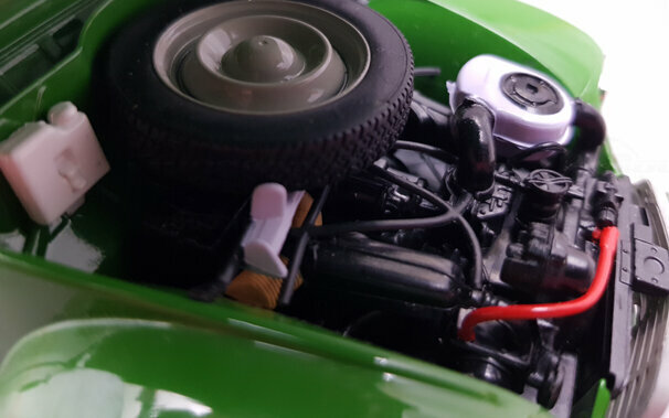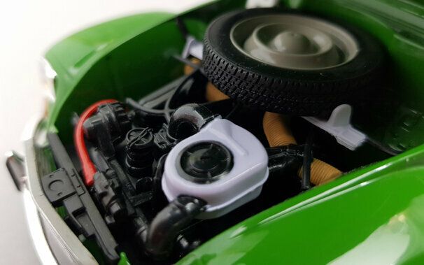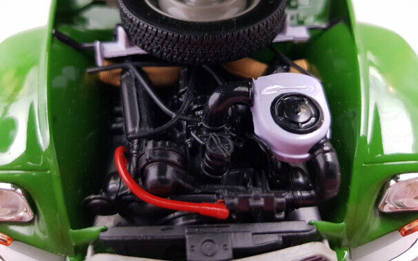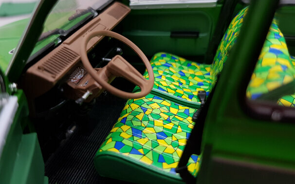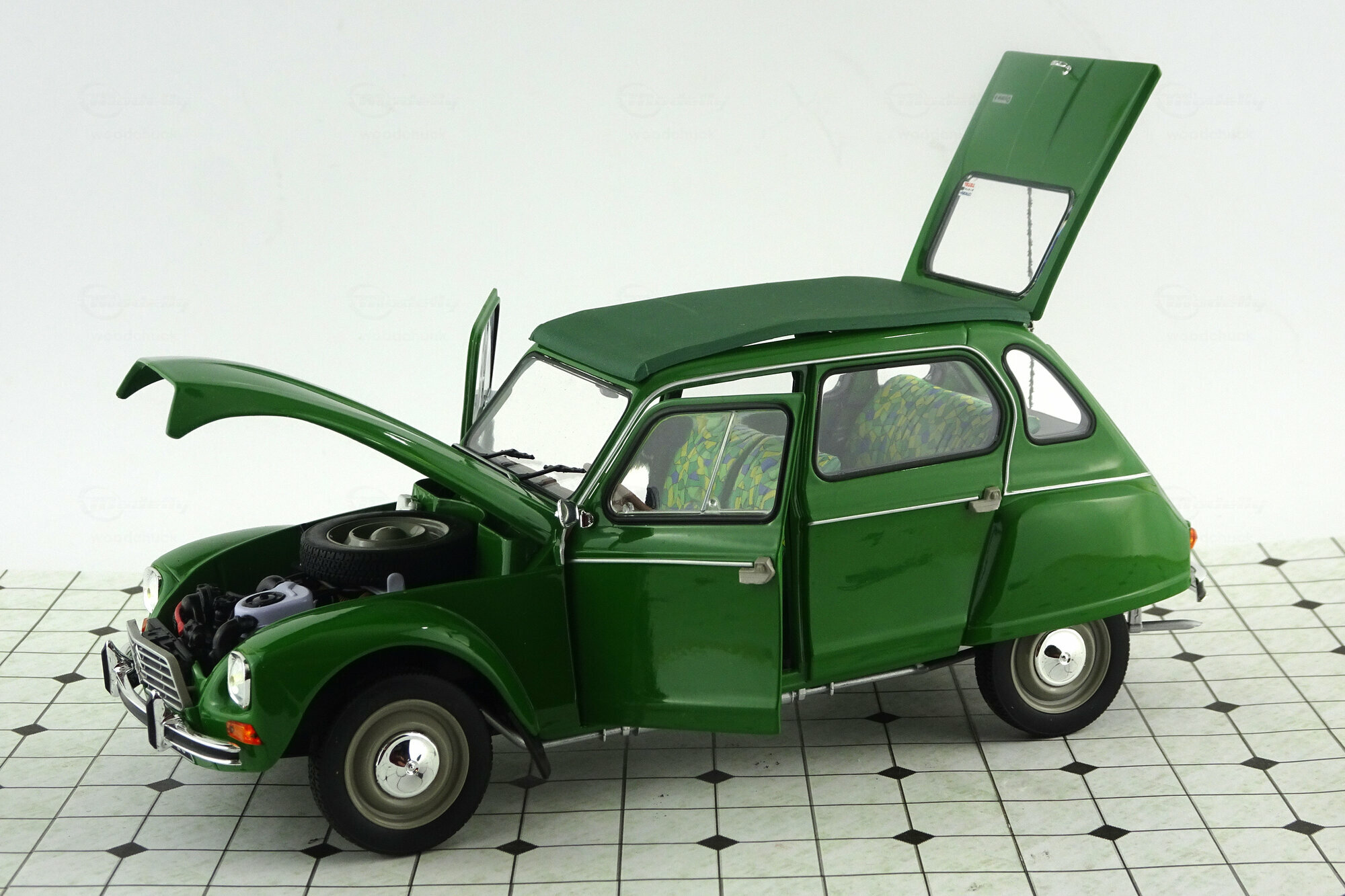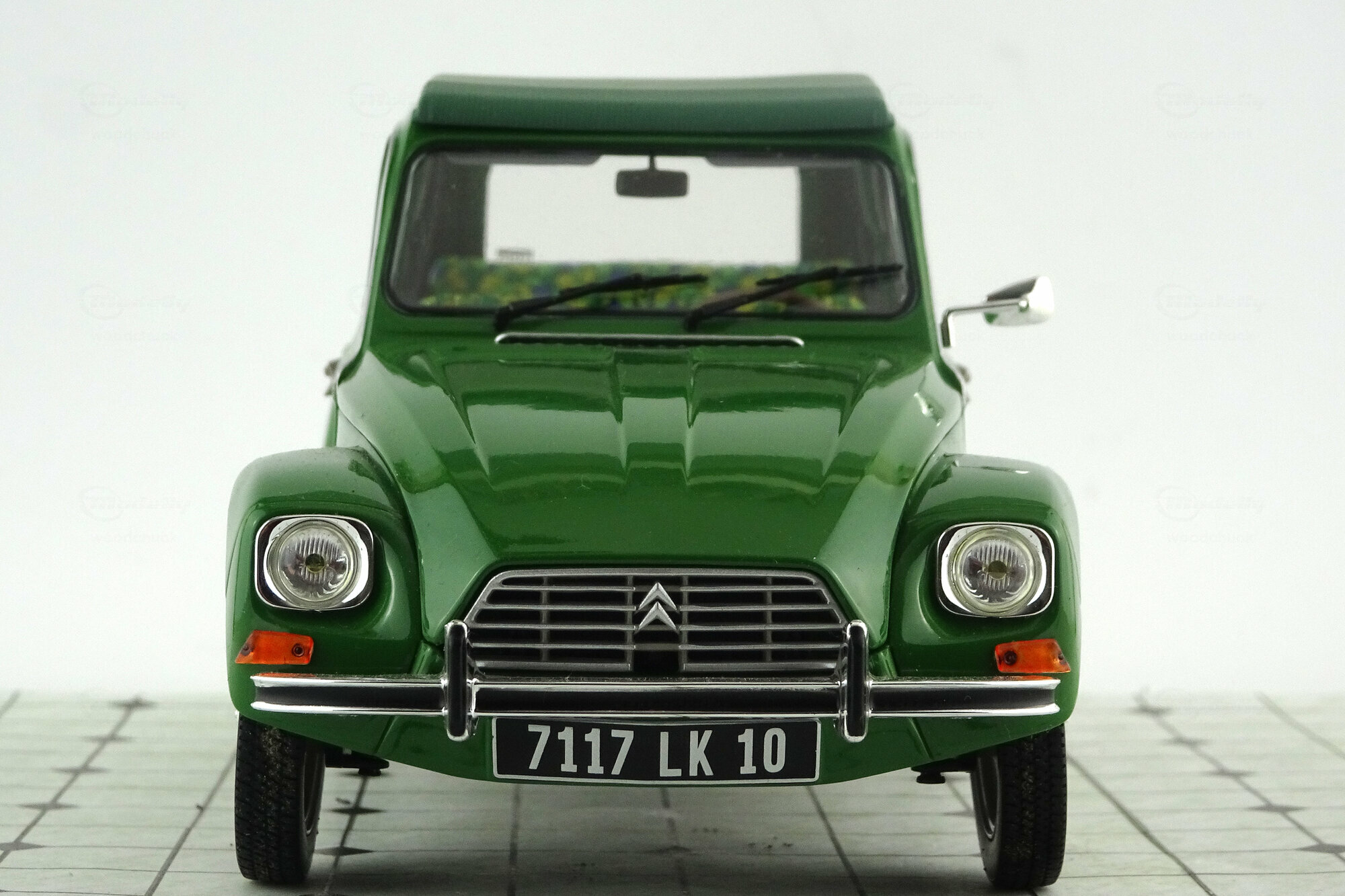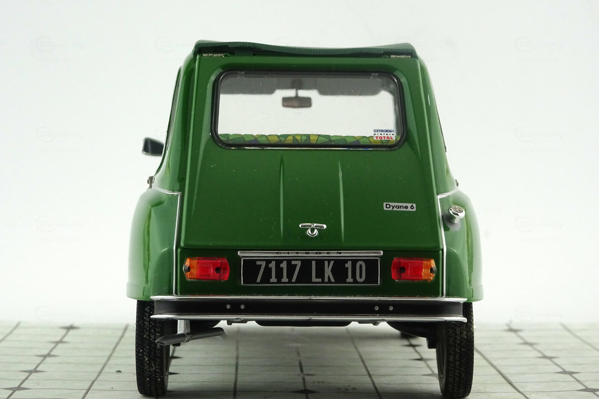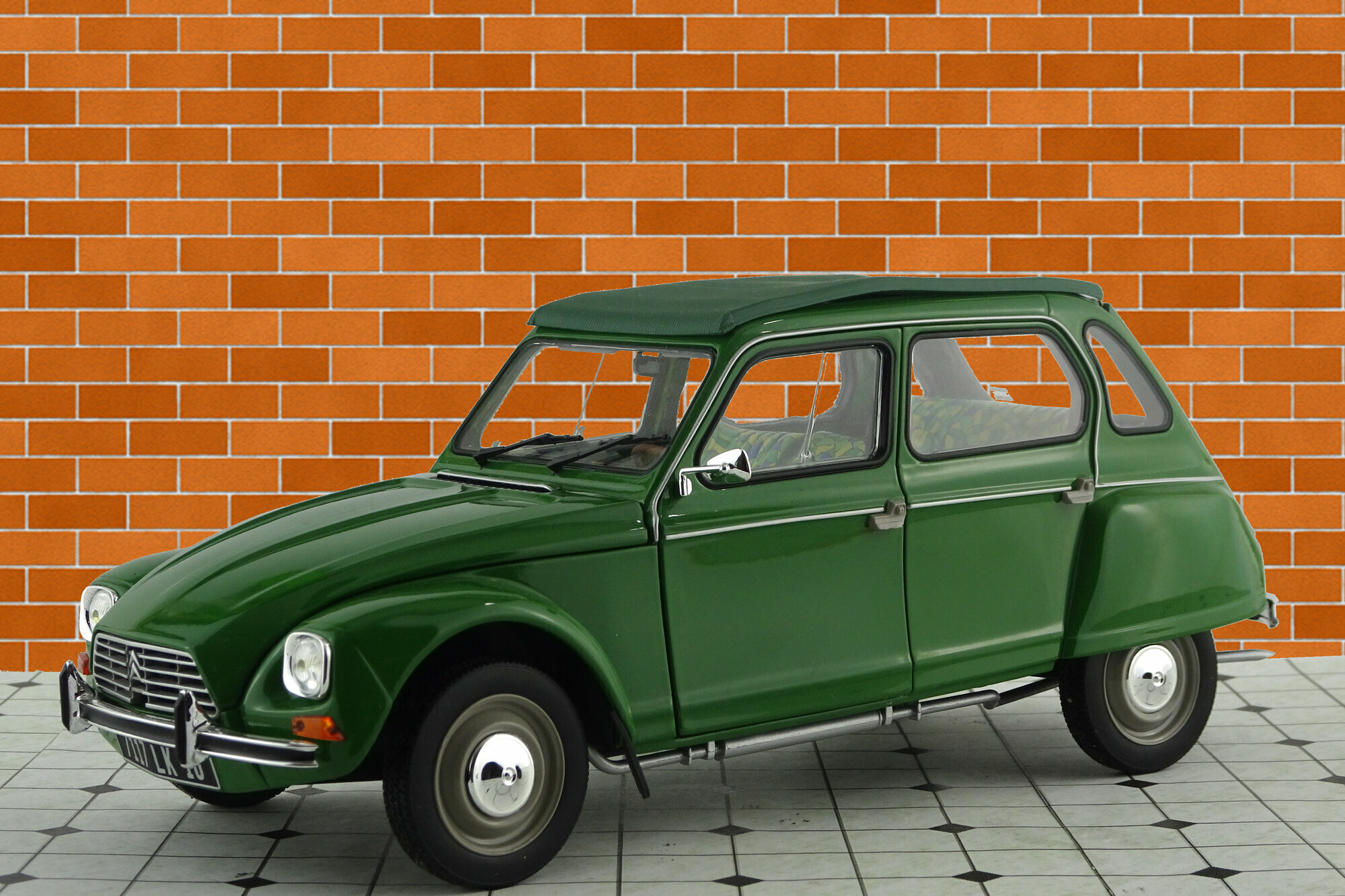 Im Oktober 2016 erschien bei Norev ein Modell der Dyane 6 von 1969 in DieCast-Bauweise. Die in einem „knalligen“ Grasgrün lackierte Metallkarosserie ist sauber gearbeitet. Das Dach, beim Original aus Stoff, ist in Vinyl nachgebildet und manchmal etwas widerspenstig. Alternativ liegt ein Koststoffteil welches das Dach im aufgerollten Zustand zeigt bei. Motorhaube, Kofferklappe und vordere Türen lassen sich öffnen, die Lenkung ist beweglich. Auf der Unterseite sind die Schwingen für die Einzelradaufhängung und die Auspuffanlage schön dargestellt, der Kastenrahmenboden gibt ansonsten auch nicht viele Details her. Ebenso ist die sehr weiche Federung des Citroen Fahrzeuge gut nachempfunden. Die äußeren Details sind recht ansprechend nachgebildet. Unter der Motorhaube findet man einen gut detaillierten Motor mit Schläuchen und Kabeln sowie das üblicherweise dort platzierte Ersatzrad. Auch im Innenraum ist recht einfach modelliert, durch die große Menge von Details jedoch sehr schön gestaltet. Die Sitze haben einen Bezug in knalligem Gelb, Grün und Blau dessen Muster an den Flugzeugtarnstoff im 1. Weltkrieg erinnert und ich habe Zweifel ab es sowas tatsächlich gab. Der Kofferraum ist einfach weist aber überall Strukturen auf. Der Maßstab wird gut eingehalten und die Proportionen stimmen. Für eine Preis von um die 50 € erhält man eine sehr schönes Modell dieses französischen Klassikers.