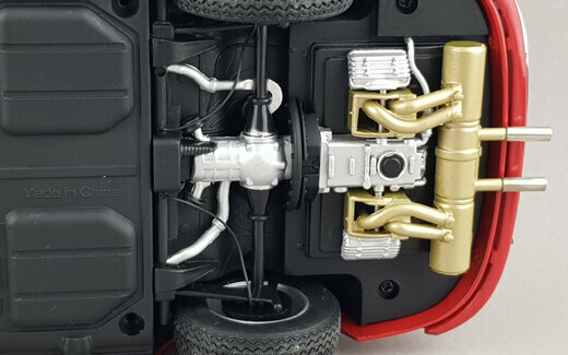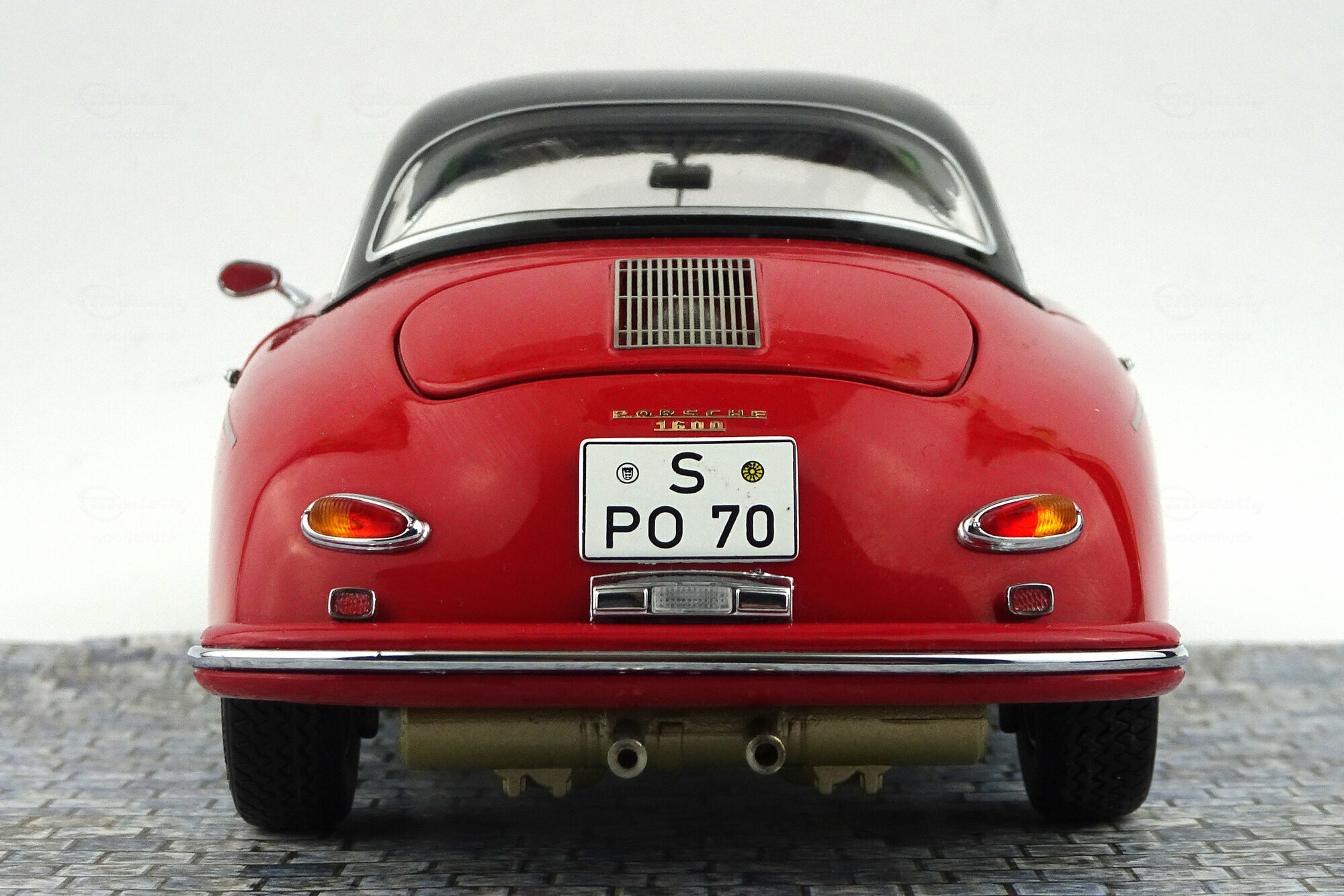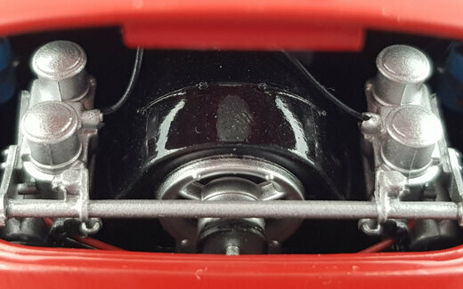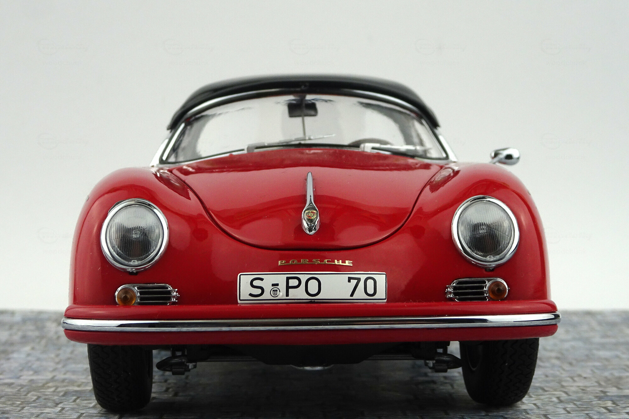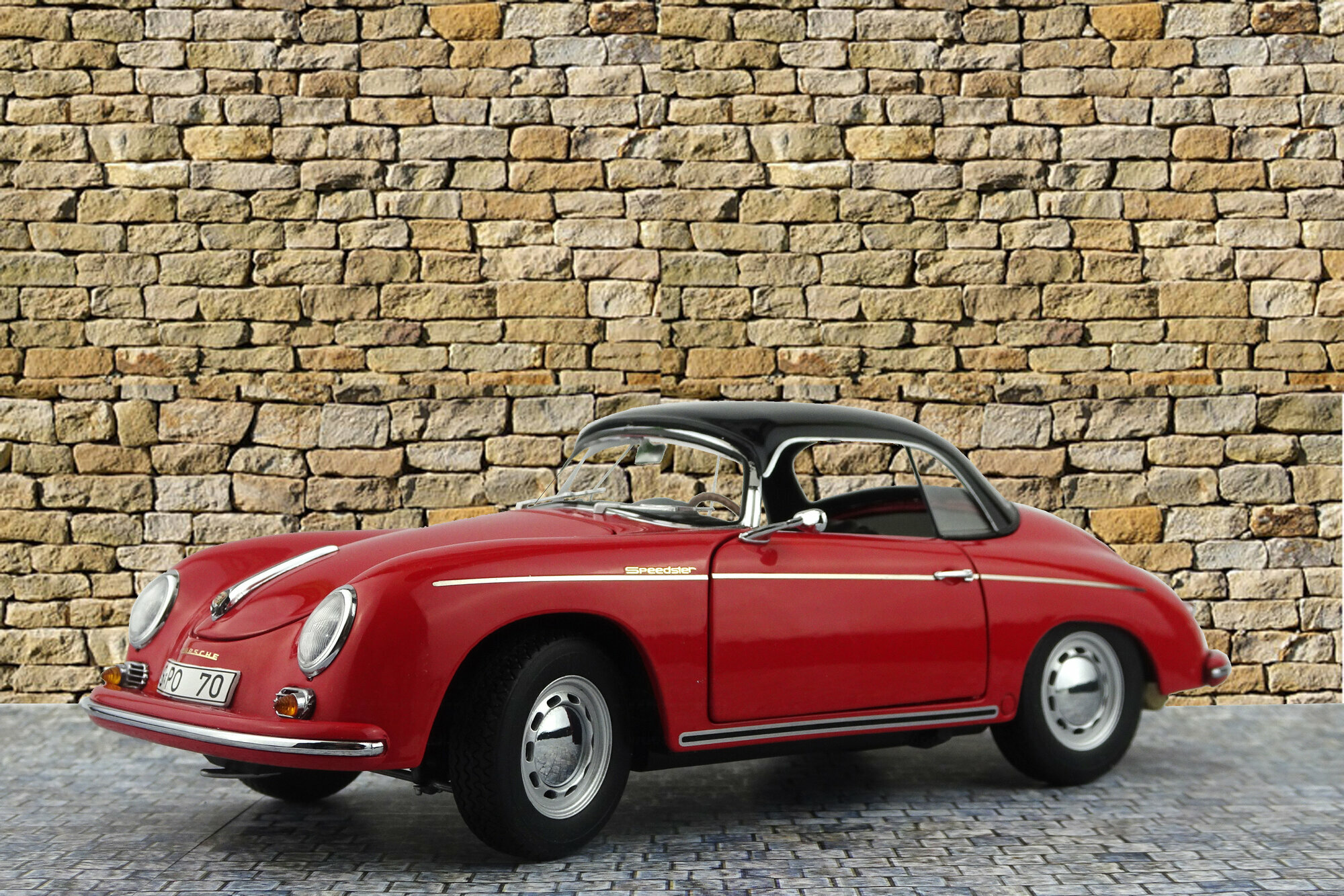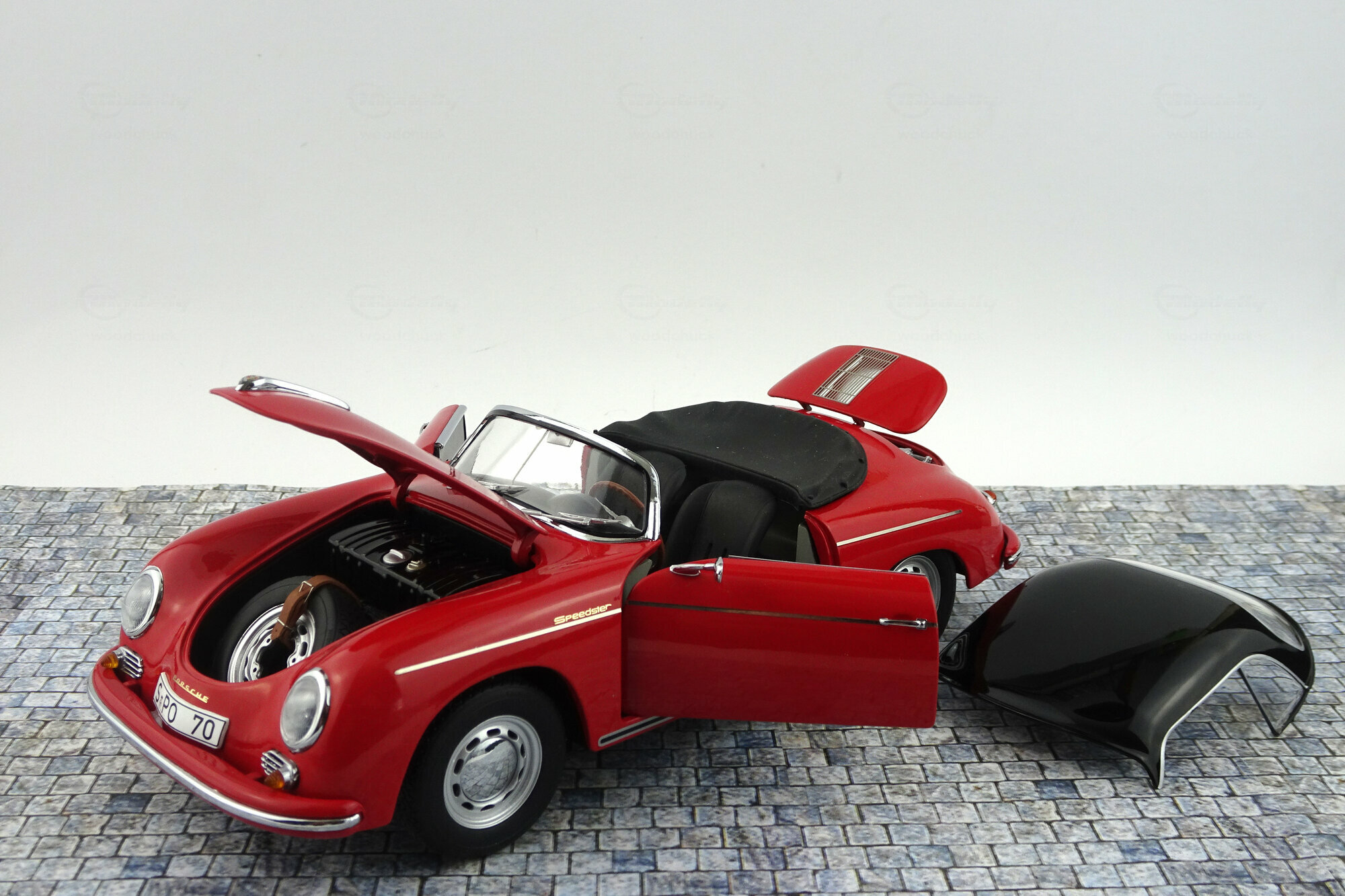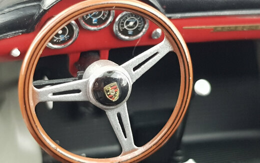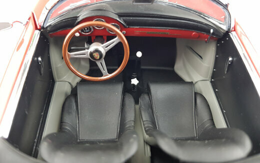 Schuco brachte im Dezember 2019 ein limitiertes DieCast-Modell des 356A Speedster 1600 der ab 1955 gebaut wurde heraus. Das Modell ist hervorragend gefertigt und lackiert. Das Hardtop-Dach aus Kunststoff ist abnehmbar und eine Abdeckung des hintern Bereichs für die offenen Version ist beigefügt. Die äußeren Details sind sehr filigran gestaltet, dies gilt besonders für die Lüftungsgitter und die Scheibenwischer. Schöne Räder und eine gelungene Unterseite mit der kompletten Motorunterseite, Getriebe und Bremsleitungen runden das Bild ab. Es lassen Motorklappe, Kofferraum sowie beide Türen öffnen. Unter der Motorklappe im Heck sieht man die zweite Hälfte des Motors die ebenso schön geworden ist. Öffnet man die vordere Haube, sieht man deutlich daß ein Kofferraum fehlt. Hier nehmen Tank, Reserverad sowie das Werkzeug zum Reifenwechsel fast den gesamten Platz ein. Der Innenraum steht den anderen Bereichen in Nichts nach. Sehr schön modellierte Schalensitze, hervorragendes Lenkrad mit einem ebensolchen Armaturenbrett und ein gelungener Fußraum macht den sehr guten Eindruck dieses Modells komplett. Auch der Maßstab wird sehr gut eingehalten. Ein sehr schönes Modell was im Handel kaum noch zu haben ist und für welches man im Netz bis zu 200 € bezahlen muß.