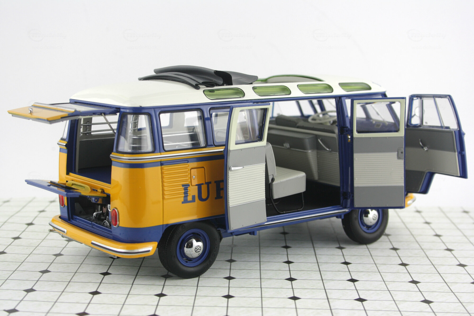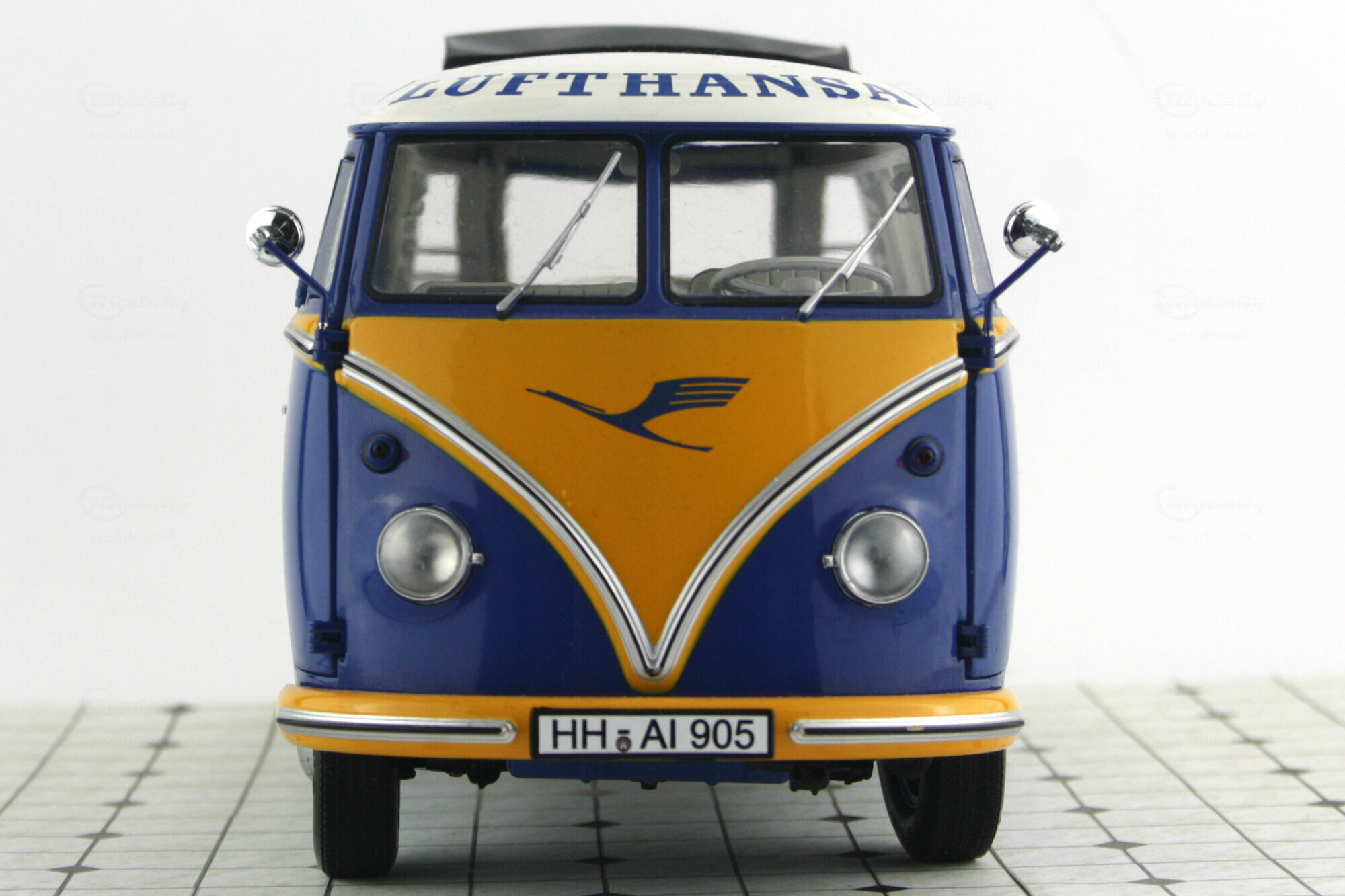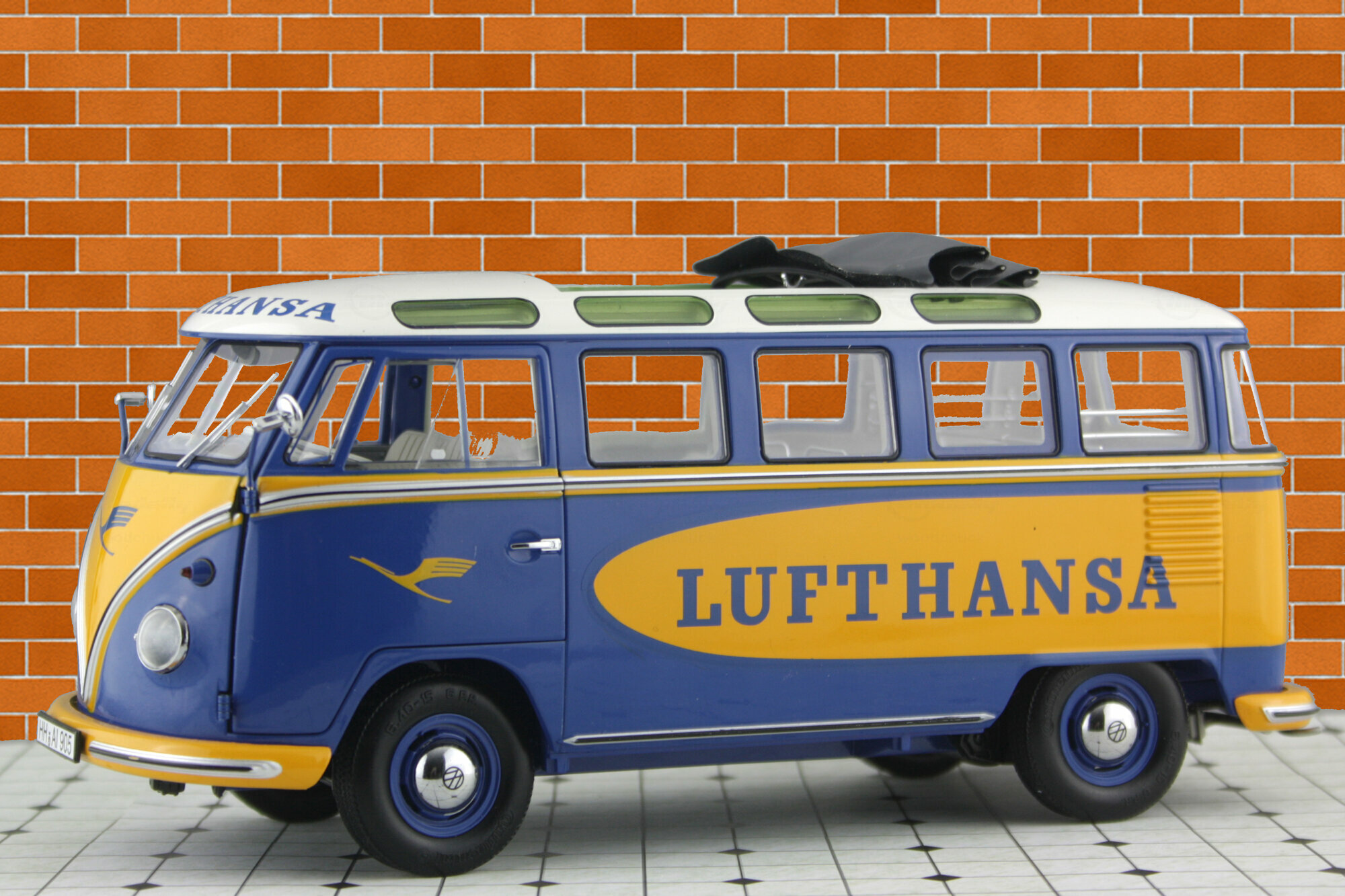 2013 brachte Schuco ein DieCast Modell des T1 Samba in verschiedenen Versionen heraus. Eine davon war ein Modell eines Lufthansa-Crew-Busses wie er damals auf deutschen Flughäfen zu sehen war. Das auf 1000 Stück limitierte Modell ist in den LH-Farben Weiß, Blau und Gelb lackiert. Die Seiten und die vordere Dachkante werden vom Schriftzug „Lufthansa“ geziert, die Türen und der Bug weisen das Kranichsymbol auf, wobei das VW Emblem an der Vorderseite entfällt. Die äußeren Details wie Zierleisten, Scheibenwischer, Spiegel und Scheinwerfer sind wie auch die gesamte Lackierung von sehr hoher Qualität. Eine Besonderheit ist ein funktionierendes Faltdach mit dem man jedoch vorsichtig umgehen sollte da die filigrane Konstruktion schnell zum Bruch neigt. Als Nachbildung der Stoffbespannung hat man eine dünne Kunststofffolie gewählt welche leider etwas „widerspenstig“ ist und weder im geschlossenen noch im offenen Zustand dem Original gleicht. Der Unterboden ist hervorragend gestaltet. Eine vollständige Ansicht der Motorenunterseite mit Auspuff, sehr detaillierte Achsen mit Bremsleitungen, detaillierter Rahmenboden und diverse hauchfeine Elektrokabel mit Darstellung der Hupe. Natürlich sind die gelungenen Räder vorn lenkbar. Neben dem Faltdach lassen sich die Vordertüren, die seitliche Doppeltür, die Heckklappe sowie die Motorraumklappe öffnen. Hinter Dieser finden wir eine sehr schön und detailliert gestalteten Motor dessen einzelne Komponenten farblich abgesetzt sind. Die Heckklappe gibt einen bis auf die Fenster- und Rückbankreling recht leeren „Kofferraum“ frei. Der innebereich ist randvoll mit Details angefüllt. Im Fahrerbereich findet man ein schönes Armaturenbrett, ein filigranes Lenkrad mit Lenksäule, Schalthebel und gut modellierte Sitze. Highlight sind hier die aufschiebbaren Seitenfenster und der Zündschlüssel mit Ersatzschlüssel im Zündschloss. Der Passagierbereich biete eine Ablagekonsole und Handgriff an der Wand zum Fahrerbreich, schön modellierte Sitze mit Haltegriffen, klappbare Rückenlehne an der Mittelsitzbank sowie Gummibodennachbildung. Auch sind die Dachfenster wie beim Original gelb eingefärbt. Der Maßstab wird sehr genau eingehalten. Das Modell ist seinen Preis von um die 150 € absolut wert, ist aktuell jedoch kaum noch zu bekommen.