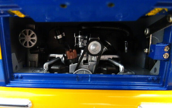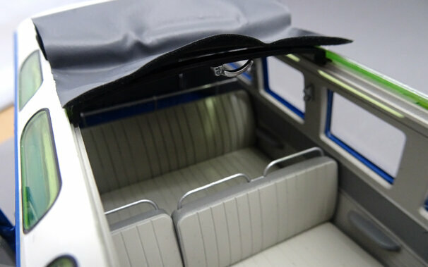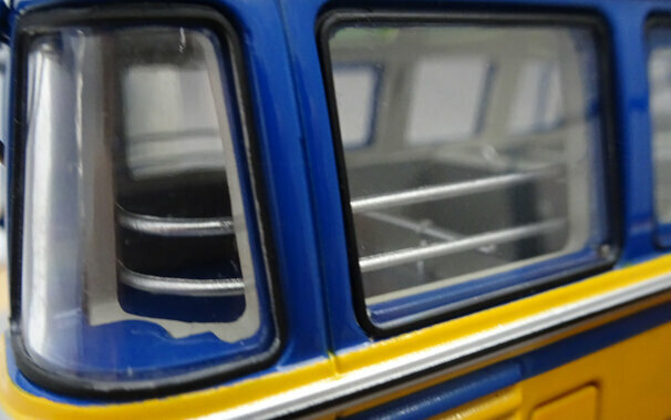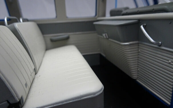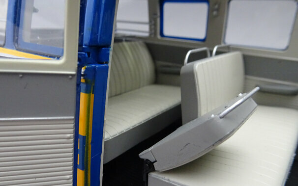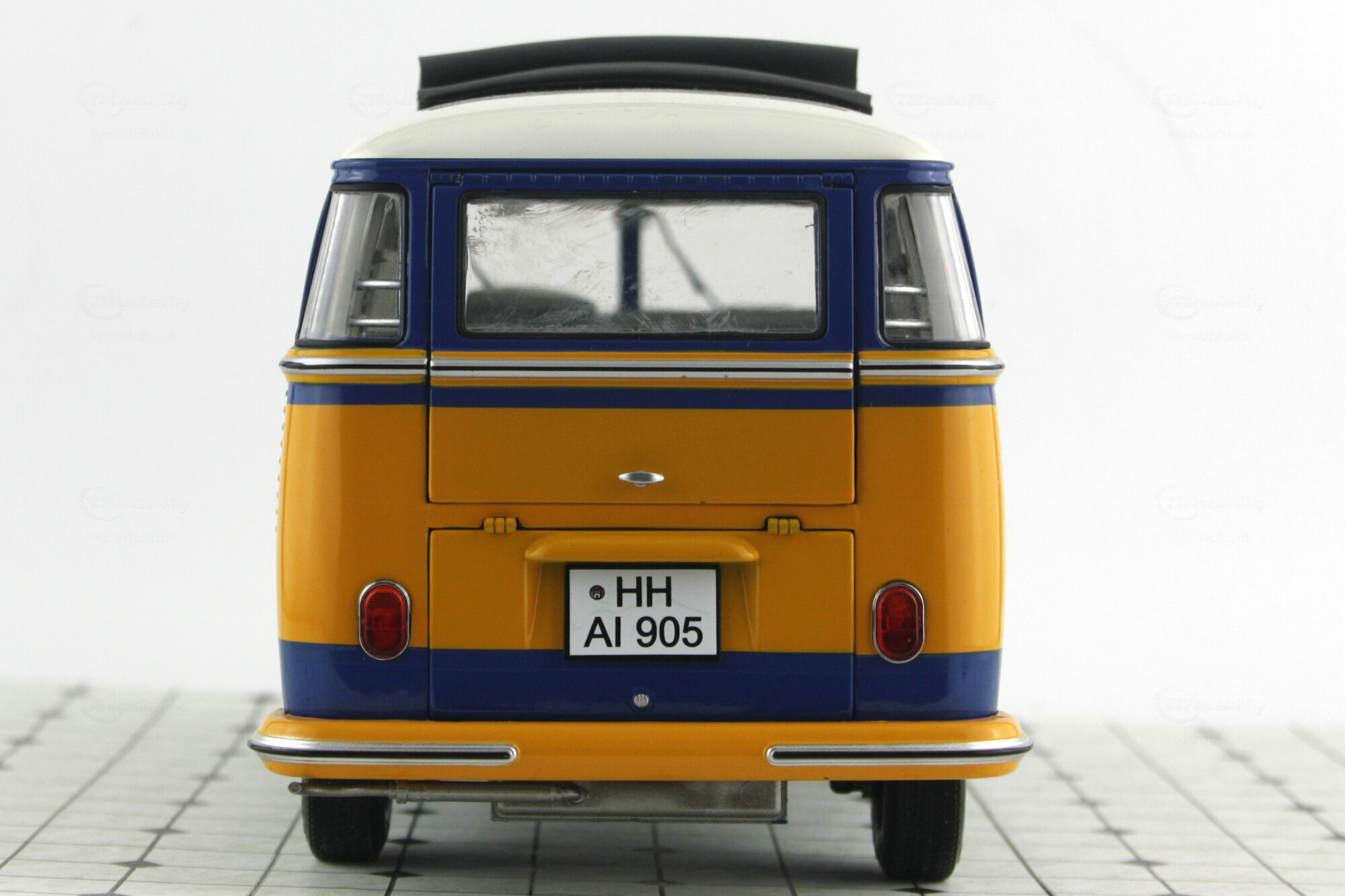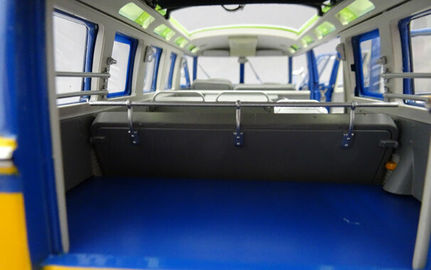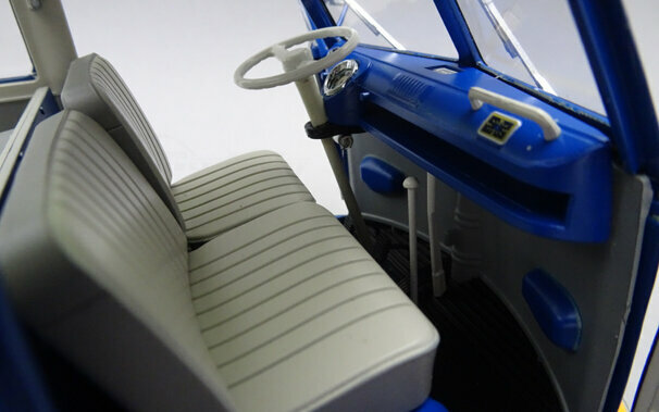 2013 brachte Schuco ein DieCast Modell des T1 Samba in verschiedenen Versionen heraus. Eine davon war ein Modell eines Lufthansa-Crew-Busses wie er damals auf deutschen Flughäfen zu sehen war. Das auf 1000 Stück limitierte Modell ist in den LH-Farben Weiß, Blau und Gelb lackiert. Die Seiten und die vordere Dachkante werden vom Schriftzug „Lufthansa“ geziert, die Türen und der Bug weisen das Kranichsymbol auf, wobei das VW Emblem an der Vorderseite entfällt. Die äußeren Details wie Zierleisten, Scheibenwischer, Spiegel und Scheinwerfer sind wie auch die gesamte Lackierung von sehr hoher Qualität. Eine Besonderheit ist ein funktionierendes Faltdach mit dem man jedoch vorsichtig umgehen sollte da die filigrane Konstruktion schnell zum Bruch neigt. Als Nachbildung der Stoffbespannung hat man eine dünne Kunststofffolie gewählt welche leider etwas „widerspenstig“ ist und weder im geschlossenen noch im offenen Zustand dem Original gleicht. Der Unterboden ist hervorragend gestaltet. Eine vollständige Ansicht der Motorenunterseite mit Auspuff, sehr detaillierte Achsen mit Bremsleitungen, detaillierter Rahmenboden und diverse hauchfeine Elektrokabel mit Darstellung der Hupe. Natürlich sind die gelungenen Räder vorn lenkbar. Neben dem Faltdach lassen sich die Vordertüren, die seitliche Doppeltür, die Heckklappe sowie die Motorraumklappe öffnen. Hinter Dieser finden wir eine sehr schön und detailliert gestalteten Motor dessen einzelne Komponenten farblich abgesetzt sind. Die Heckklappe gibt einen bis auf die Fenster- und Rückbankreling recht leeren „Kofferraum“ frei. Der innebereich ist randvoll mit Details angefüllt. Im Fahrerbereich findet man ein schönes Armaturenbrett, ein filigranes Lenkrad mit Lenksäule, Schalthebel und gut modellierte Sitze. Highlight sind hier die aufschiebbaren Seitenfenster und der Zündschlüssel mit Ersatzschlüssel im Zündschloss. Der Passagierbereich biete eine Ablagekonsole und Handgriff an der Wand zum Fahrerbreich, schön modellierte Sitze mit Haltegriffen, klappbare Rückenlehne an der Mittelsitzbank sowie Gummibodennachbildung. Auch sind die Dachfenster wie beim Original gelb eingefärbt. Der Maßstab wird sehr genau eingehalten. Das Modell ist seinen Preis von um die 150 € absolut wert, ist aktuell jedoch kaum noch zu bekommen.