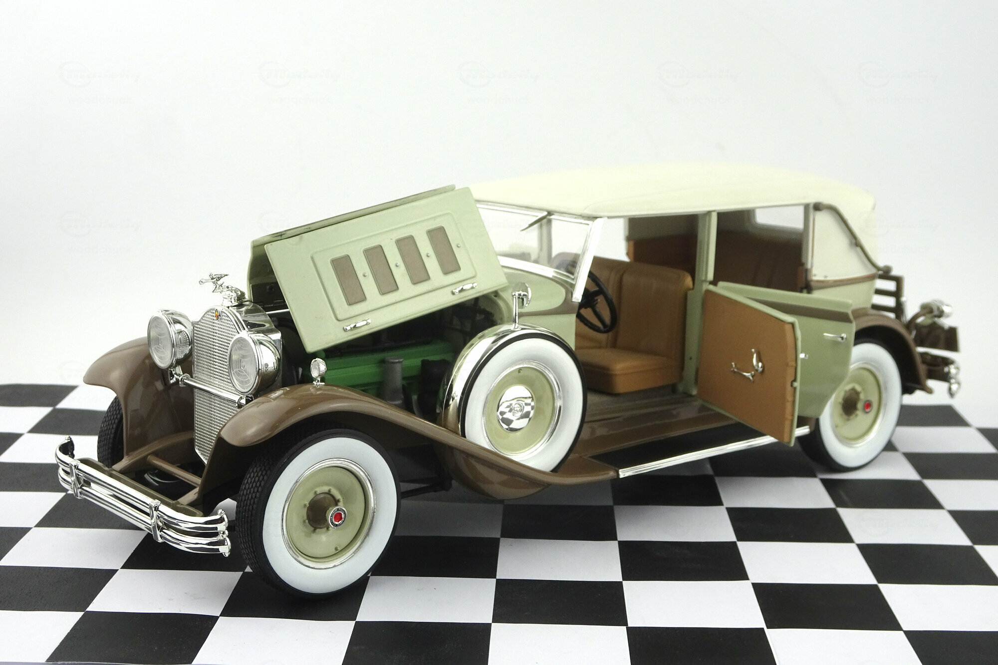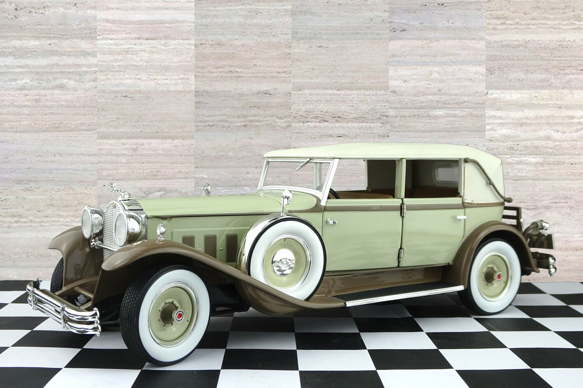 Signature Models brachte dieses Modell 2002 heraus, 2003 und 2005 folgten jeweils noch eine weitere Farbe. Das Modell verfügt über gut gearbeitete Spritzguss- und Kunststoffteile und eine saubere Lackierung. Motorhaube und alle 4 Türen lassen sich öffnen und ebenso lässt sich das Dach über dem Fahrerbereich abnehmen. Dieses erlaubt einen Blick in den Innenraum wie auch unter die Motorhaube. Dort finden wir einen schön detaillierten 8 Zylindermotor und auch im Innenbereich ist eine gute Detaillierung vorhanden welche leider den Luxus des Originals nicht vollständig nachbildet. Anders als der LeBaron, kommt der Brewster nicht auf Speichenrädern sondern auf polierten Stahlscheibenrädern daher. Der Maßstab wird sehr gut eingehalten. Obwohl das Modell auf viele Bauteile des LeBaron zurückgreift, hat man die anders angeschlagenen Türen dennoch berücksichtigt. Das Modell ist heute fast nur noch bei E-bay Anbieter in Ausland zu Preisen kaum unter 100,-- € zuzgl. Versandkosten zu bekommen.