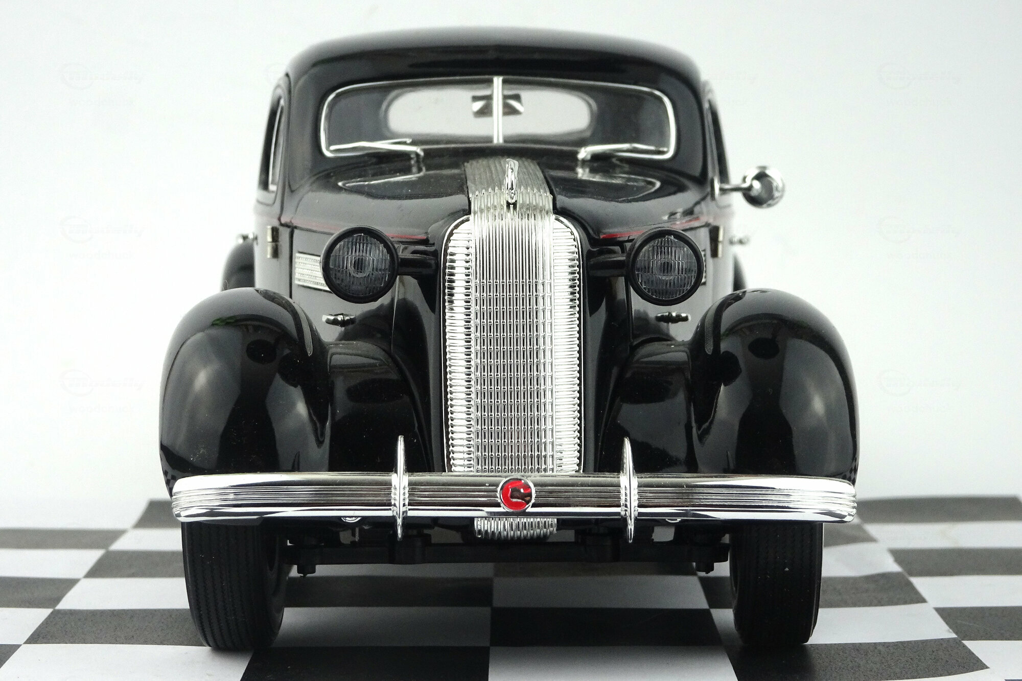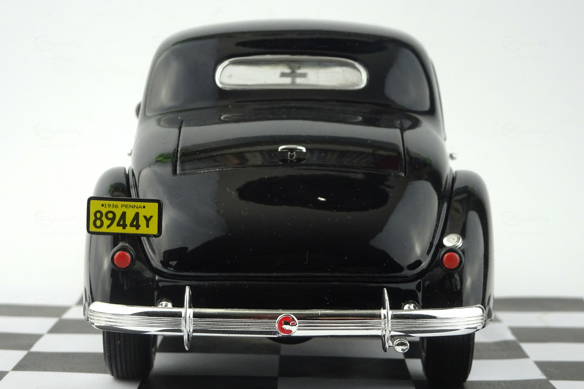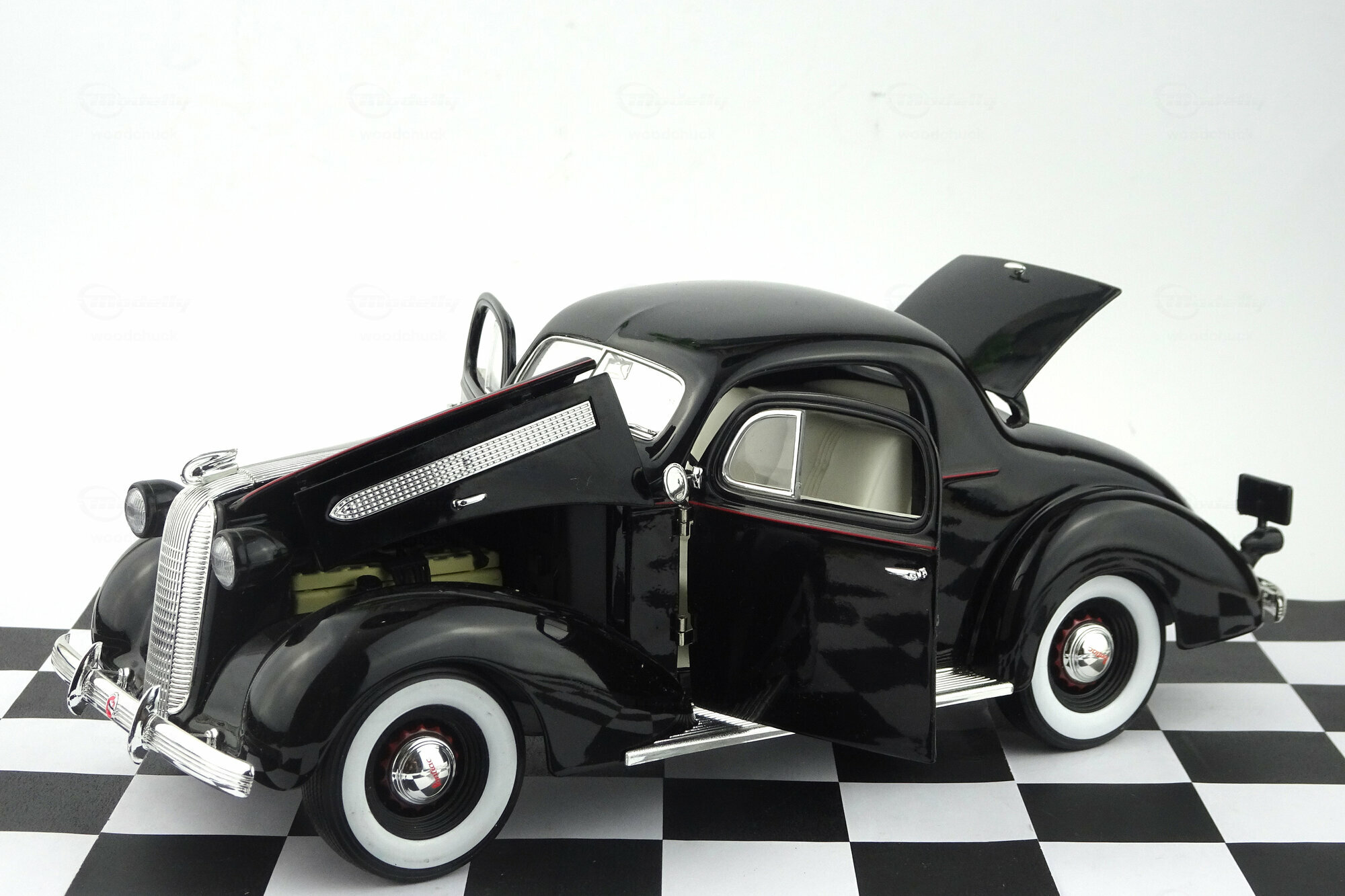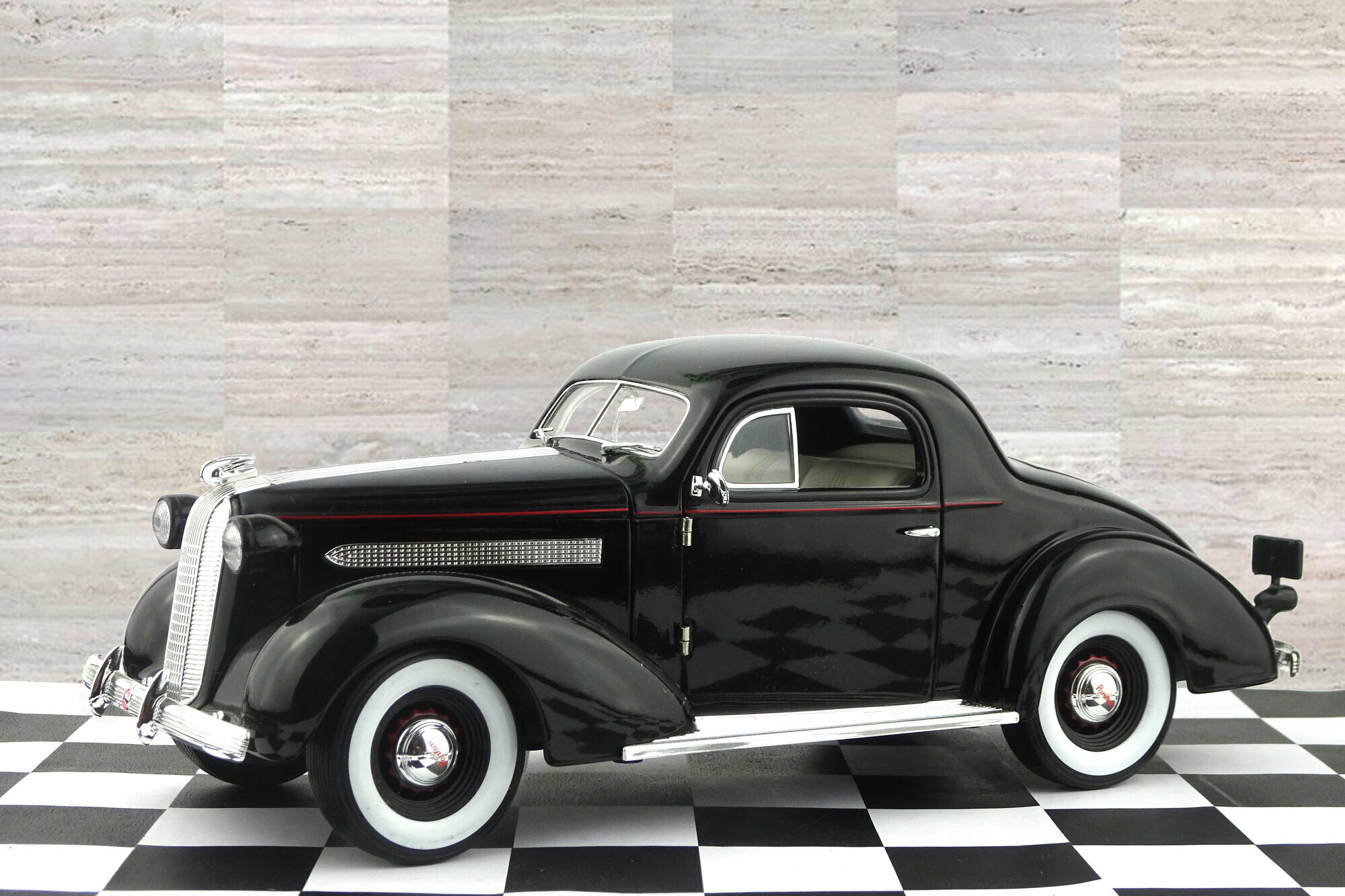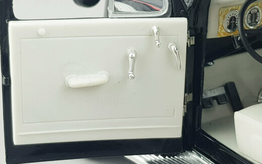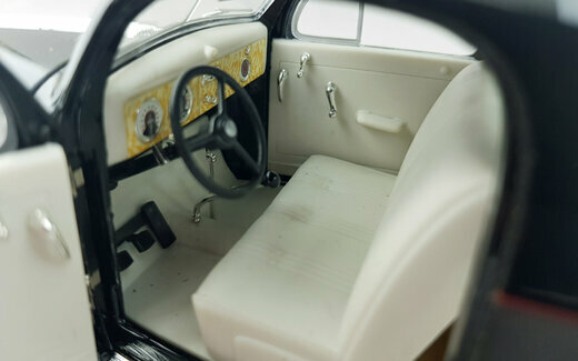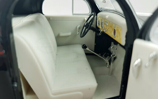 Der Pontiac DeLuxe Six Coupé erschien bei Signature Models 2003 in 3 Farben. Die Verarbeitung ist gut ausgeführt und die Lackierung sehr ordentlich. Bei der äußeren Detaillierung fallen besonders die feinen Chromeinfassungen der Fenster aus. Leider ist der „Silver-Streak“ Kühler für meine Begriffe etwas zu grob ausgefallen. Nach dem Öffnen der Motorhaube erscheint ein recht ordentlich detaillierter Motor und auch der Blick durch die geöffneten Türen in den Innenraum zeigt eine vollständige wenn auch teilweise einfache Ausstattung. Unter der Kofferraumklappe findet man eine leider völlig leeren Kofferraum. Leider ist das Modell ca. 1 cm zu kurz geraten. Das 2004 erschienene grüne Modell ist bei Händlern aktuell um die 60,-- € zu bekommen.