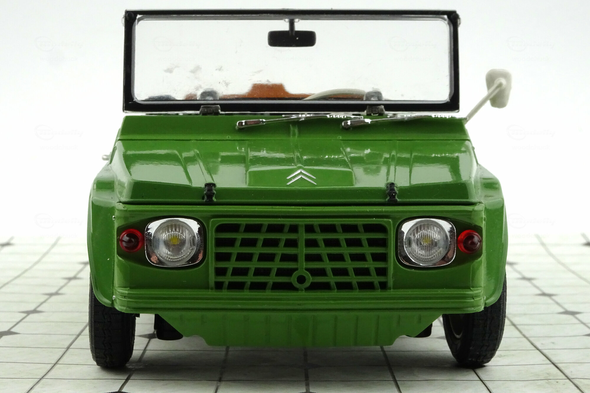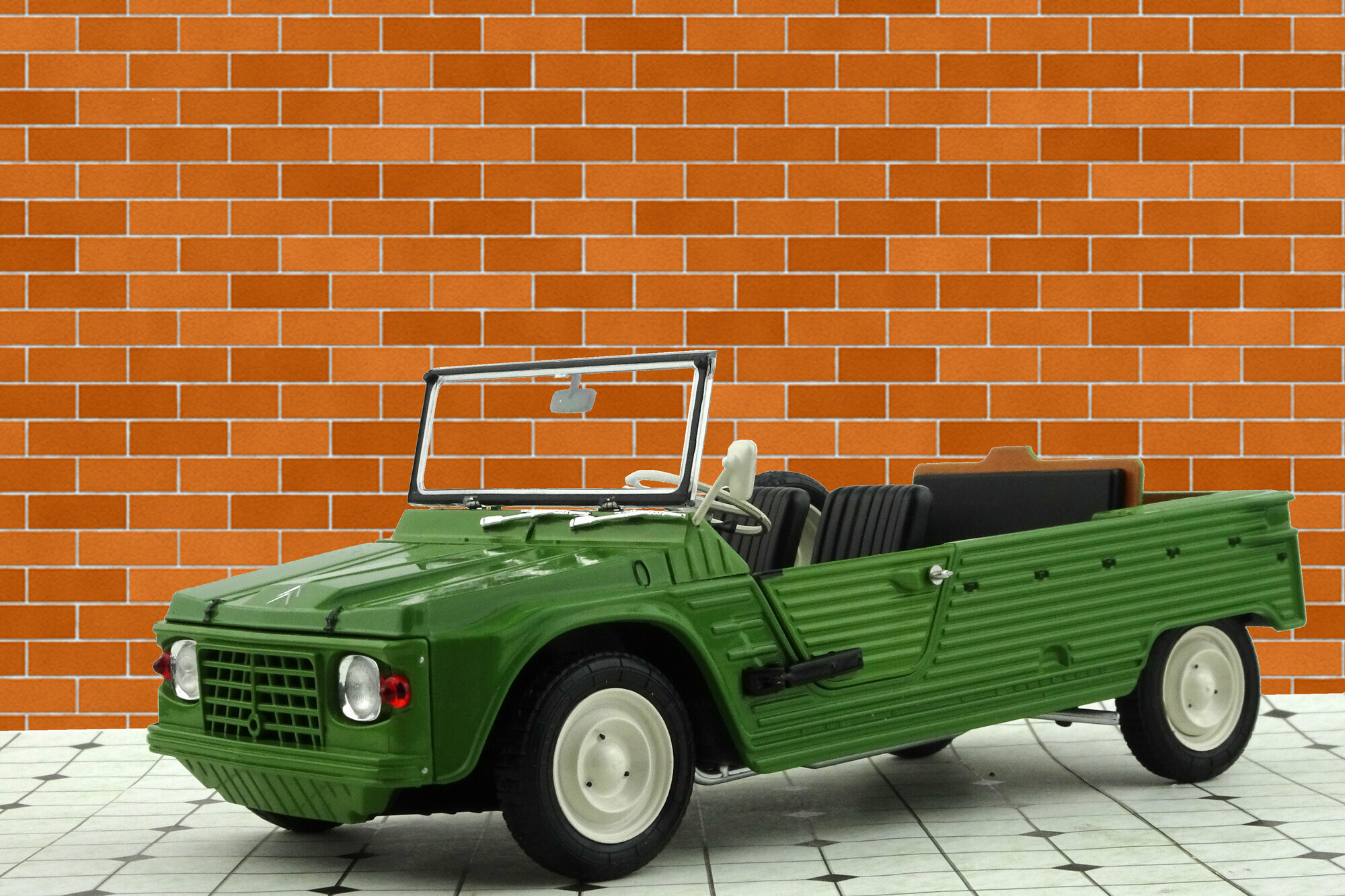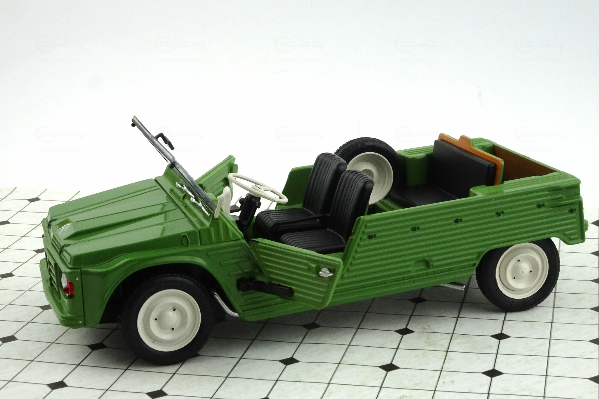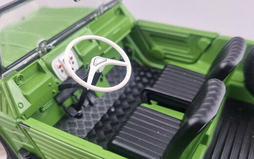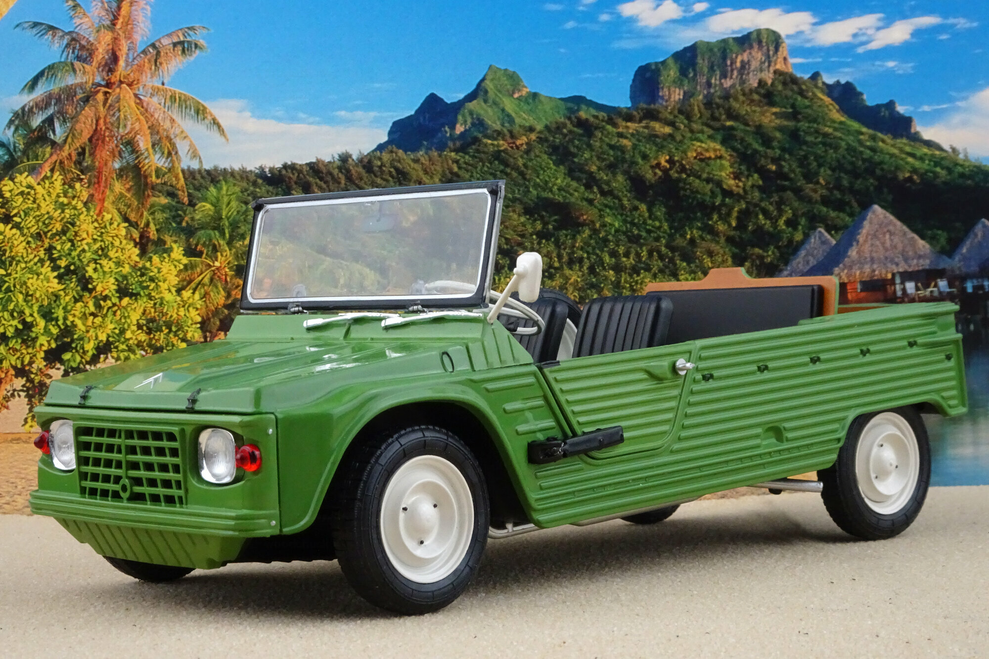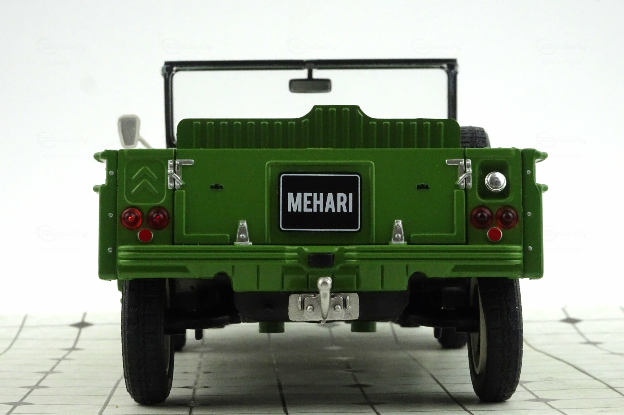Im November 2022 brachte Solido ein DieCast-Modell des Mehari von 1969 heraus. Es gab 2 Varianten: eine mit Dach in Orange lackiert und eine ohne Dach in Grün welche auch nachstehend beschrieben wird. Das Modell hat ein Chassis aus Metall, die Karosserie ist, wie beim Original, völlig aus Kunststoff. Die Verarbeitung ist wie auch die Lackierung ordentlich ausgeführt. Die wellblechartige Struktur der Seiten ist gut nachgebildet und auch die weiteren äußeren Details entsprechen einem guten Standard. Es lassen sich die beiden Türen öffnen, die Frontscheibe läßt sich leider nicht bis auf die Motorhaube herunterklappen. Im gut sichtbaren Innenraum fallen besonders das filigrane Lenkrad wie auch die Schalthebel und das riffelblech im vorderen Fußraum auf. Der Maßstab wird gut eingehalten. Ein schönes Modell dieses außergewöhnlichen Franzosen welche mit Preisen zwischen 40 € und 45 € durchaus preiswert ist. Es ist aktuell im Handel sowie im Netz erhältlich.