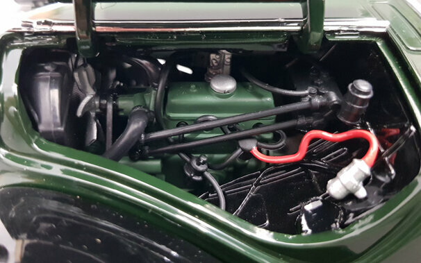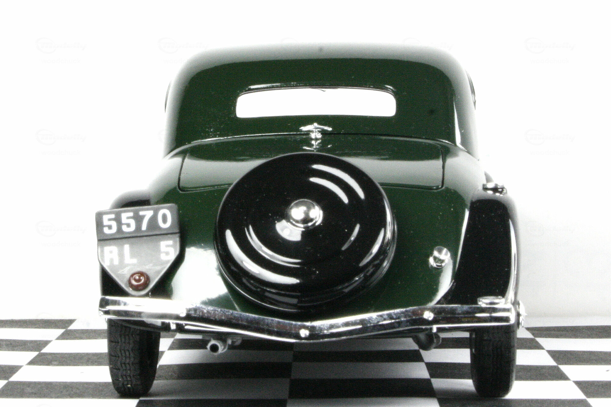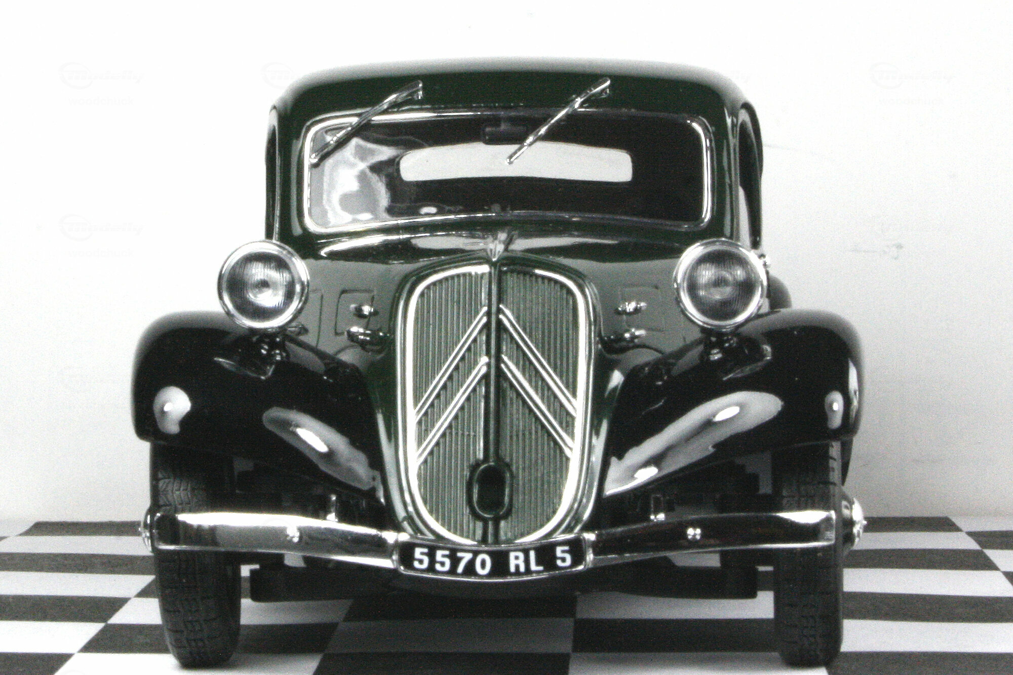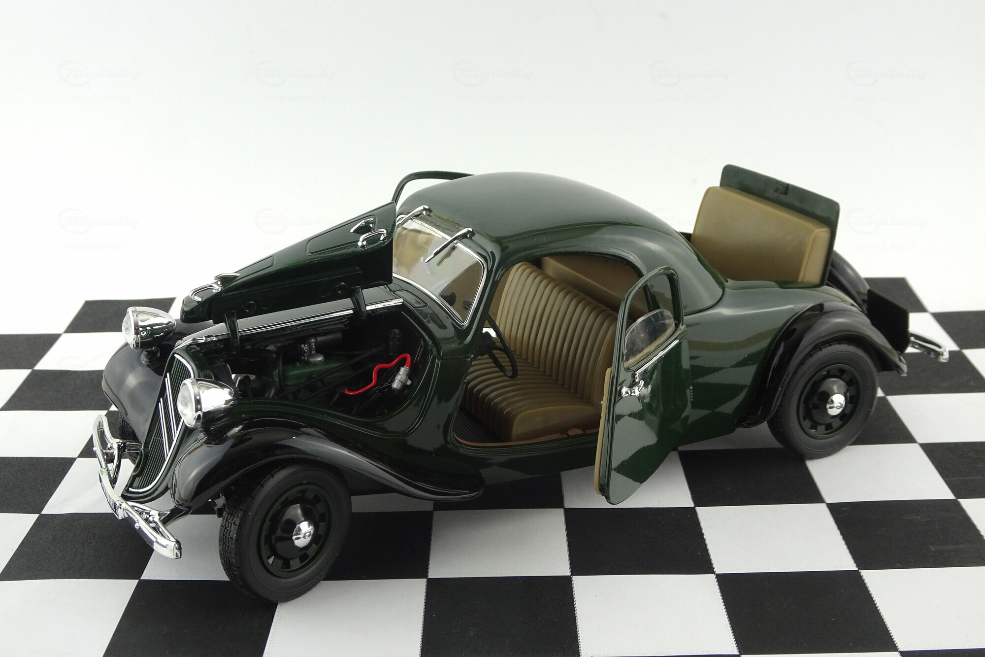 Als Citroen 1934 das Modell „ Traction Avant“ vorstellte, kam dies einer Revolution im Fahrzeugbau gleich. Hier wurden erstmals moderne Fahrzeugkomponenten wie eine selbsttragende Karosserie, Einzelradaufhängung mit Drehstabfederung, hydraulische Bremsen, Motor mit hängenden Ventilen und ein Frontantrieb in einem Auto vereinigt. Diese Kombination ergab ein extrem geräumiges Fahrzeug mit ausgezeichneten Fahreigenschaften und niedrigen Kosten. Citroen bot das Modell während der langen Fertigungszeit von 1934 – 1957 (mit Ausnahme der 5 Kriegsjahre 41-46) mit 3 Radständen und 5 Motorvarianten an. So kam es zu nicht weniger als 9 Grundmodellen die alle in verschiedenen Karosserievarianten erhältlich waren. Das Vorbild aus dieser unübersichtlichen Modellpalette war ein Typ 11 B „Faux Cabriolet“ eine Coupé Version die auch nur in geringen Stückzahlen gefertigt wurde. . Das Fahrzeug war 4,65 m lang, 1,79 m breit, 1,56 m hoch und brachte 1,1 t auf die Waage. Der 4-Zylinder Reihenmotor mit 2 l Hubraum leistete 46 PS und beschleunigte das Auto auf bis zu 120 km/h. Es sind wohl über 250.000 „Traction Avant“ gebaut worden, Andre‘ Citroen hatte sich hiermit jedoch finanziell übernommen und so wurde sein Unternehmen 1936, nur 1 Jahr nach seinem Tod, vom Michelin Konzern übernommen wo es bis 1974 verblieb.