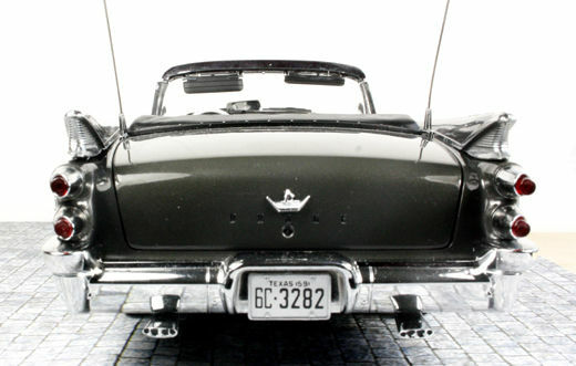 Das 1:18 Scale Modell, hergestellt von SunStar Platinum, zeichnet sich durch seine korrekte Lackierung in einem tiefen Schwarz aus, das perfekt in Szene gesetzt wurde. Das Fahrzeug weist aufwändige Details wie die Fahrertür, die sich öffnen lässt, und einen detailliert nachgebildeten Motorraum auf, der bei geöffnetem Hauben betrachtet werden kann. Der Innenraum ist in kontrastierenden Weiß- und Schwarztönen gehalten und harmoniert hervorragend mit der Lackierung. Die Fahrzeugsitze und das Lenkrad sind besonders detailreich gestaltet, was die Qualität dieses Modells unterstreicht. Die Rückansicht des Fahrzeugs zeigt die markanten Heckflossen und die elegant geformten Rückleuchten, die dieses Modell zu einem echten Hingucker machen. Ein besonderes Highlight stellen die originalgetreu nachgebildeten Felgen dar, deren Hersteller und Modell nicht genau identifiziert werden können, die aber dennoch zum Charme dieses Modells beitragen.