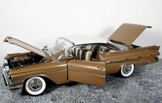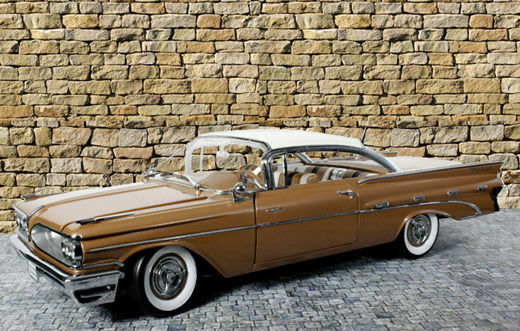 Der Pontiac Bonneville, der in diesem Modell widergespiegelt ist, war ein Klassiker der späten 1950er Jahre und gehört zur ersten Generation, die von 1957 bis 1960 gebaut wurde. Allgemein bekannt für seine eleganten Linien und modernen Designelemente, war der Pontiac Bonneville damals ein Symbol für Fortschritt und Luxus im Automobilbereich. Neben seiner optischen Attraktivität bot er beeindruckende technische Spezifikationen mit einem leistungsstarken V8-Motor und einer soliden Fahrwerkskonstruktion. Die Designer hinter diesem Fahrzeug waren vor allem Harley Earl und Bunkie Knudsen, die für ihre innovativen und visionären Designs bekannt sind. Als Nachfolger des Pontiac Star Chief, der bereits ein hohes Standards setzte, machte der Bonneville einen signifikanten Sprung in Bezug auf Luxus und Leistung.
