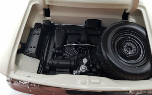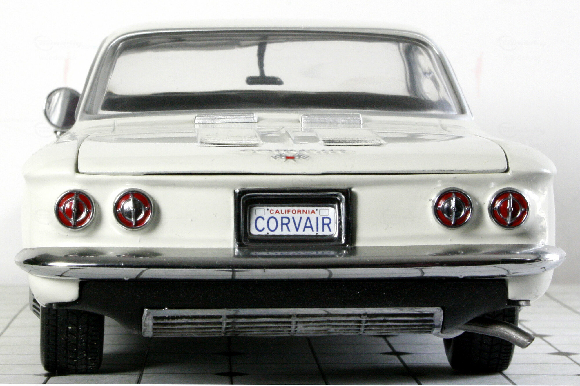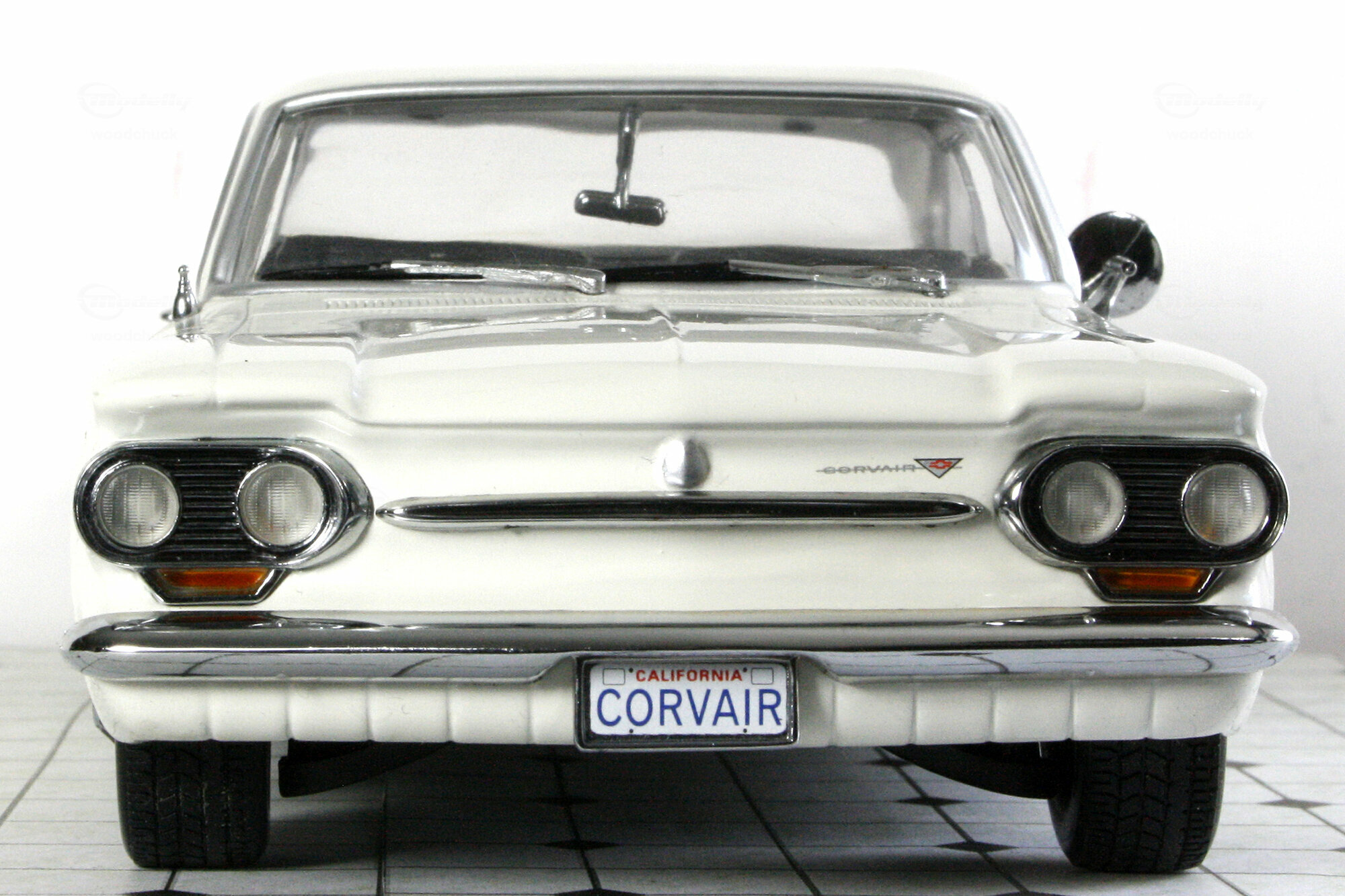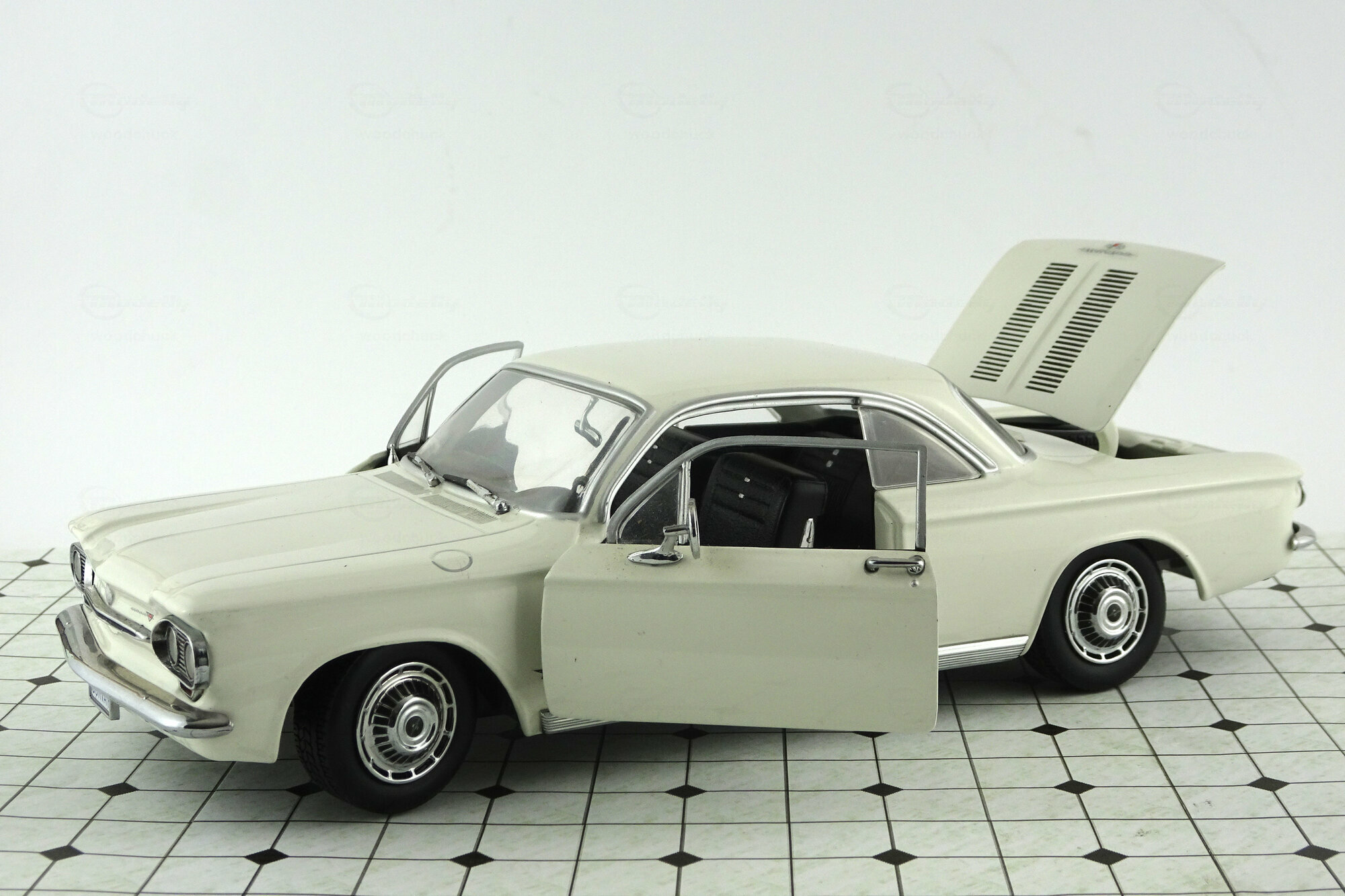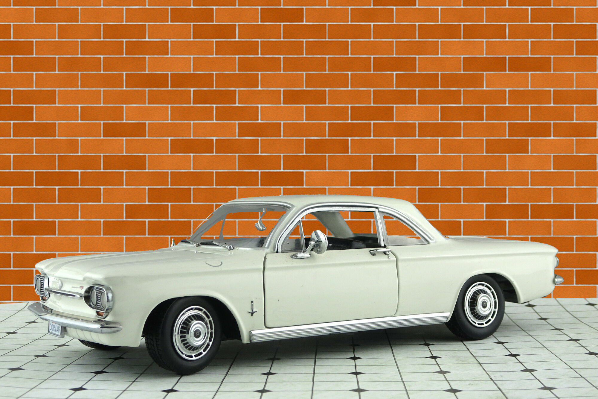 Im Jahre 2000 erschien bei Sun Star ein DieCast Modell des Corvair 900 Monza Club Coupé von 1963. Es lassen sich die Motorklappe sowie die Türen öffnen und die Vorderräder sind lenkbar. Die Metallkarosserie ist gut gearbeitet und mit einer ordentlichen Lackierung, in diesem Falle in Weiß, versehen. Leider fehlen Details wie die Zierstreifen entlang der Gürtellinie und der Seitenspiegel ist deutlich zu groß. Die Räder entsprechen zwar dem Original, wirken aber irgendwie „unecht“, Weiwandreifen wären hier sicher besser gewesen. Die Unterseite ist sehr einfach gestaltet. Ebenso geht es im Motorraum zu, eine schwarze, geprägte Motoroberseite mit kaum farblichen Nuancen sowie ein schwarzes Ersatzrad füllen diesen Bereich. Im Innenraum sieht es etwas besser aus, Hier wurden viele Details am Armaturenbrett und den Türverkleidungen farblich abgesetzt. Auch die klappbaren Sitze sind ordentlich modelliert. Was merkwürdig erschein, ist die Kombination aus einem Automatik-Pedalsatz und einem Schaltknüppel. Der Maßstab wird eingehalten und die Proportionen sind stimmig. Aktuell wird das Modell im Handel für knapp 75 € angeboten was für heutige Verhältnisse nicht hoch erscheint für die Modellqualität aber nicht angemessen ist.