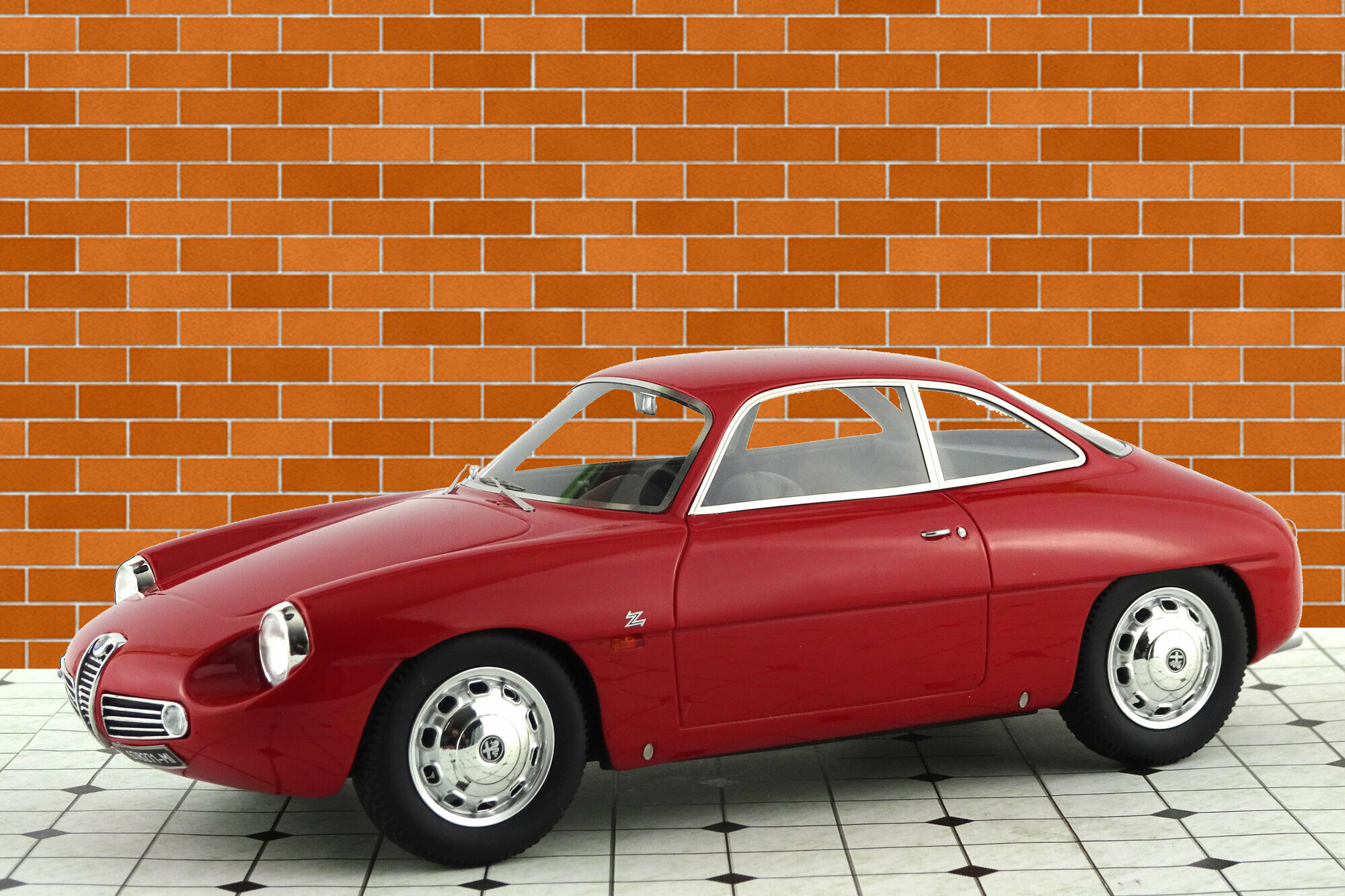 Der italienische Hersteller Technomodell brachte die Giulietta SZ im März 2017 als Resin Modell auf den Markt. Die Karosserie ist ausgezeichnet gearbeitet und mit einer hervorragenden Lackierung versehen. Alle Details sind sehr filigran und detailliert gestaltet was auch auf die Räder mit schönen Chrom-Radkappen und Alfa-Emblem zutrifft. Leider gibt es keine zu öffnenden Teile, keinen Motor und der Unterboden ist auch nur rudimentär dargestellt. Die Inneneinrichtung ist, soweit man sie durch die dünnen, glasklaren Scheiben sehen kann, ist wiederum sehr ordentlich und detailliert ausgeführt. Der Maßstab wird exakt eingehalten und auch die Proportionen sind absolut stimmig. Trotz der hochwertigen Ausführung und limitierter Auflage erachte ich einen Verkaufspreis von ca. 220 € als überzogen. Aktuell ist das Modell bei den meisten Händlern nicht mehr im Angebot und nur noch vereinzelt um die 250 € zu bekommen.