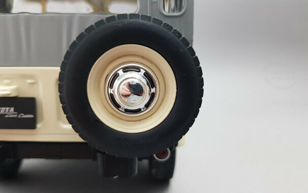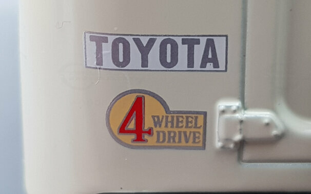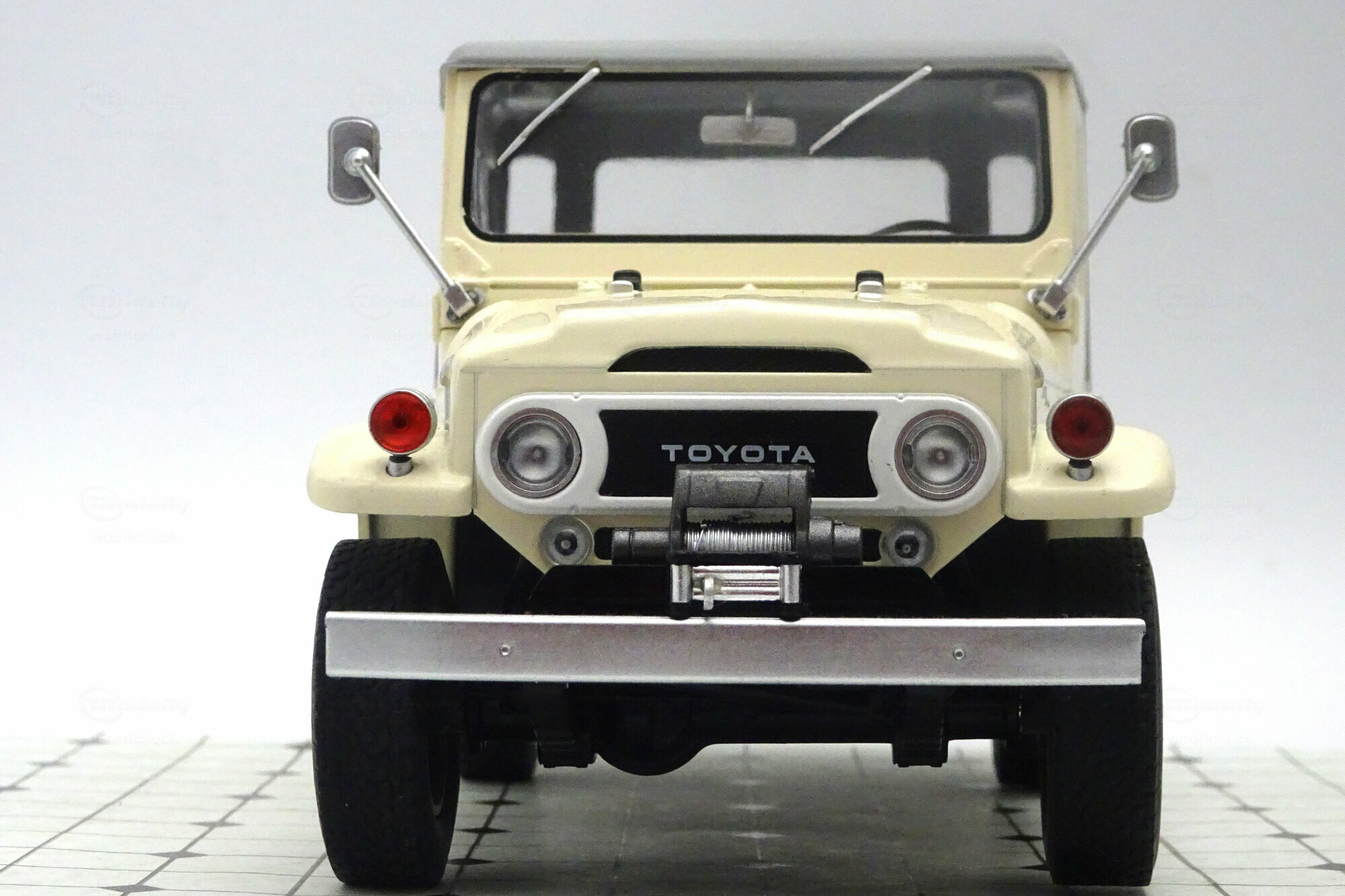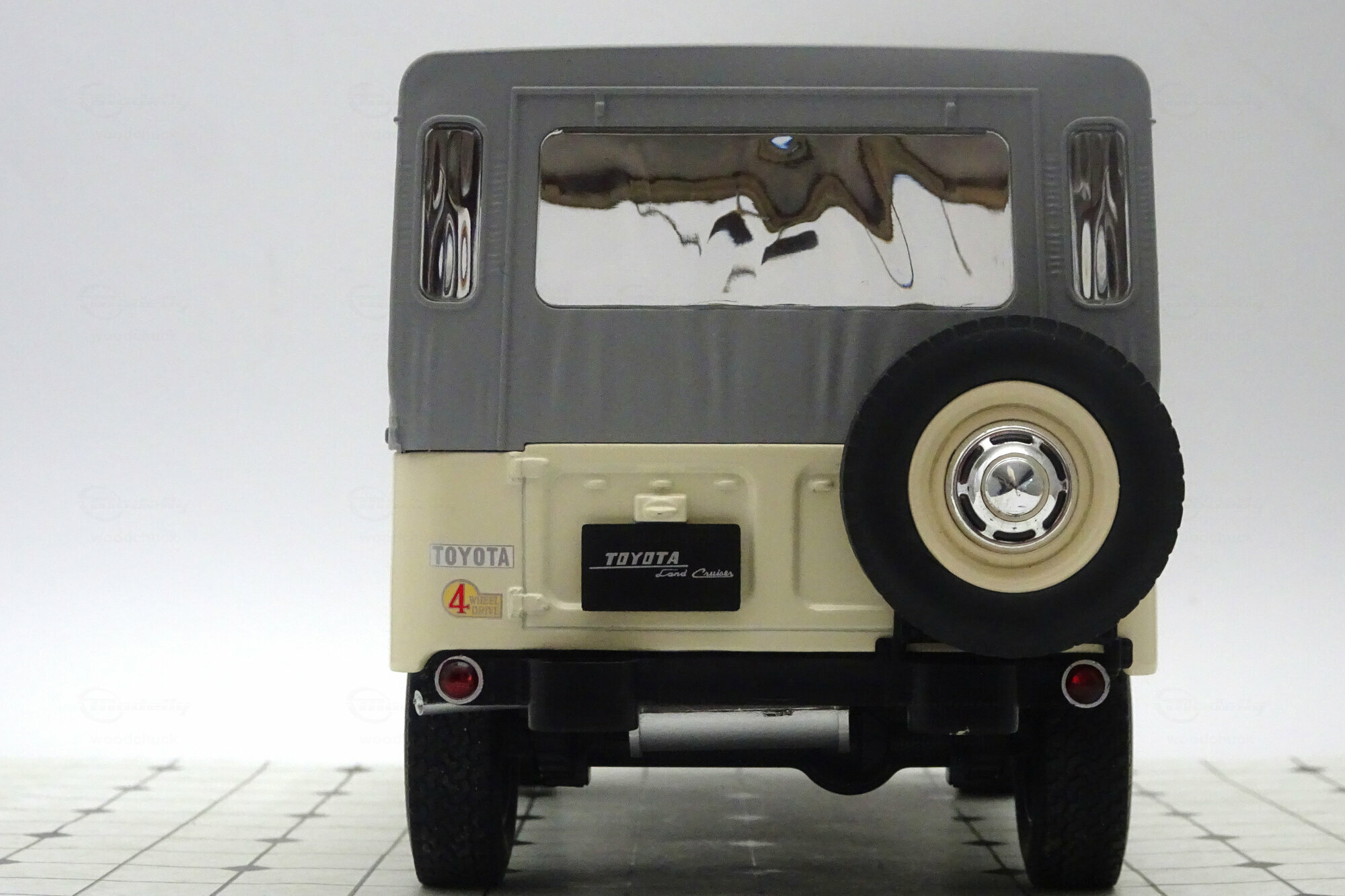 Im januar 2018 brachte Triple 9 ein DieCast Modell des FJ 40 von 1967 mit Softtop heraus. Das Modell hat eine gut verarbeitete in Elfenbein lackierte Metallkarosserie und ein hellgraues Dach aus Hartplastik. Die kantigen Formen des Originals sind gut getroffen und das Stoffverdeck ist für eine Plastiknachbildung recht gut gelungen, besonders da man berücksichtigt hat, dass die Fenster ebenfalls aus Folie bestehen und nicht faltenfrei sind. Die äußeren Details sind weitgehend zufriedenstellend, zu erwähnen sind die Seilwinde auf der vorderen Stoßstange und das Ersatzrad am Heck. Der Unterboden ist etwas mager, immerhin ist der Auspuff in voller Länge vorhanden und man kann erkennen, dass das Fahrzeug Allradantrieb hat. Eine Motornachbildung sowie lenkbare Vorderräder gibt’s es nicht. Es lassen sich auch nur die beiden Türen öffnen und das Verdeck ist ebenfalls nicht abnehmbar. Der Innenraum ist recht einfach aber vollständig nachgebildet und auch auf der Ladefläche findet man die beiden seitlichen Sitzbänke. Der Maßstab wird gut eingehalten. Das Modell wird aktuell in einer anderen Farbvariante zu einem Preis von ca. 70 € angeboten was durchaus angemessen ist.