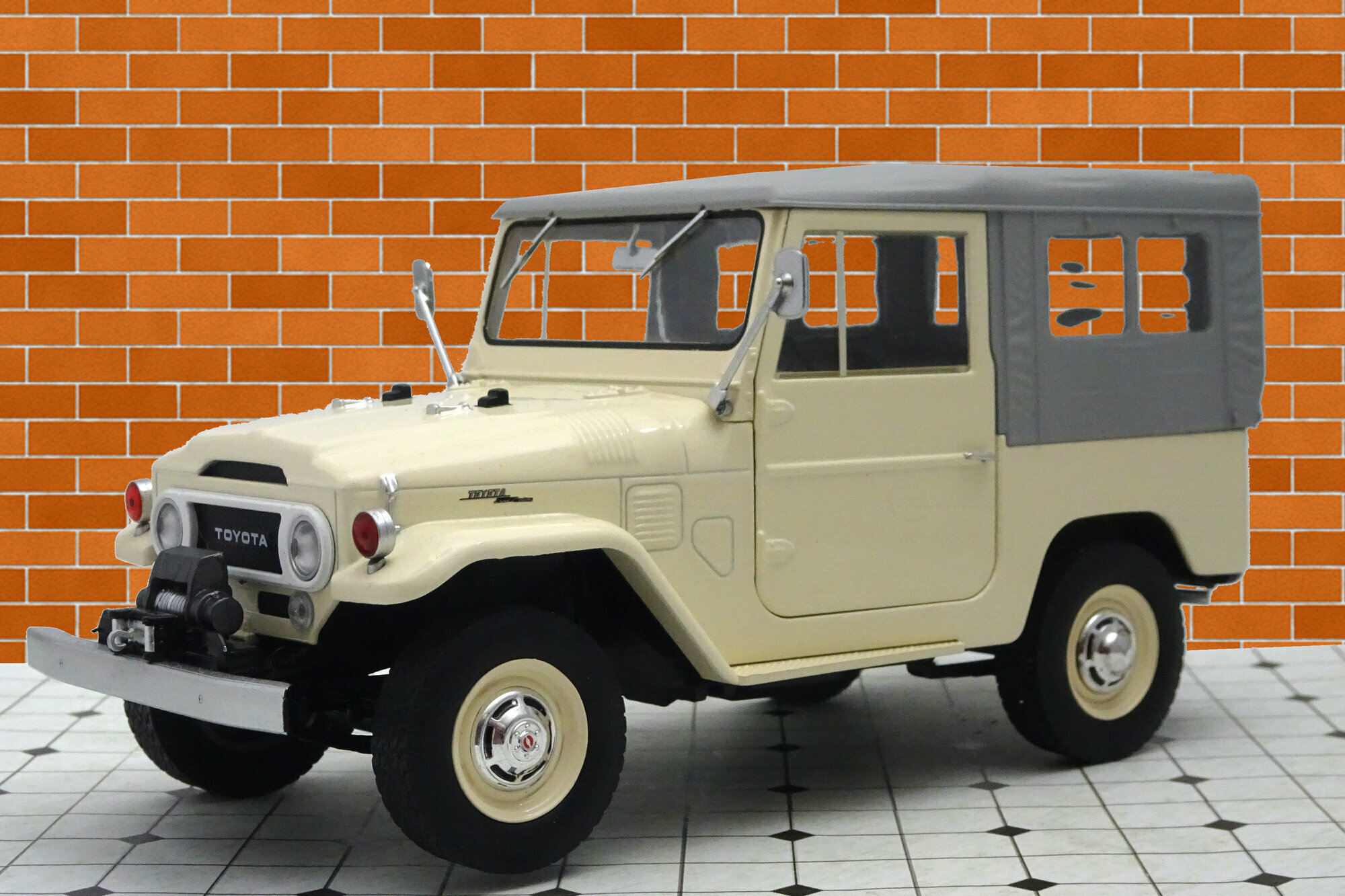 Aufgrund einer Militärausschreibung von 1950 entwickelte Toyota einen „BJ“ genannten Geländewagen der jedoch die Ausschreibung nicht gewann. 1954 wurde dieses Modell ziviler gestaltet und mit der Bezeichnung Land Cruiser auf den internationalen Märkten angeboten. Der Erfolg führte nach der ersten Serie J2 zur Entwicklung weitere Serien. So erschien 1960 die Serie J4 die in verschiedenen Karosserievarianten mit den Bezeichnungen J 40 bis J 47 angeboten wurden. Die Modelle gab es sowohl mit Benzin- (FJ) als auch mit Dieselmotoren (BJ) und hatten in der Regel Allradantrieb. Das Vorbild für das Modell ist ein FJ 40 von 1967 mit kurzem Radstand und abnehmbaren Stoffverdeck. Dies Modell hatte einen 6 Zylinder Reihenmotor mit 3,8 Liter Hubraum ein einer Leistung von 135 PS was auf der Straße für 120 km/h reichte. Mit 3,9 m Länge und 1,66 m Breite war der 1,5 t schwere FJ40 recht kompakt gebaut. Die Fahrzeuge wurden in verschiedenen Karosserievarianten bis 1979 fast 1 Million mal gebaut. Die Land Cruiser Serie wurde von Toyota konsequent weiterentwickelt und in immer neuen Versionen bis heute hergestellt und angeboten.