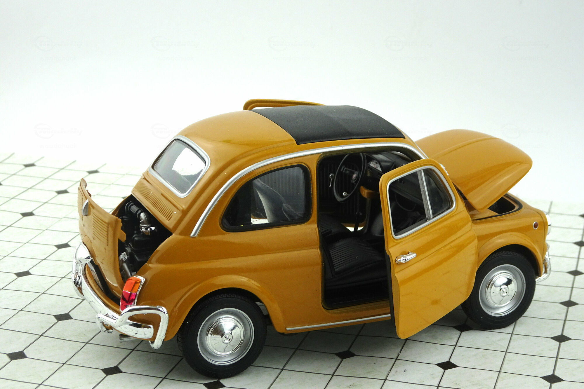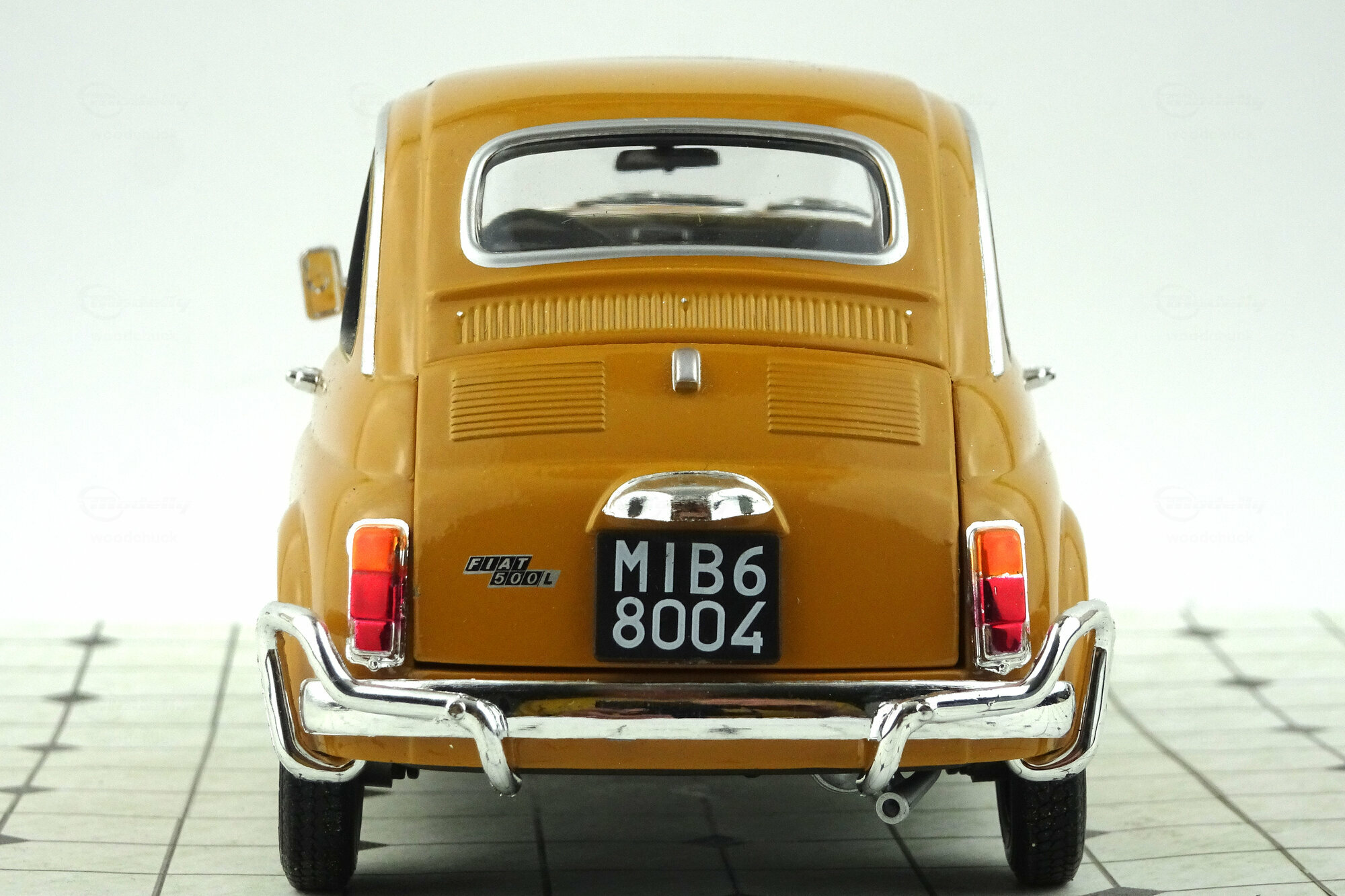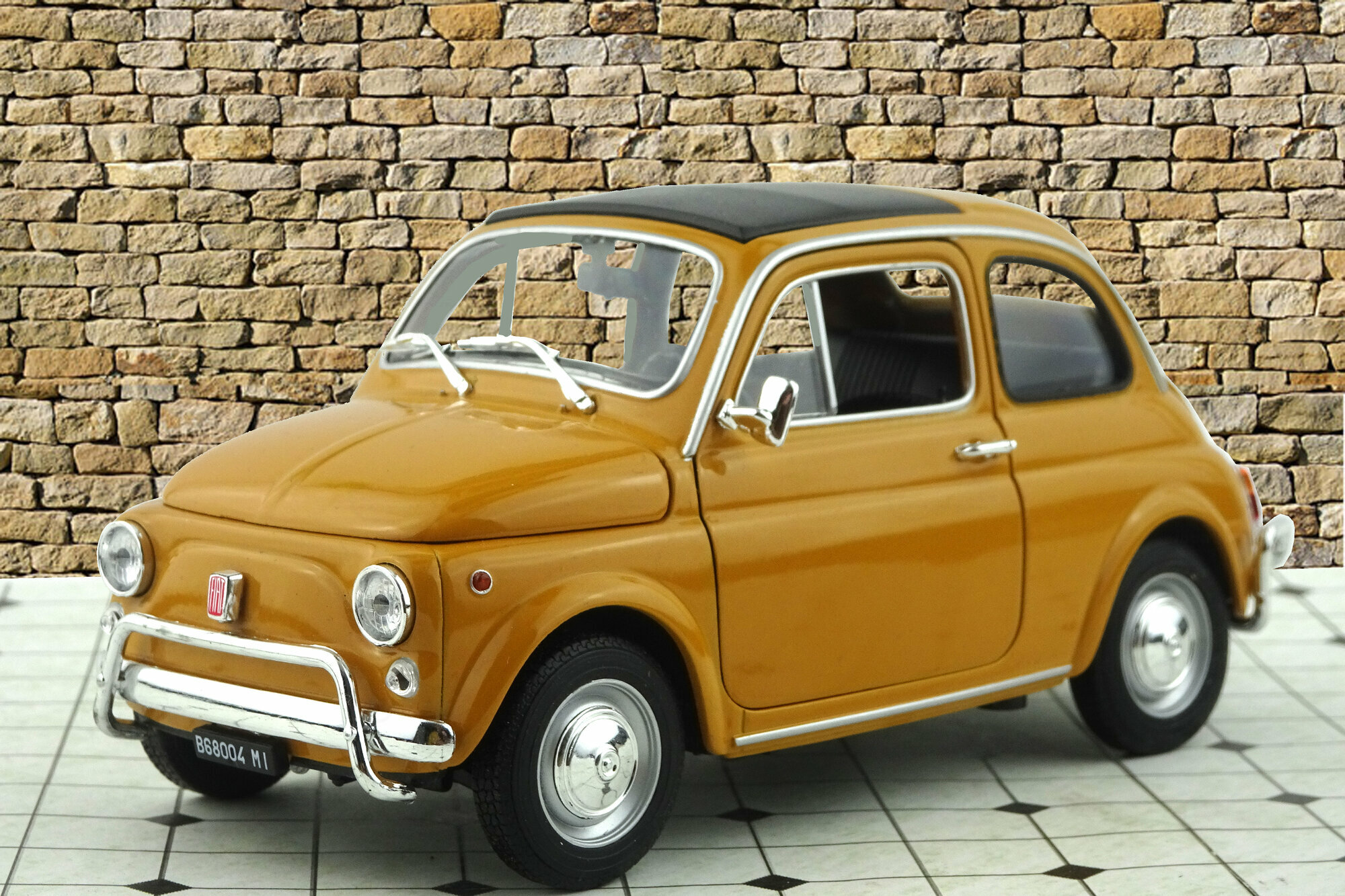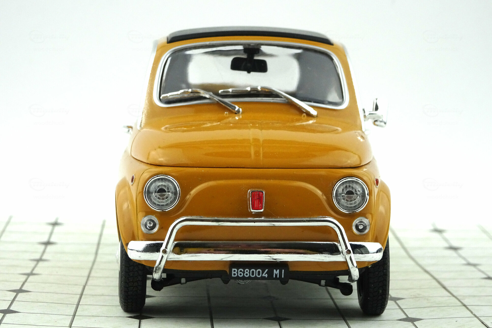 Das von Welly herausgebrachte DieCast-Modell des Nuova 500 wird als Version 1957, also Modell N, angegeben. Die vorn angeschlagenen Türen, die Blinker vorn und hinten, der breite Tacho sowie die Chrombügel an den Stoßstangen weisen es jedoch als Modell L von 1968 aus. Die Verarbeitung sowie die Lackierung sind ohne Tadel. Das „halbe“ Faltdach ist aus Kunststoff gefertigt. Alle äußeren Details sind im Wesentlichen vorhanden, nur teilweise, Chrombügel Fiat-Emblem, Scheibenwischer, sehr grob ausgeführt. Es lassen sich beide Türen, die hintere Motorklappe sowie der vordere Kofferraum öffnen. Dieser wird seinem Namen nicht gerecht das der gesamte Platz vom Tank und dem Ersatzrad eingenommen wird. Hinten findet sich ein gut detaillierter Motor der durch die geringe Öffnung der Motorklappe jedoch nur schwer zu sehen ist. Der Innenraum ist einfach aber ansprechend detailliert und zeigt alle wesentlichen Merkmale. Der Maßstab wird sehr genau eingehalten. Ein einfache aber grundsolides Modell des Nuova 500 L was jedoch allen die eine frühe Version erwartet hatten enttäuscht hat. Es ist teilweise noch im Handel wie auch im Netz um die 35 € erhältlich.