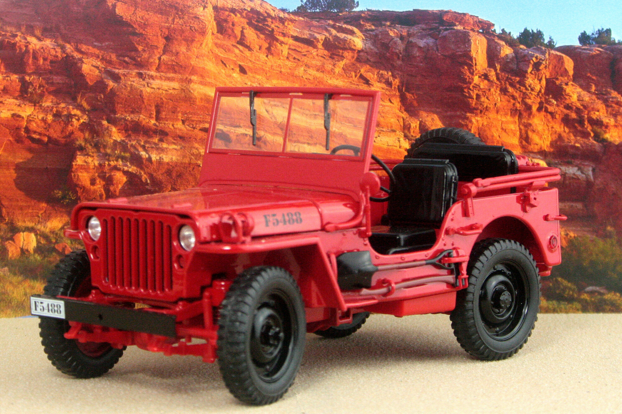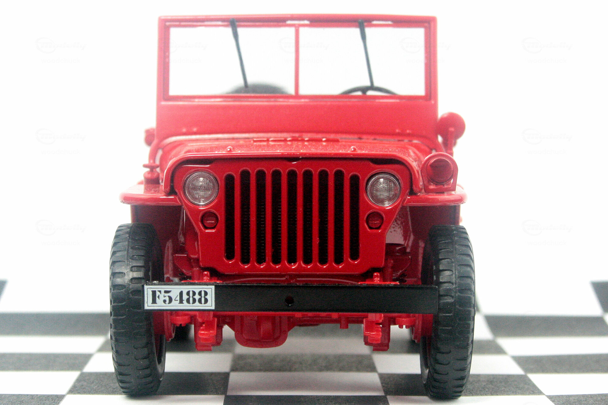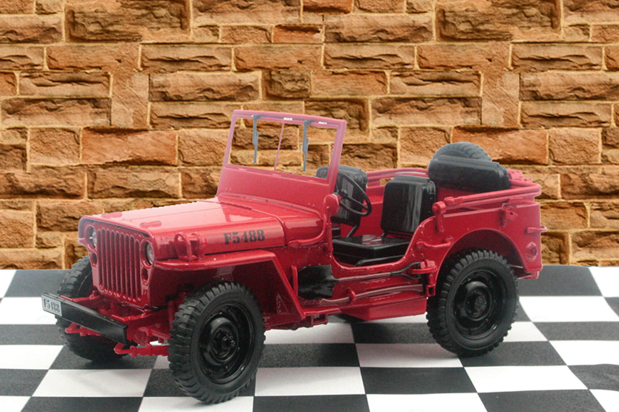 Welly brachte das Modell des Willys MB Jeep 2012 in verschiedenen Varianten auf den Markt. Die rote Version stell ein Feuerwehrfahrzeug dar. Das Modell hat eine Metall-Karosserie in guter Verarbeitung, leider ist die hochglänzende Lackierung etwas „wellig“ ausgefallen. Die Details sind sehr schön ausgeführt und in großer Zahl vorhanden. So findet man auf der Fahrerseite Schaufel und Axt, am Heck Reservekanister und Ersatzrad sowie die Anhänge Kupplung, Spriegel für ein Dach (was leider fehlt) sowie diverse Griffe und Halteösen überall am Fahrzeug. Auf der Unterseite findet man ein recht gut detailliertes Chassis mit dem Allradantrieb, leider einfarbig in Rot gehalten und mit vielen Kreuzschlitzschrauben versehen. Die Räder sind sehr gut gelungen. Die Motorhaube lässt sich öffnen, die Frontscheibe nach vorn klappen und die Spriegel hochstellen. Der Motor ist zufriedenstellend detailliert, verzichtet aber auf jegliche Verkabelung. Das Lenkrad wie auch die 3 Schalthebel sind sehr fein gearbeitet und auch das Armaturenbrett, überwiegend mit Abziehbildern dargestellt, mach einen guten Eindruck. Die Stahlrohrsitze sind gut nachgebildet, leider aber zu glänzend. Der Boden ist wie beim Original einfach gehalten, die Pedale sind aber leider nur als Prägung abgebildet. Der Maßstab wird absolut genau eingehalten und die Proportionen sind stimmig. Das rote Welly Modell findet man bei E-bay um die 50,-- €.