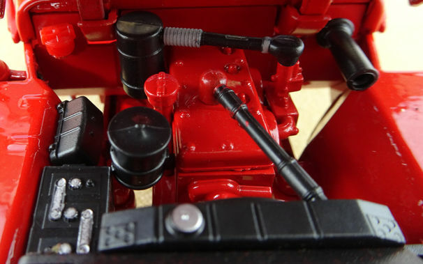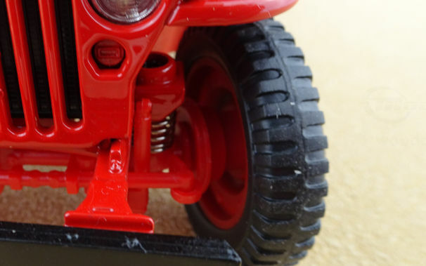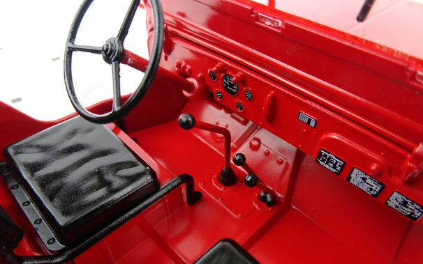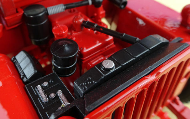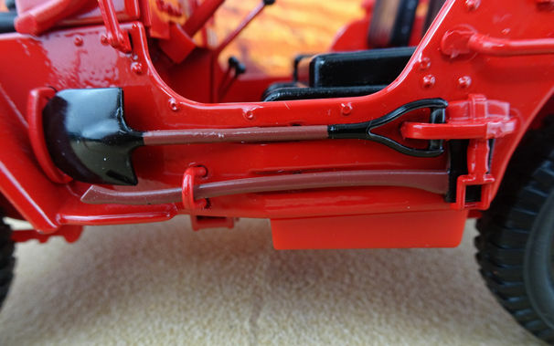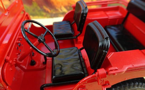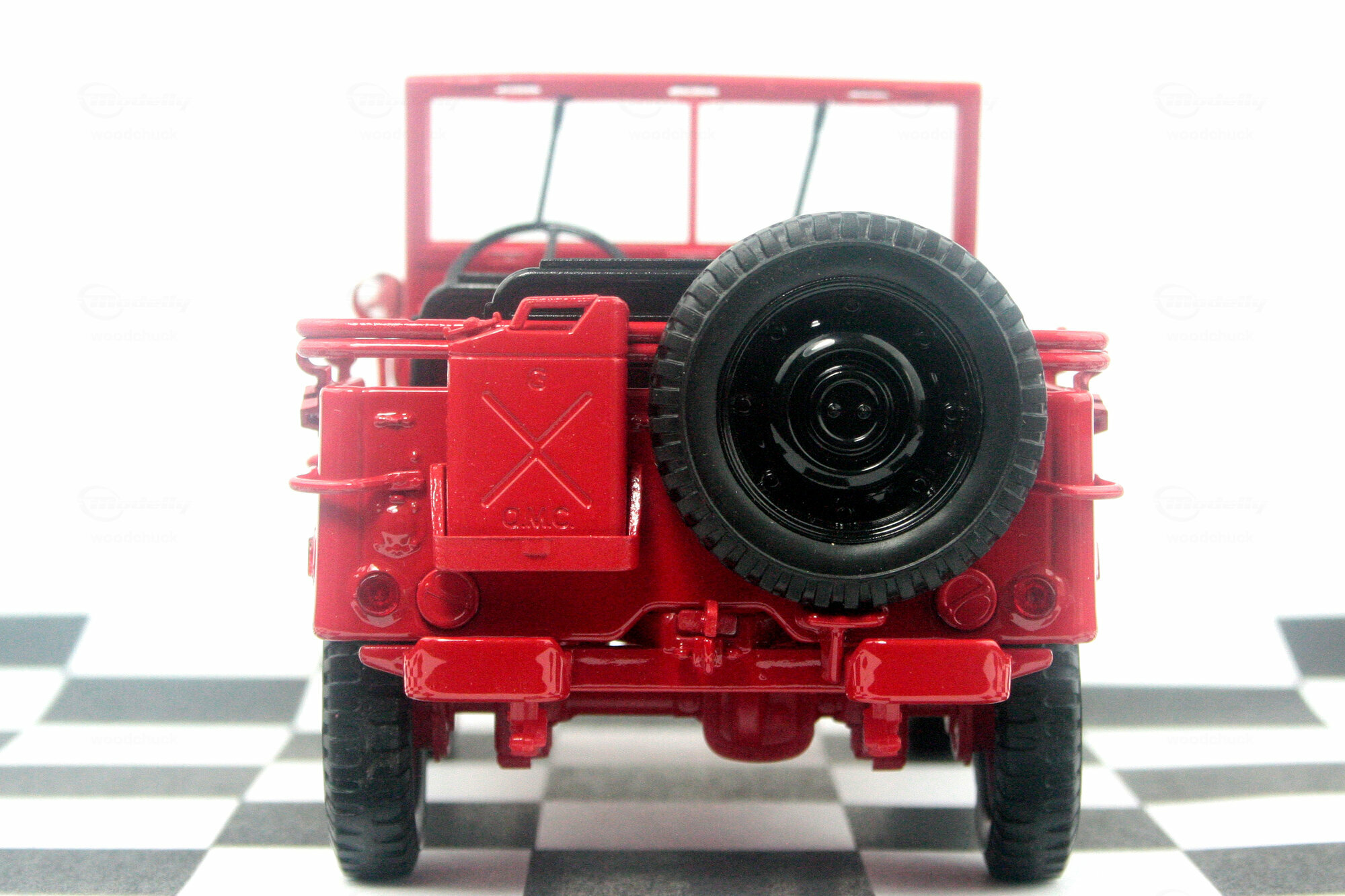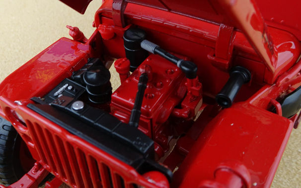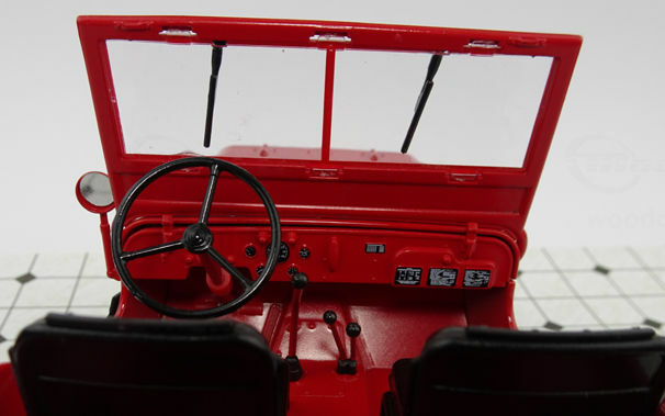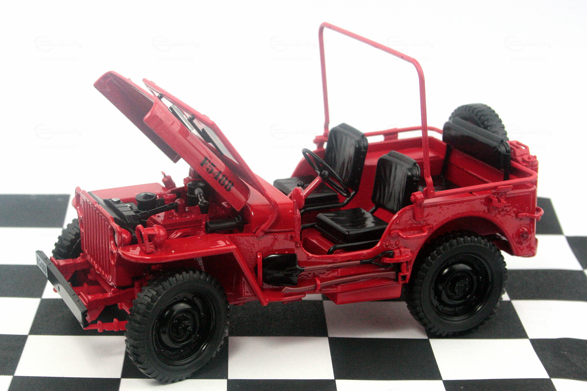 Welly brachte das Modell des Willys MB Jeep 2012 in verschiedenen Varianten auf den Markt. Die rote Version stell ein Feuerwehrfahrzeug dar. Das Modell hat eine Metall-Karosserie in guter Verarbeitung, leider ist die hochglänzende Lackierung etwas „wellig“ ausgefallen. Die Details sind sehr schön ausgeführt und in großer Zahl vorhanden. So findet man auf der Fahrerseite Schaufel und Axt, am Heck Reservekanister und Ersatzrad sowie die Anhänge Kupplung, Spriegel für ein Dach (was leider fehlt) sowie diverse Griffe und Halteösen überall am Fahrzeug. Auf der Unterseite findet man ein recht gut detailliertes Chassis mit dem Allradantrieb, leider einfarbig in Rot gehalten und mit vielen Kreuzschlitzschrauben versehen. Die Räder sind sehr gut gelungen. Die Motorhaube lässt sich öffnen, die Frontscheibe nach vorn klappen und die Spriegel hochstellen. Der Motor ist zufriedenstellend detailliert, verzichtet aber auf jegliche Verkabelung. Das Lenkrad wie auch die 3 Schalthebel sind sehr fein gearbeitet und auch das Armaturenbrett, überwiegend mit Abziehbildern dargestellt, mach einen guten Eindruck. Die Stahlrohrsitze sind gut nachgebildet, leider aber zu glänzend. Der Boden ist wie beim Original einfach gehalten, die Pedale sind aber leider nur als Prägung abgebildet. Der Maßstab wird absolut genau eingehalten und die Proportionen sind stimmig. Das rote Welly Modell findet man bei E-bay um die 50,-- €.