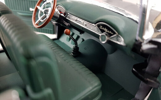Zum ersten Male wurde der Name BelAir von Chevrolet 1950 für die zweitürigen Hardtops der Modellreihe DeLuxe verwendet. Erst ab 1953 wurde der BelAir zur Premium-Modellreihe oberhalb der 150 und 210 Serien die jedoch das gleiche Karosseriedesign hatten. Als Motoren standen Sechszylinder-Reihenmotoren mit 3,5 und 4 Litern Hubraum der Typen Thriftmaster und Blue Flame zur Verfügung. Es gab 2 und 4türigr Limousinen, Cabriolets sowie Coupés und ab 1954 eine Kombiversion. 1955 erhielten die Modelle ein komplett neues Styling und es wurden optional V8 Motoren angeboten. Für 1956 gab es ein Facelift bei welchem der „Ferrari-Grill“ einem über die volle Wagenbreite verlaufenden wich und die Heckflossen deutlich herausgearbeitet waren. Die Modelle waren nun 5 m lang, 1,9 m breit und brachten 1,5 Tonnen auf die Waage. Mit einem 6 Zylinder Blue Flame mit 142 PS Leistung erreichte das Fahrzeug 146 km/h Höchstgeschwindigkeit. Der 4,3 Liter V8 Small Bloch brachte es auf 160 km/h. Auffällig bei den Modellen 55 und 56 war eine, einem futuristischen Jetflugzeug nachempfundene Kühlerfigur. Das nochmals überarbeitete Modell von 1957 wurde dann zu einem der bekanntesten amerikanischen Autos. Der BelAir wurde in insgesamt 7 Generationen bis 1975 hergestellt. Im Modelljahr 1956 wurden 130.778 Hardtop-Coupés und 41.883 Convertible ausgeliefert.