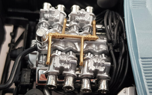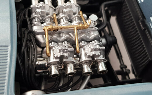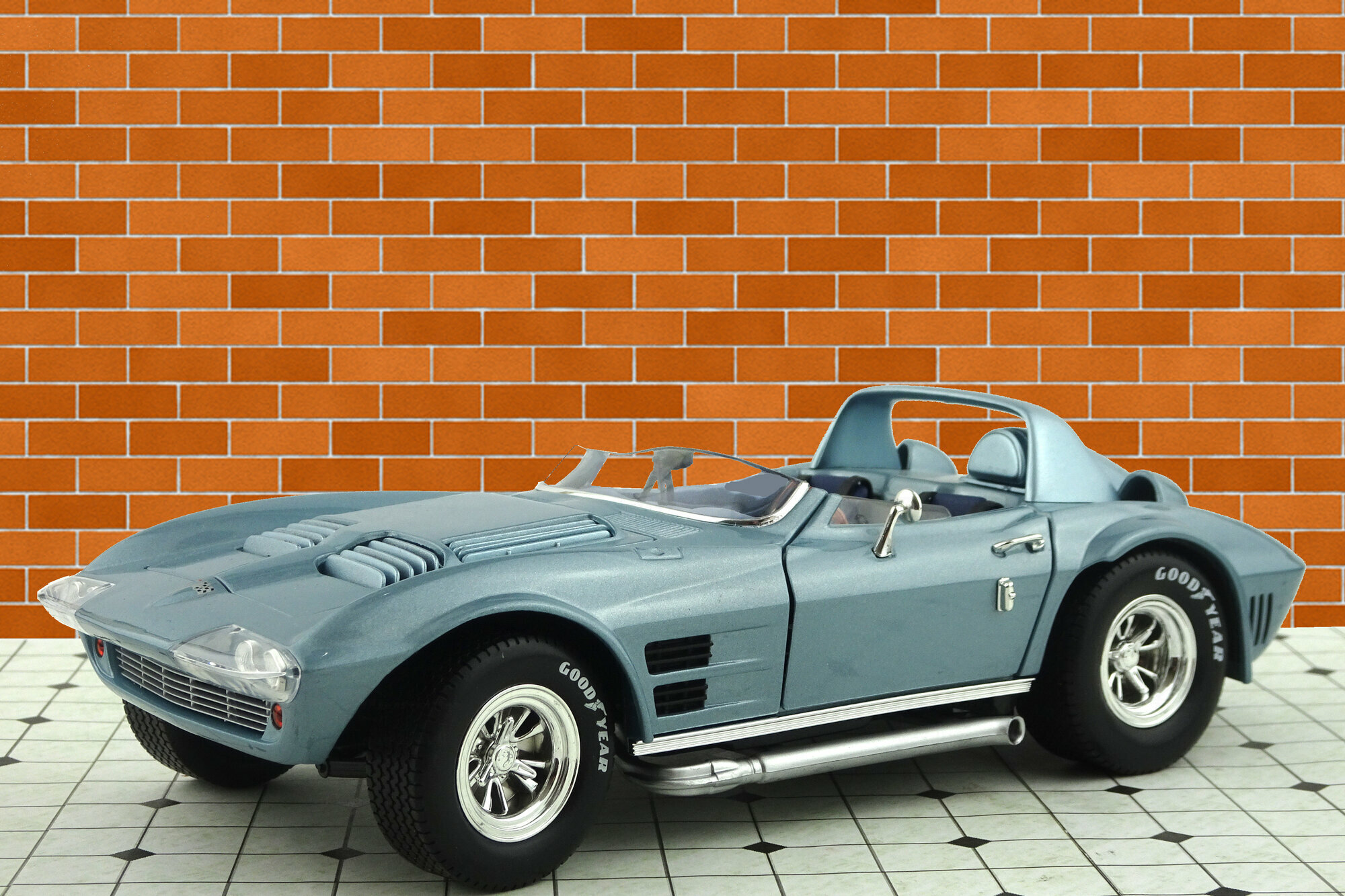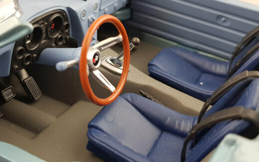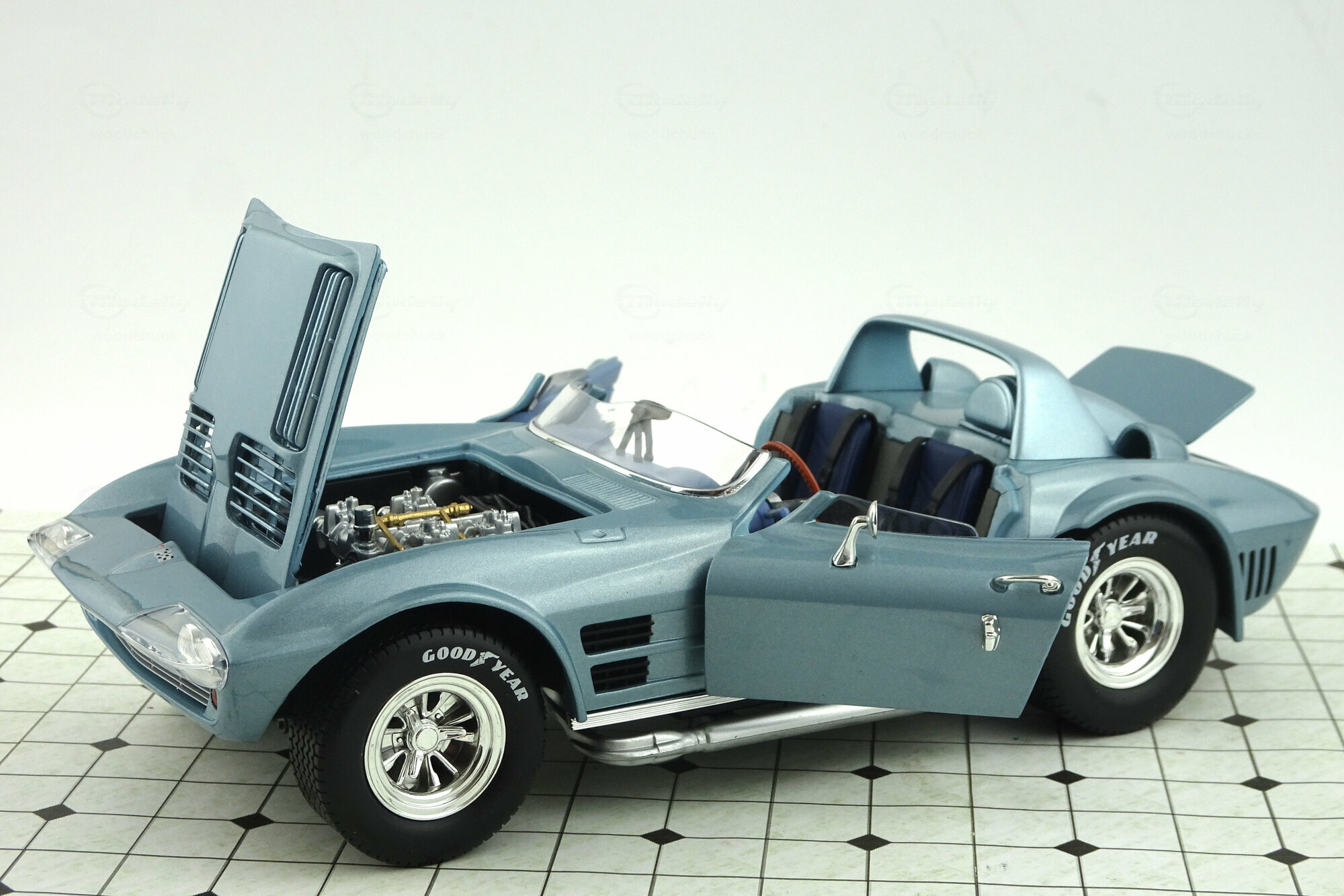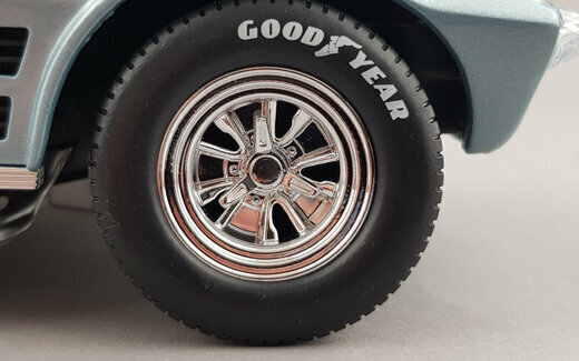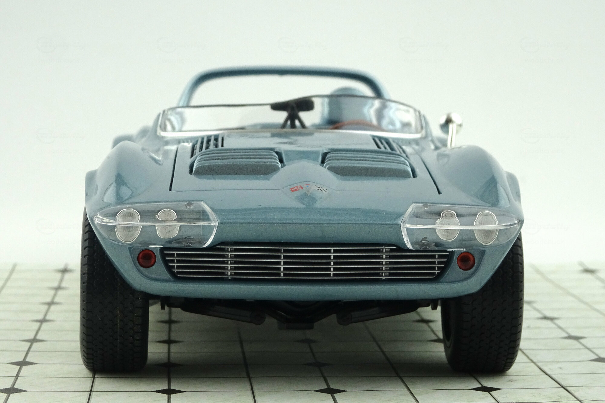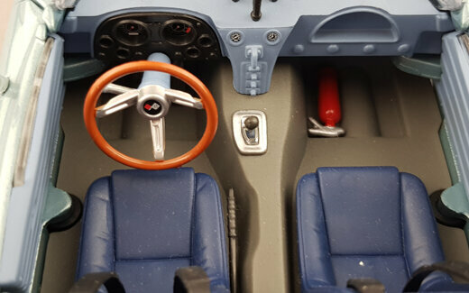 Von Yatming erschien 2006 in der Road Signature Serie ein DieCast Modell des Grand Sport Roadster von 1964. Das Modell erschien in mehreren Farben, so auch mit einer hellblauen Metalliclackierung. Das Vorbild wurde so auf dem Amelia Island Concours gezeigt und als Chassis #002 angegeben. Die Verarbeitung und Lackierung sind ohne Tadel und das Original wird im Wesentlichen gut wiedergegeben. Die äußeren Details sind einfach aber sauber ausgeführt. Recht gut sind die Ansauggitter in der Motorhaube sowie des Kühlergrill geraten. Die Räder entsprechen dem Vorbild. Es lassen sich beide Türen, die Motorhaube und der „Kofferraum“ öffnen. Dieser hat keinen Boden und beherbergt lediglich ein Reserverad welches sicherlich in keinem Rennwagen zu finden sein wird. Unter der Haube befindet sich ein recht ordentlich detaillierter Motor mit sehr schön gestalteten Vergaserpaketen. Der Innenraum ist ganz ansehnlich geworden. Armaturenbrett und Lenkrad machen einen guten Eindruck und die Sitze sind gut modelliert wenn auch die Anschnallgurte nur halb vorhanden sind. Der Rest ist eher einfach gehalten. Beim Maßstab war man leider nicht so genau, so ist das Modell 7 mm zu lang und 4 mm zu breit was es noch flacher wirken lässt. Ein recht ordentliches Modell welches zwar nicht an die Qualität des Exoto-Modells heranreicht aber dafür zu einem sehr günstigen Preis (um die 30€) zu haben war. Das Modell wird nicht mehr gefertigt und ist nur noch im Netz bei US-Anbietern zu Preisen von 40 bis 75 $ zu bekommen.