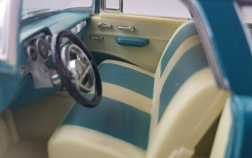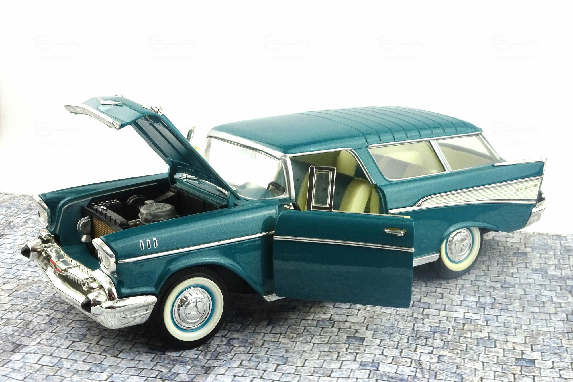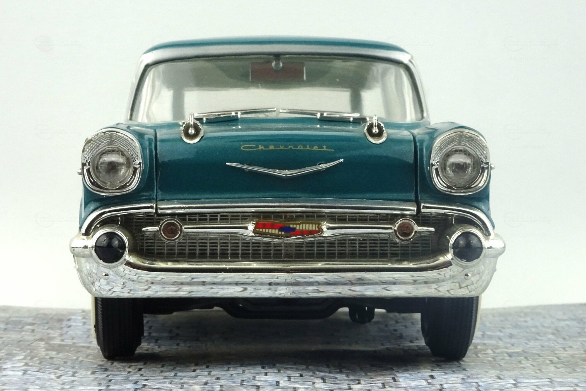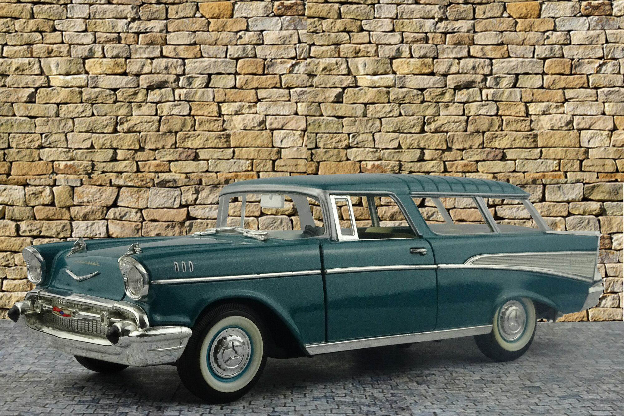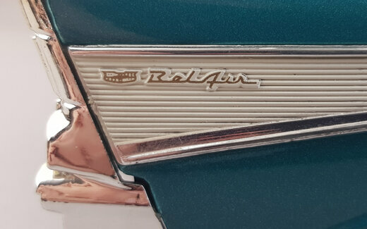 Zum ersten Male wurde der Name BelAir von Chevrolet 1950 für die zweitürigen Hardtops der Modellreihe DeLuxe verwendet. Erst ab 1953 wurde der BelAir zur Premium-Modellreihe oberhalb der 150 und 210 Serien die jedoch das gleiche Karosseriedesign hatten. Als Motoren standen Sechszylinder-Reihenmotoren mit 3,5 und 4 Litern Hubraum der Typen Thriftmaster und Blue Flame zur Verfügung. Es gab 2 und 4türigr Limousinen, Cabriolets sowie Coupés und ab 1954 eine Kombiversion. 1955 erhielten die Modelle ein komplett neues Styling und es wurden optional V8 Motoren angeboten. Das Modell für das Jahr 1957 hatte nun einen elliptischen, über die gesamte Wagenbreite verlaufenden Kühlergrill mit mächtigen Stoßstangenhörnern. Die futuristische Kühlerfigur der Vorgängermodelle war 2 links und rechts auf der Haube angeordneten Speeren mit einer kleinen Finne gewichen. Das Heck wurde von mächtigen Heckflossen geziert. Neben der Limousine, dem Coupe und dem Cabriolet gab es auch weiterhin Kombi-Versionen. Die dreitürige hieß Nomad und der Fünftürer wurde unter dem Namen Townsman angeboten. Standardmotor war ein 4,4 Liter V8 Motor mit 166 PS der das über 5 m lange und 1,9 m breite sowie 1,6 Tonnen schwere Fahrzeug auf immerhin 156 km/h beschleunigte. Der BelAir wurde in insgesamt 7 Generationen bis 1975 hergestellt. Im Modelljahren 1953 bis 1957 wurden insgesamt 535.784 Modelle ausgeliefert. Das Modell 1957 wurde zu einem der bekanntesten US-Autos.
