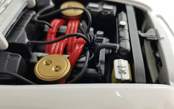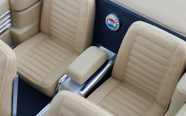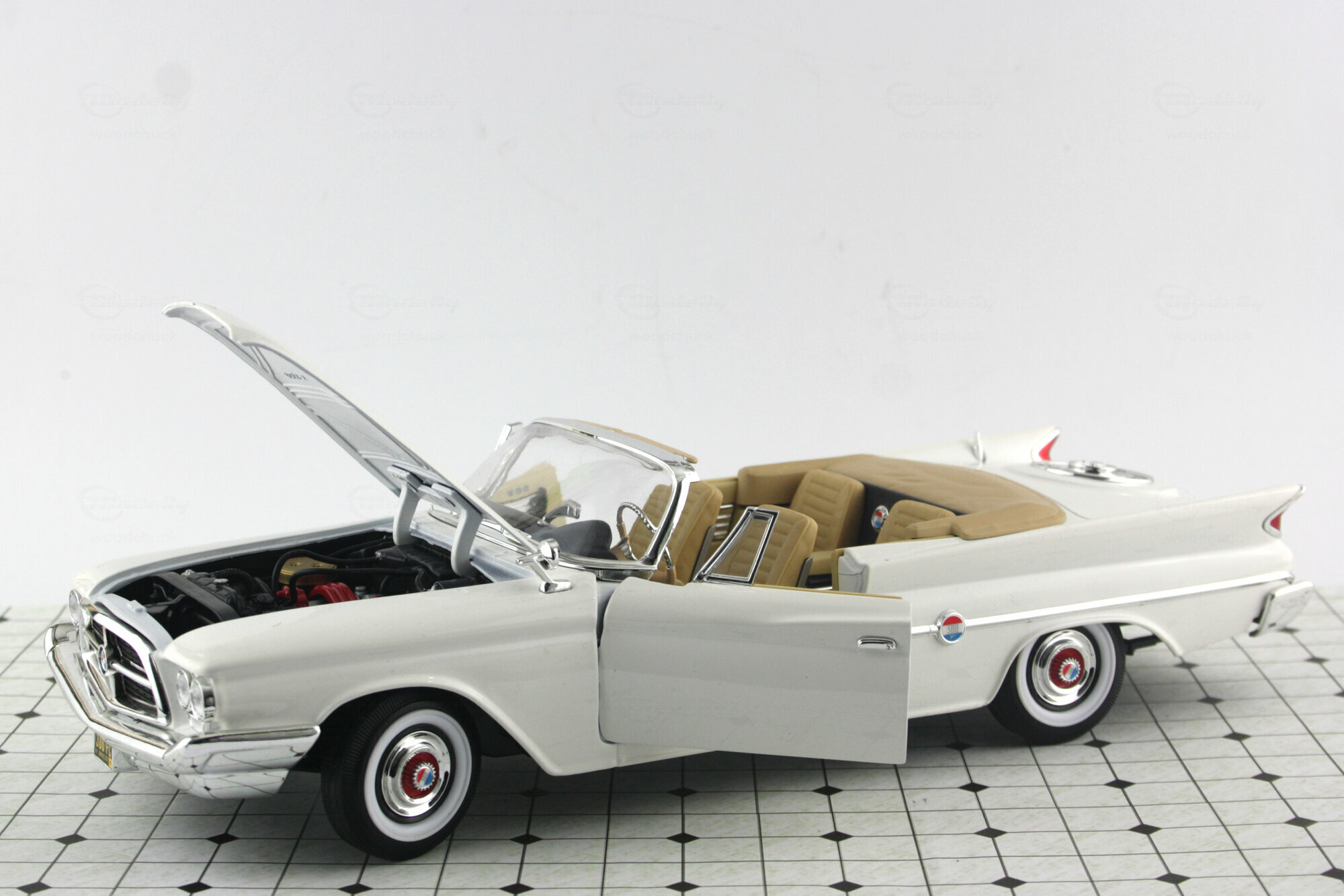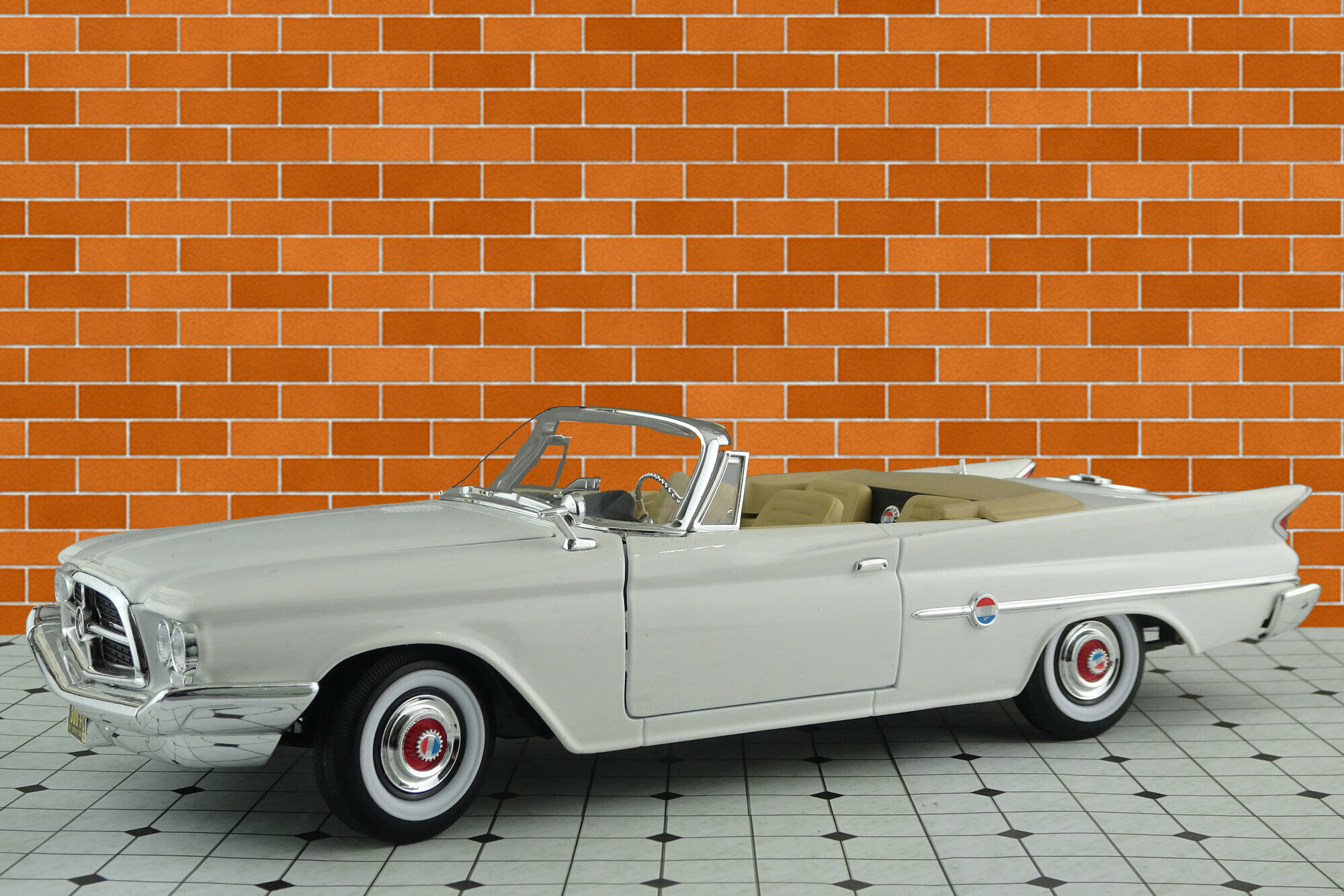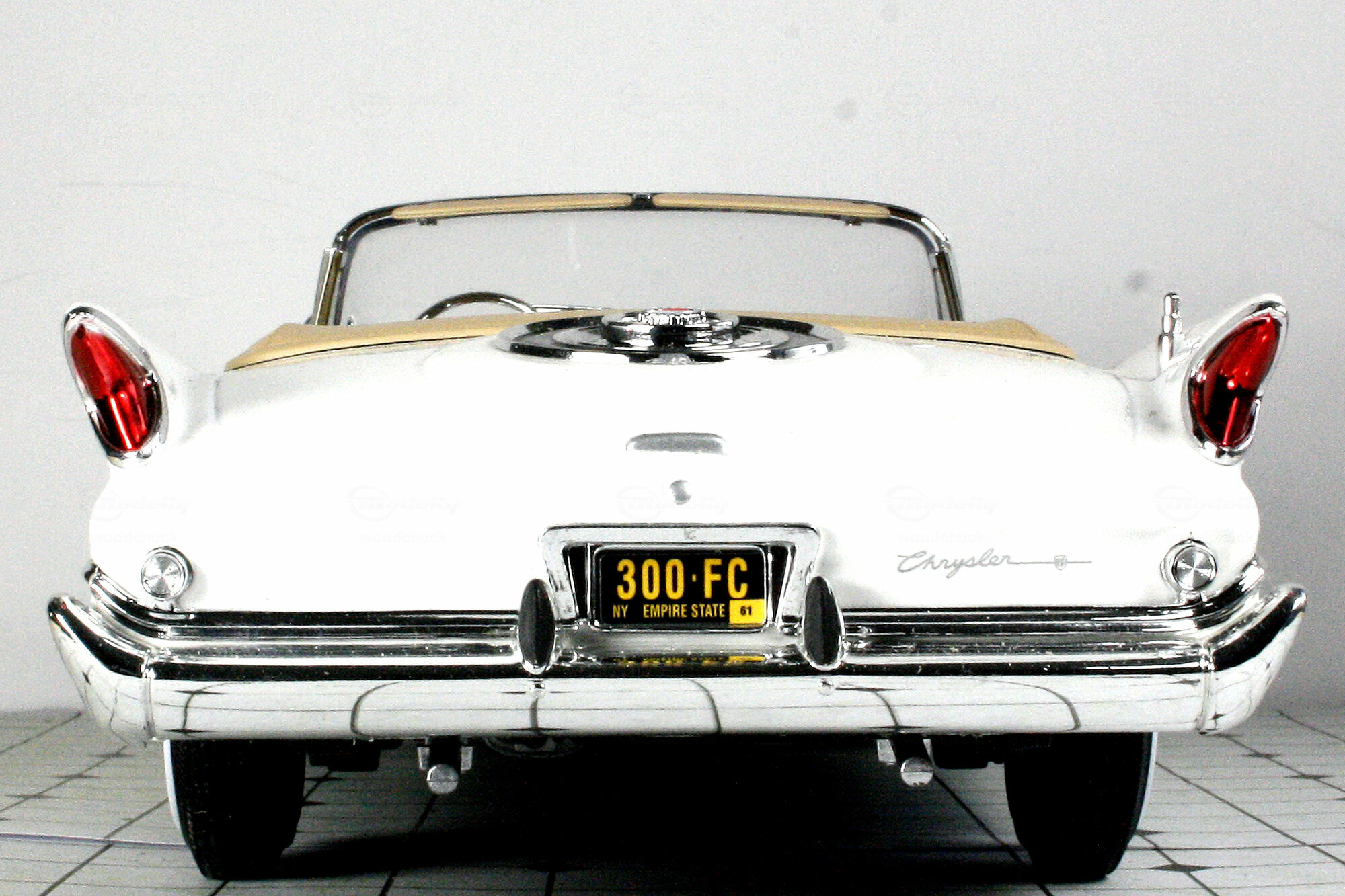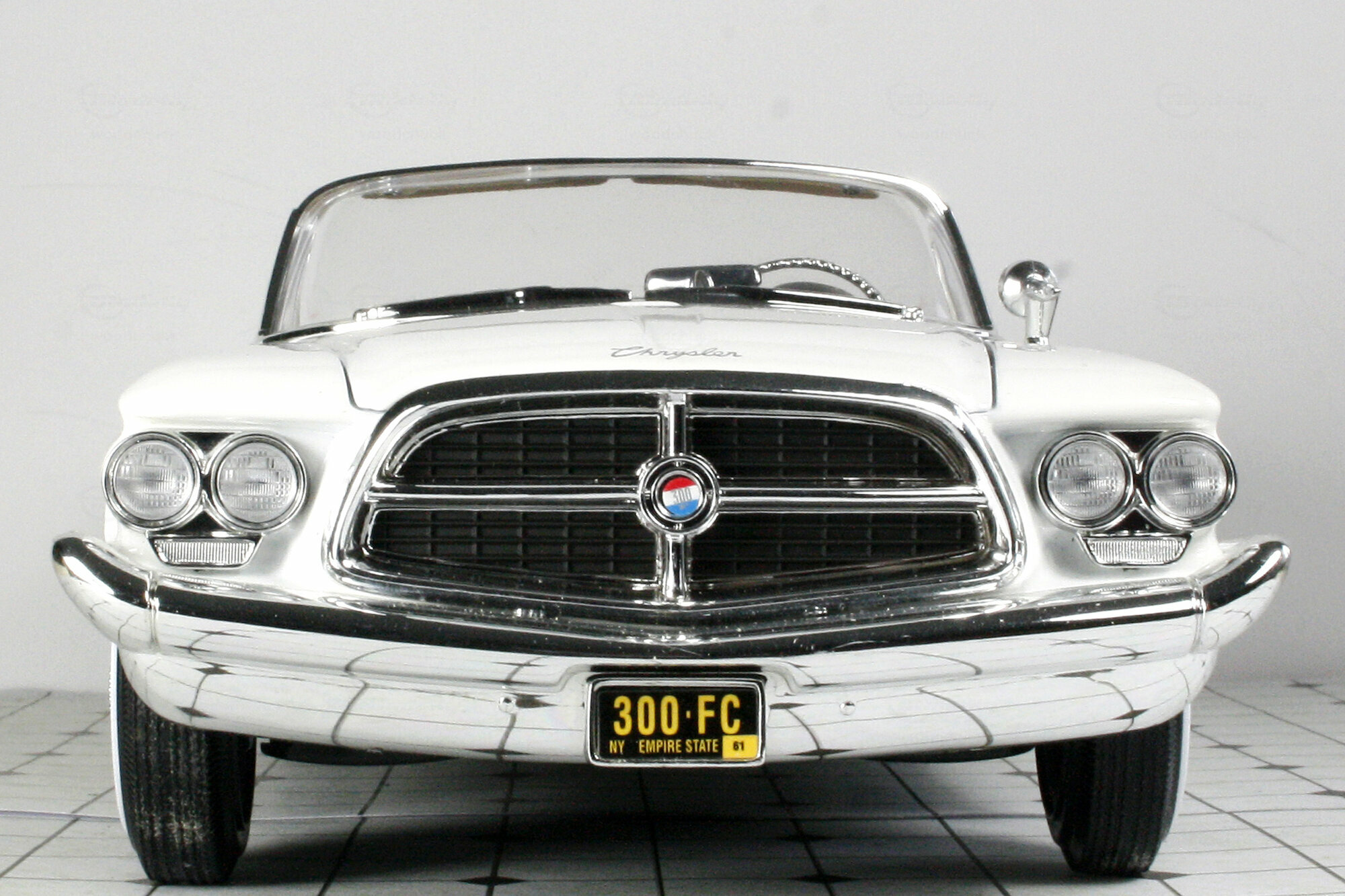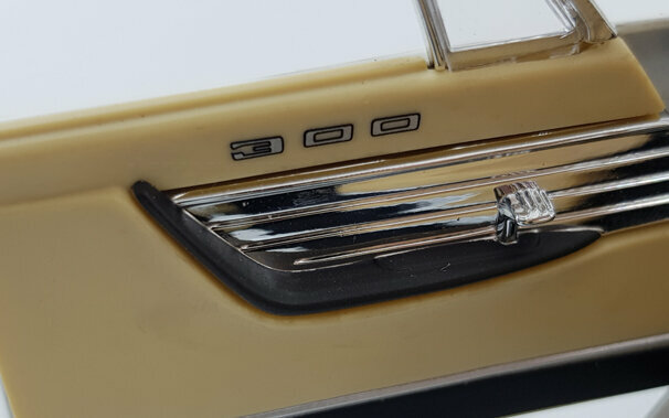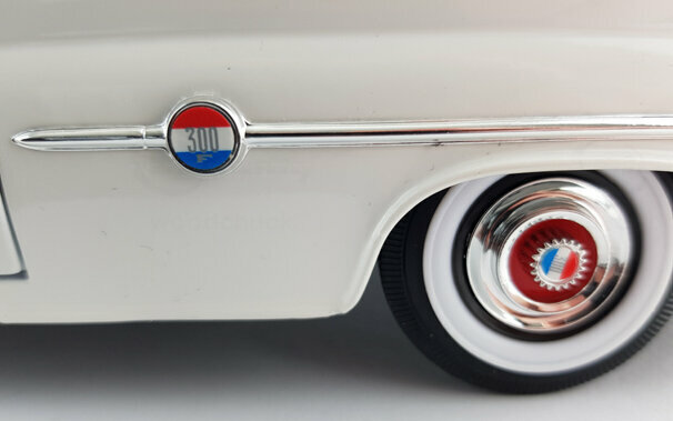 In seiner Serie Road Signature brachte Yatming 2006 ein DieCast-Modell des 300 F Convertible in verschiedenen Farbausführungen sowie einer Version mit echtem Leder heraus. Die Metallkarosserie ist mit einer sauber ausgeführten, in meinem Falle weißen, Lackierung versehen. Was das Escheinungsbild des Originals betrifft sind hier einige grobe Fehler unterlaufen. Die Frontmaske hätte etwas stärker geneigt sein sollen, Die Frontscheibe weist an der Oberkante eine Wölbung zum Horizontalen auf die beim Original so nicht vorhanden ist. Am gravierendsten sind jedoch die Heckflossen: Diese steigen im vorderen Bereich nicht genügend an und die Basis ist nicht waagerecht sondern fällt nach hinten ab. So wirken sie zu klein und zu flach. Die Schrägung nach außen ist ebenfalls etwas zu gering. Die äußeren Details sind einfach und etwas grob, aber gut eingepasst. Die Unterseite ist befriedigend, die Räder jedoch sehr schwach. Das Modell hat eine funktionierende Lenkung, es lassen sich jedoch nur die Tüten und die Motorhaube öffnen. Unter dieser befindet sich dann aber eine sehr ordentlich gemachte Nachbildung des Hemi-V8. Auch der Innenraum ist gut gelungen auch wenn hier Chrom dominiert wo beim Original Aluminium war. Die Sitze sind sehr schön modelliert und lassen sich wie beim Original nach außen drehen. Der Maßstab wird sehr gut eingehalten. Ein Modell mit Schwächen was den Preis von 40 -45 € für den es aktuell im Netz angeboten wird aber dennoch wert ist. Die Neuauflage von Lucky Die Cast ist sogar schon ab 35 € zu bekommen.