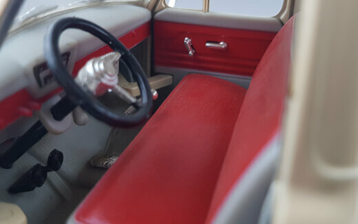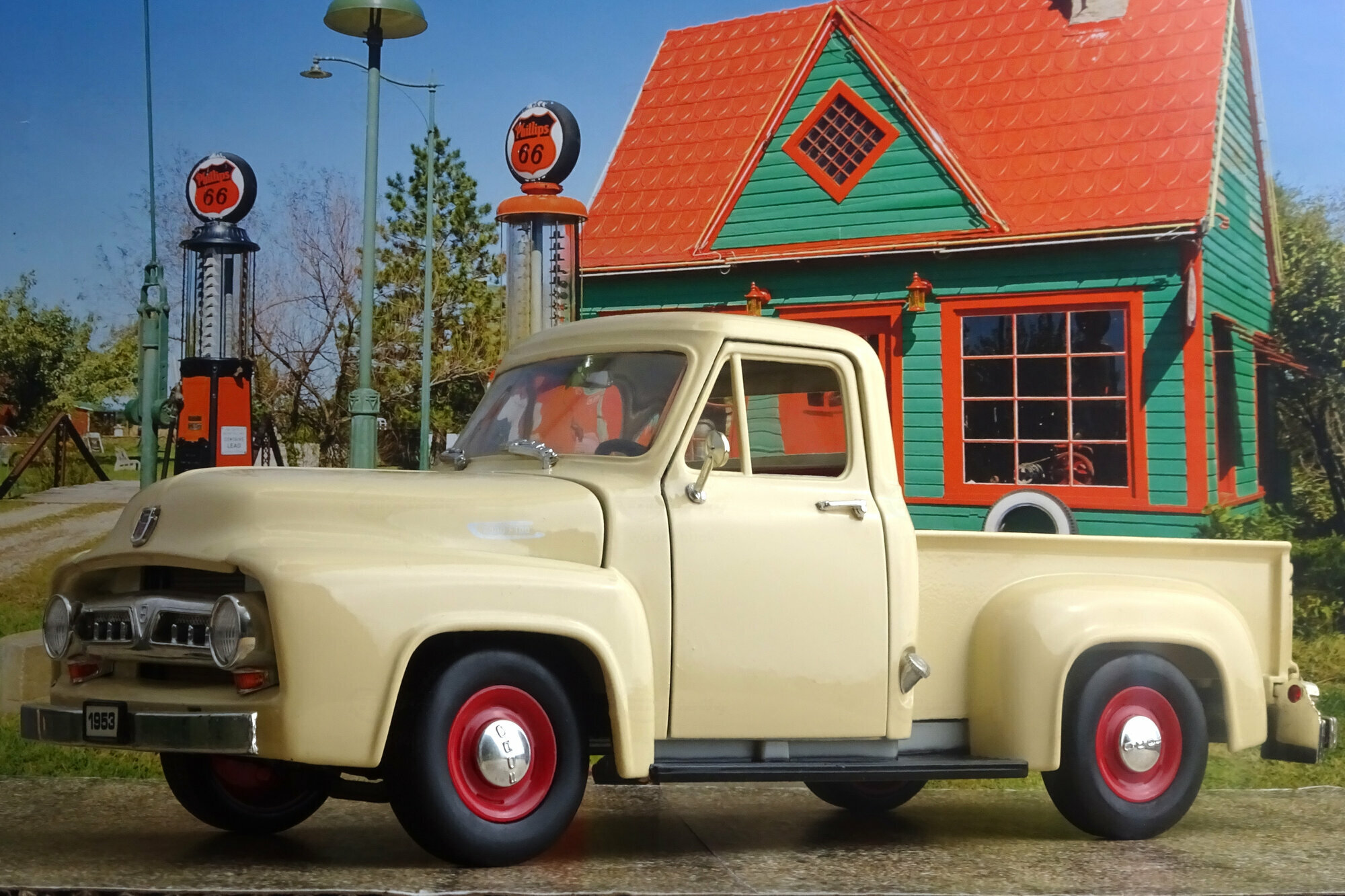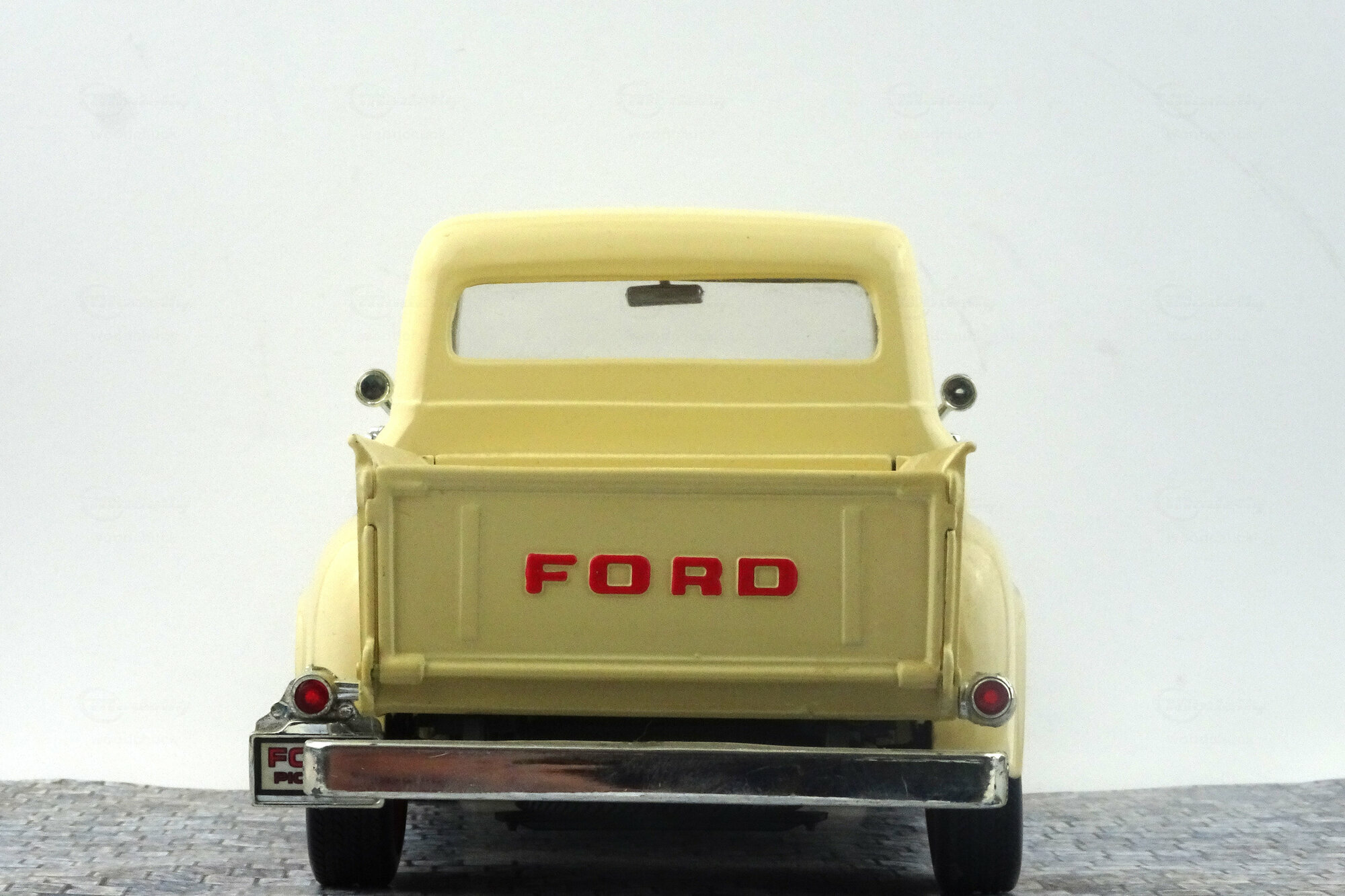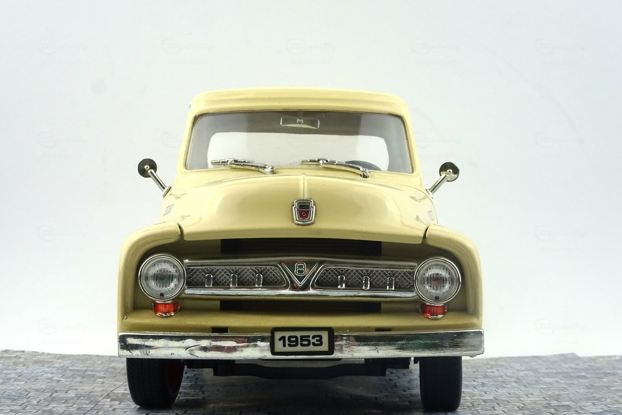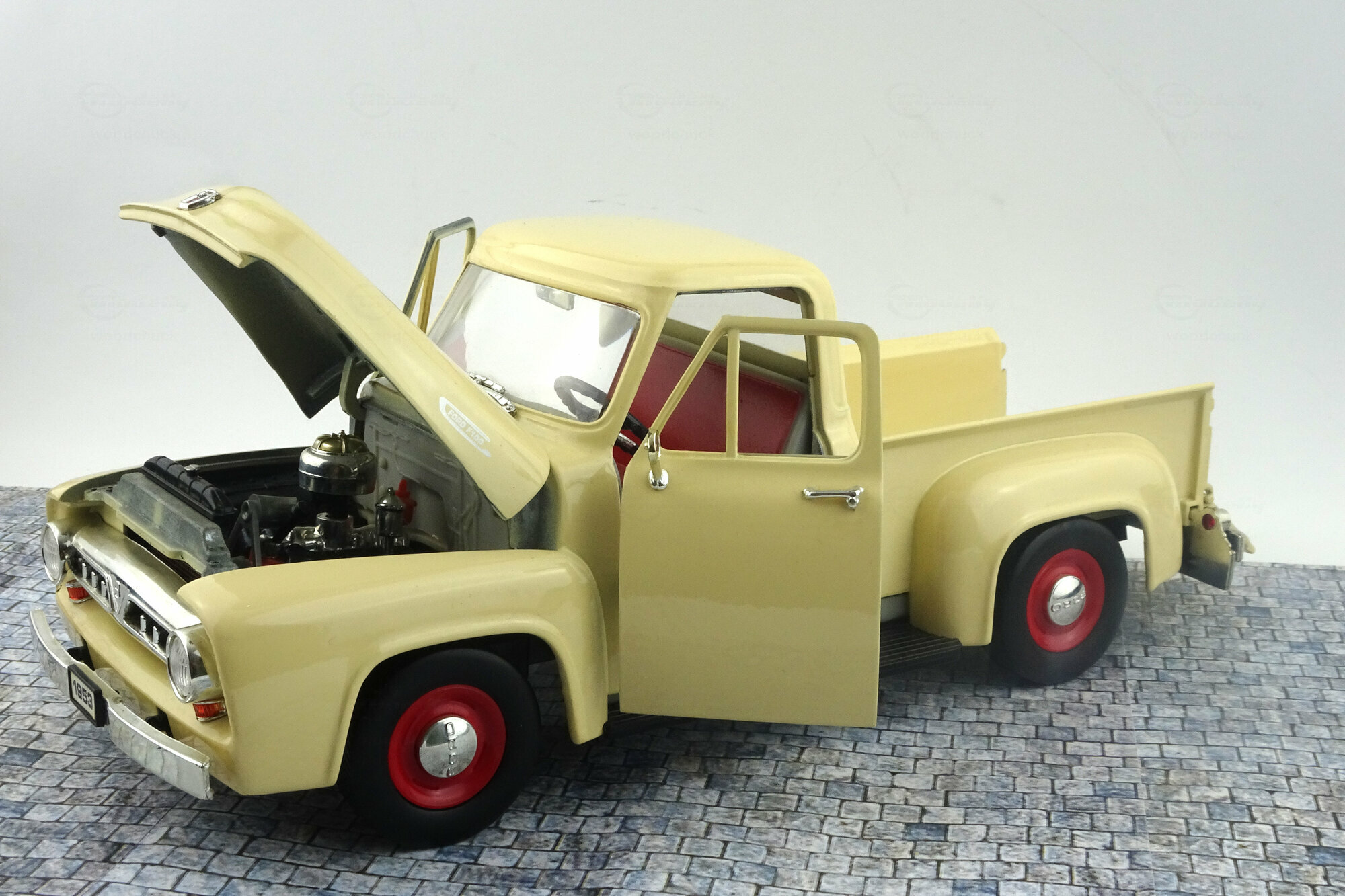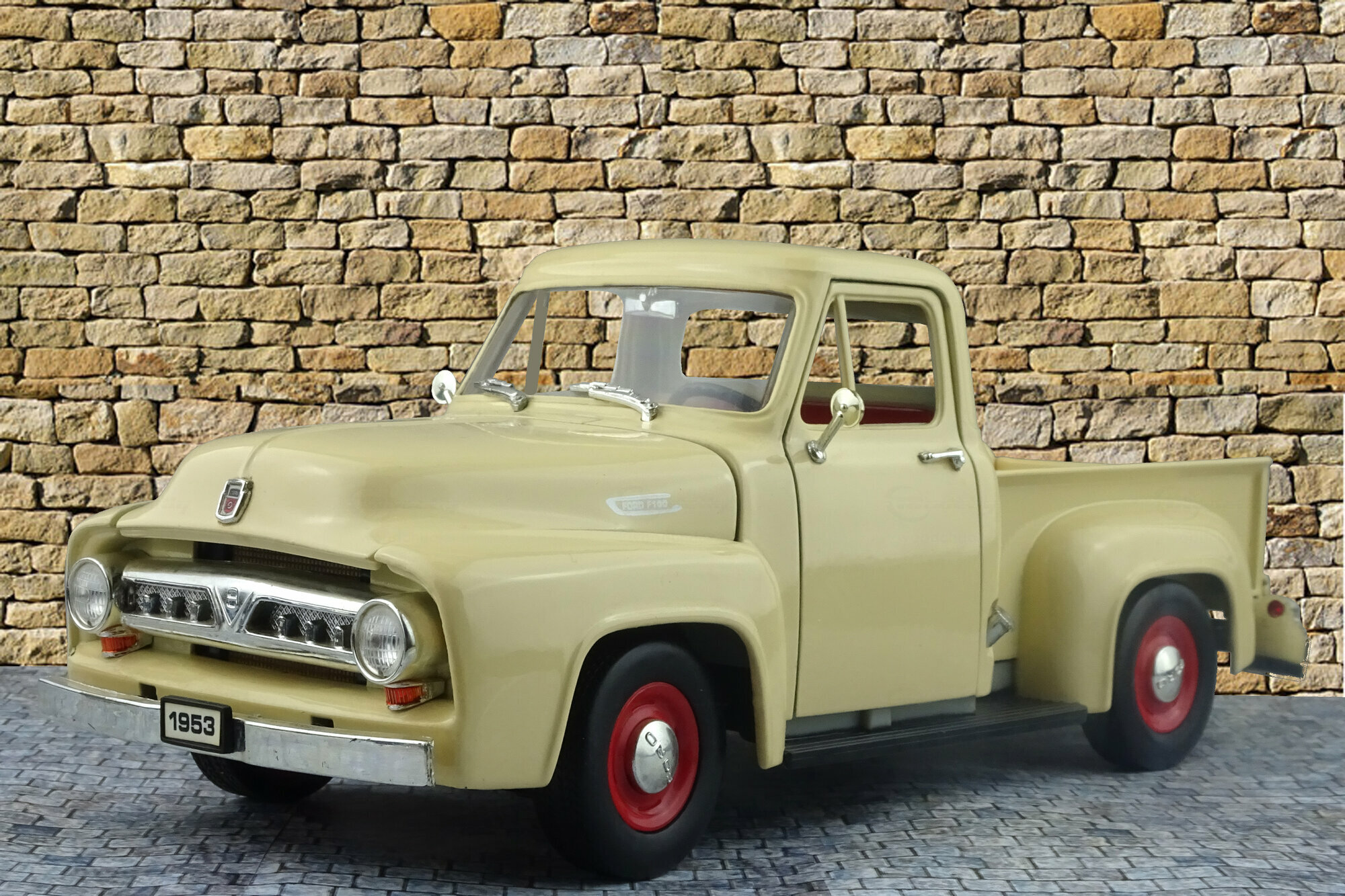In der Road Legends Serie erschien 2002 bei Yatming ein DieCast-Modell des Ford F100 Pickup von 1953. Das Modell ist ordentlich gefertigt und mit einer guten Lackierung versehen. Die äußeren Details sind sehr einfach gehalten und beim Kühlergrill hat man es nicht so genau genommen. Dieser ist leider deutlich zu flach geraten und auch die Ausführung in Chrom erscheint beim Standard-Modell doch fraglich. Ebenso ist das F 100 Emblem an den Seiten der Motorhaube beim Original als aufgesetztes Chromteil ausgeführt und nicht als lackierter Schriftzug. Auch die Räder sind einfach, aber stimmig. Es lassen sich beide Türen, die Motorhaube sowie die Ladeflächenklappe öffnen. Die Ladefläche besitzt die Struktur eines Holzbodens mit Metallschienen. Leider ist die Holzmaserung nur sehr schwach ausgeprägt und alles ist einheitlich in Wagenfarbe lackiert. Unter der Haube findet sich ein eher mittelmäßig detaillierter V8 Motor. Der Innenraum ist eher einfach gestaltet auch wenn man versucht hat dieses durch eine zweifarbige Lackierung aufzuwerten. Der Maßstab wird akzeptabel eingehalten. Ein sehr einfach gehaltenes Modell was eher den Anspruch eines Schreibtischschmuck als eines Sammlermodells erfüllt. Es wird nicht mehr gefertigt und auch die Neuauflage von Lucky DieCast ist derzeit nicht im Angebot. Im Netz ist es fast ausschließlich bei ausländischen Anbietern so um die 40 -50 € zu finden.