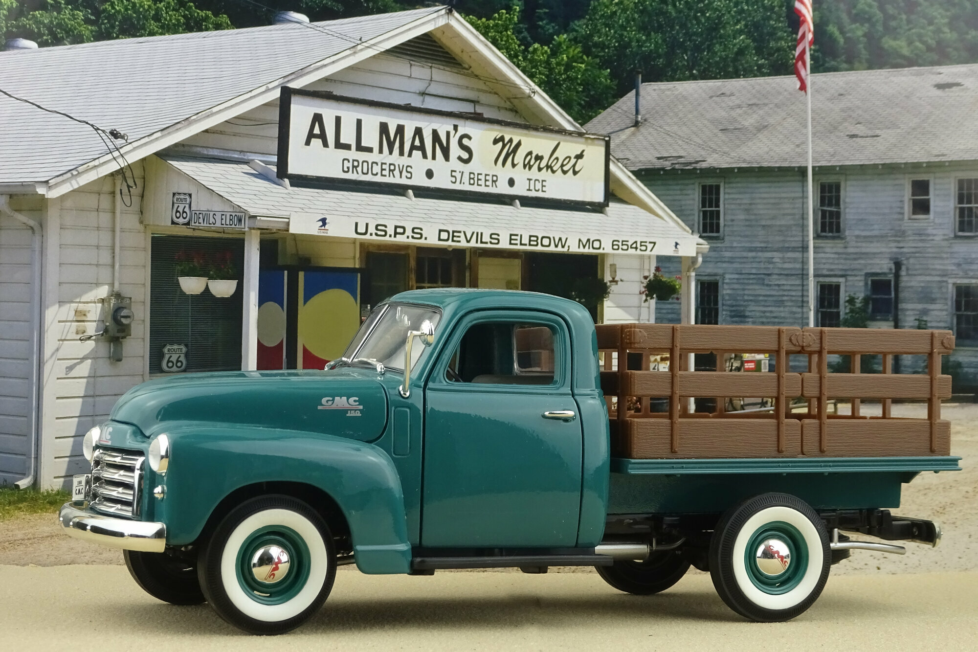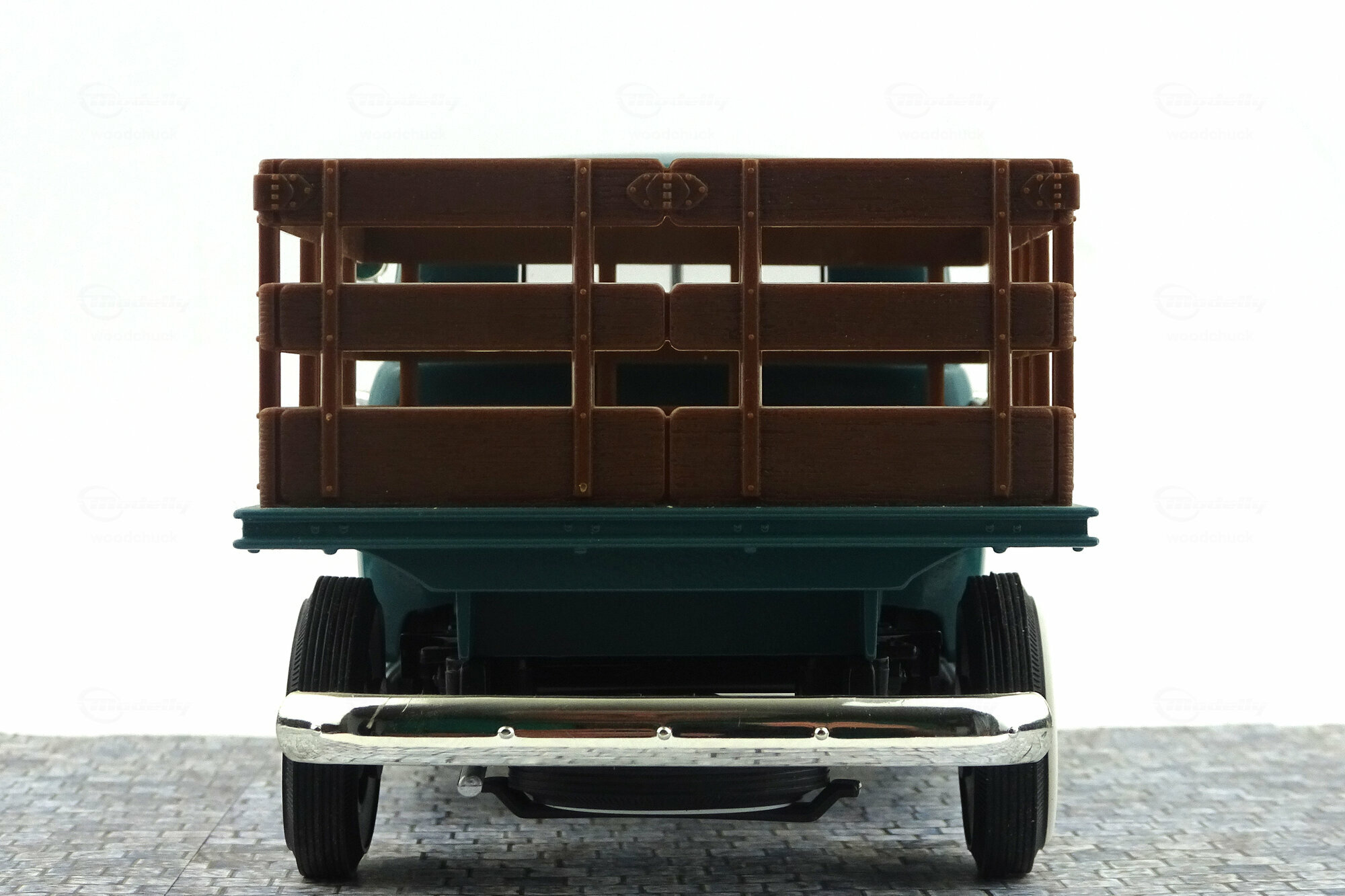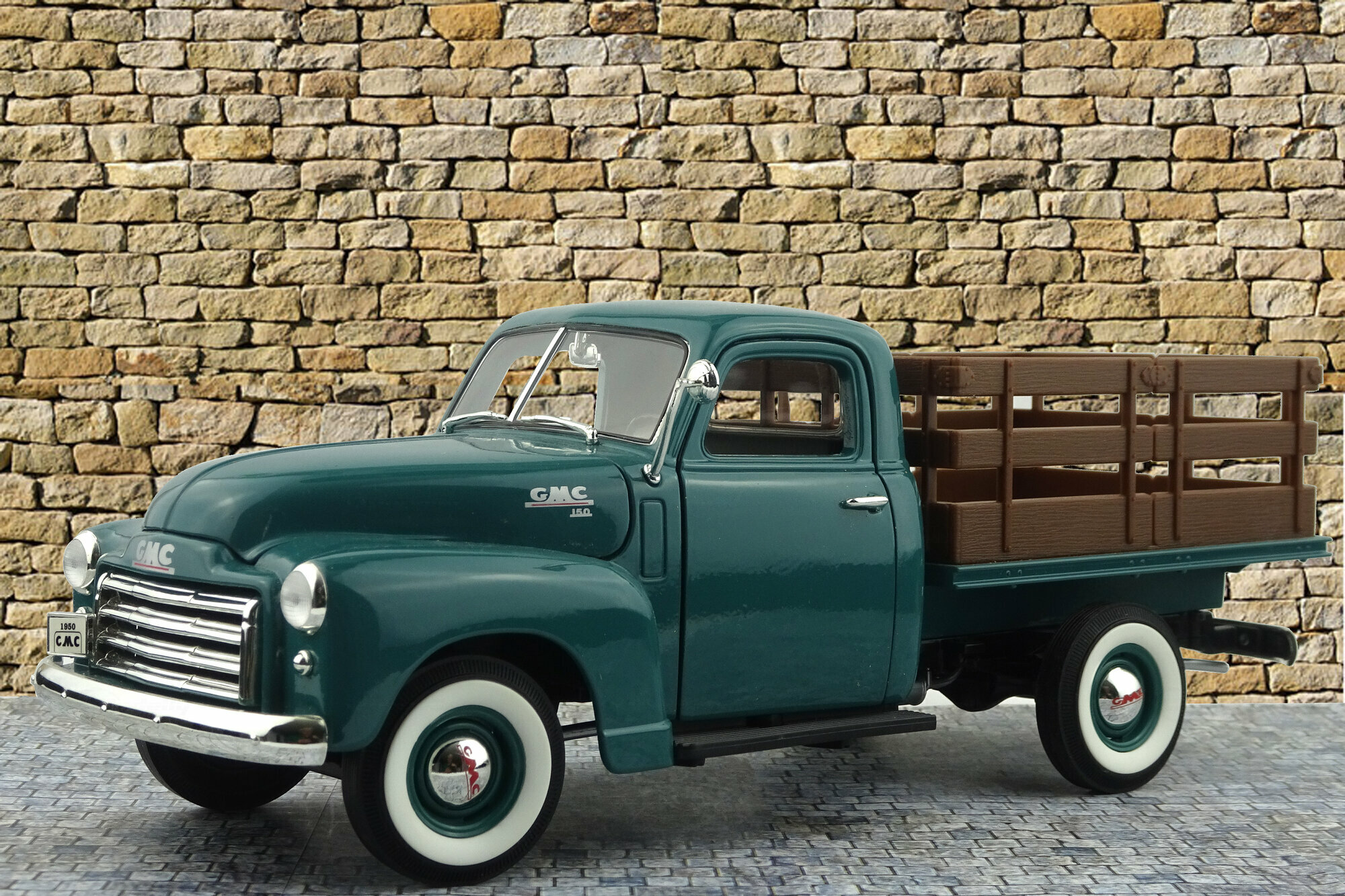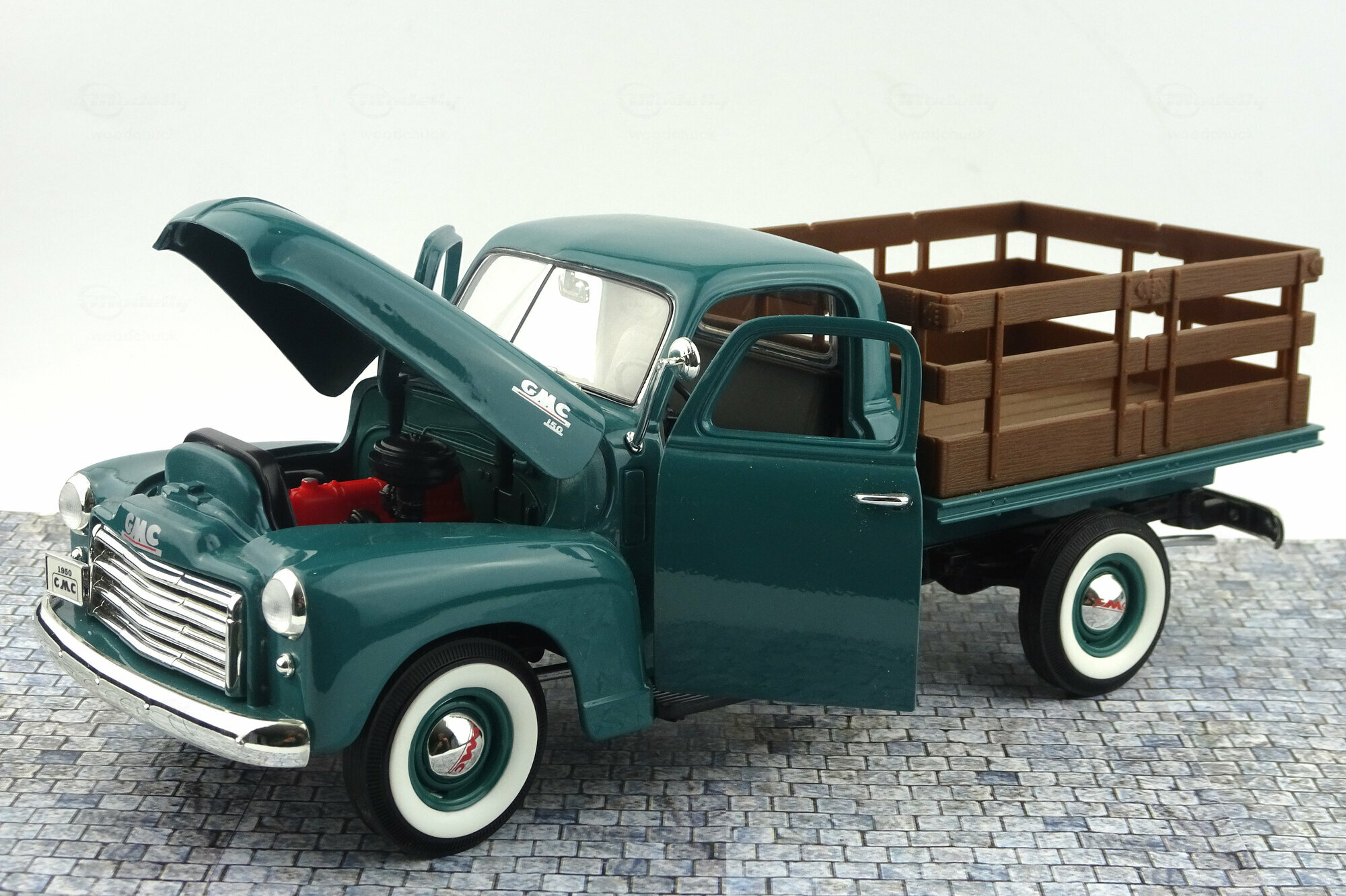 Neben den Pickup brachte Yatming 2005 in der Road Tough Serie auch ein DieCast Modell des GMC FC 101 mit Stake Truck Aufbau von 1950 heraus. Das Modell ist im Wesentlichen identisch mit dem Pickup, lediglich der hintere aufbau wurde geändert. Der Metallguss ist hier gut ausgeführt und ebenso wie die Lackierung ohne Tadel. Die Ladefläche aus Kunststoff zeigt eine Holzmaserung ebenso wie die Gitter der Seitenwände. Die äußeren Details sind sehr gut und fein ausgeführt und der Chrom ist von guter Qualität. Auch die Unterseite macht wie die Räder einen guten Eindruck. Es lassen sich beide Türen sowie die Motorhaube öffnen. Unter dieser findet man einen leider nur sehr mittelmäßig gestalteten Motor. Der Innenraum wirkt hier schone besser mit guten Armaturen, strukturierter Bodengruppe und einer gut modellierten Sitzbank. Soweit sich das überprüfen ließ, wird der Maßstab ordentlich eingehalten. Ein gutes, grundsolides Modell welches damals zu einem sehr günstigen Preis angeboten wurde. Es ist nicht mehr in Produktion und auch im Netz nur noch sehr selten zu finden.