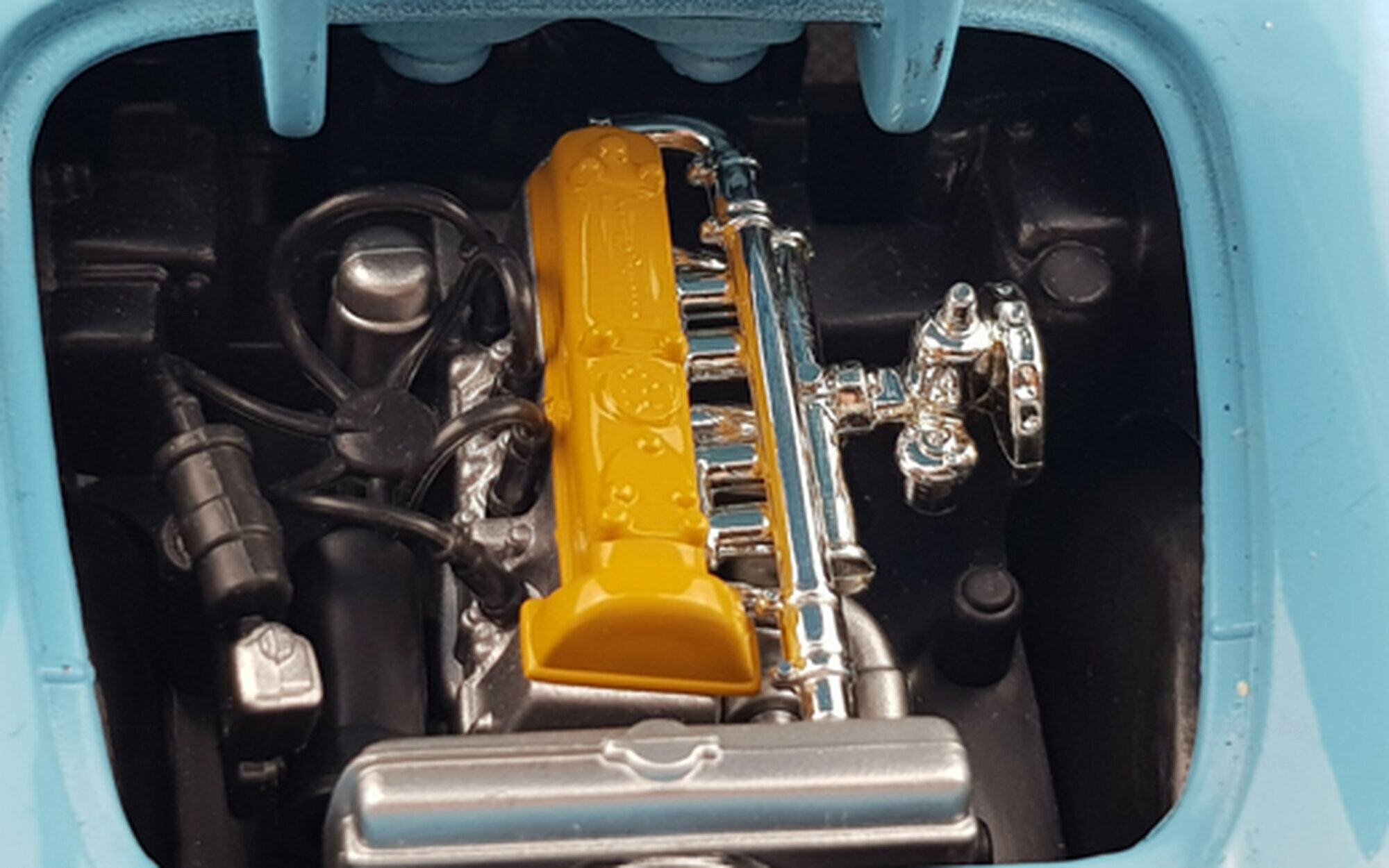Motor mit kompletter Zündverkabelung. Auch der Innenraum macht einen guten