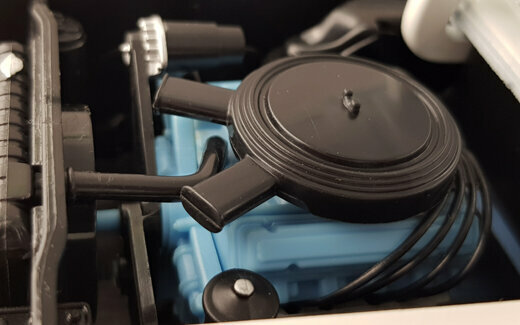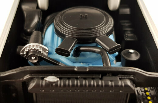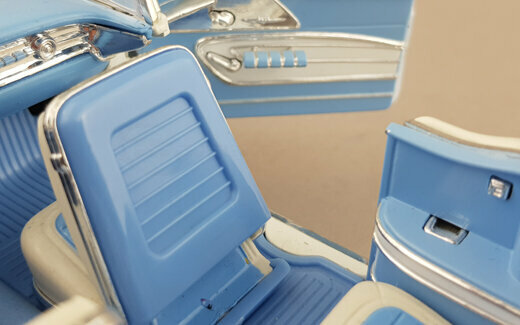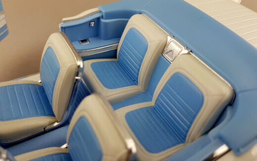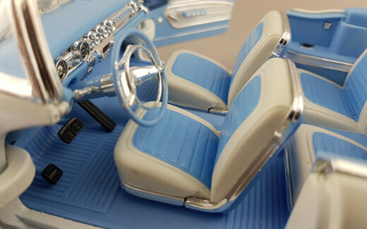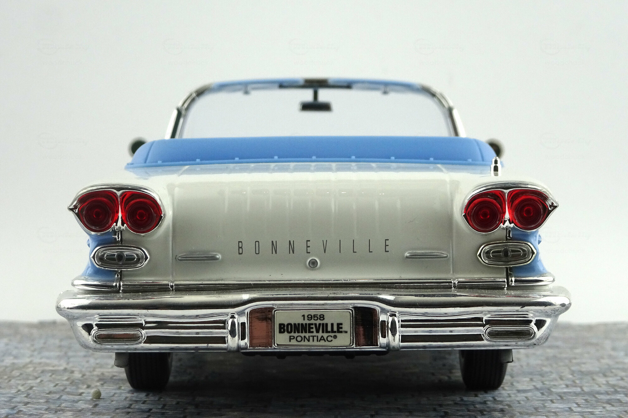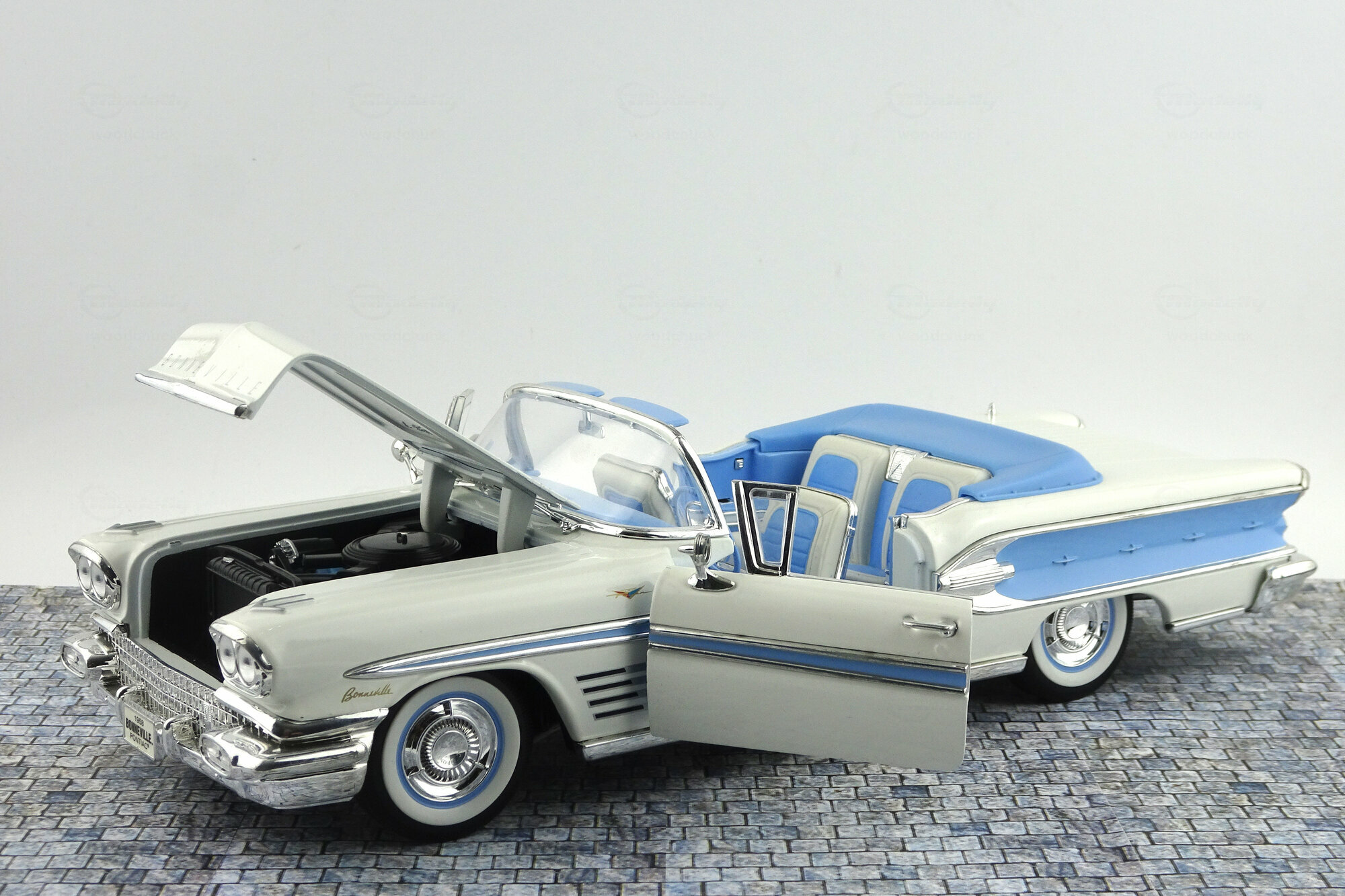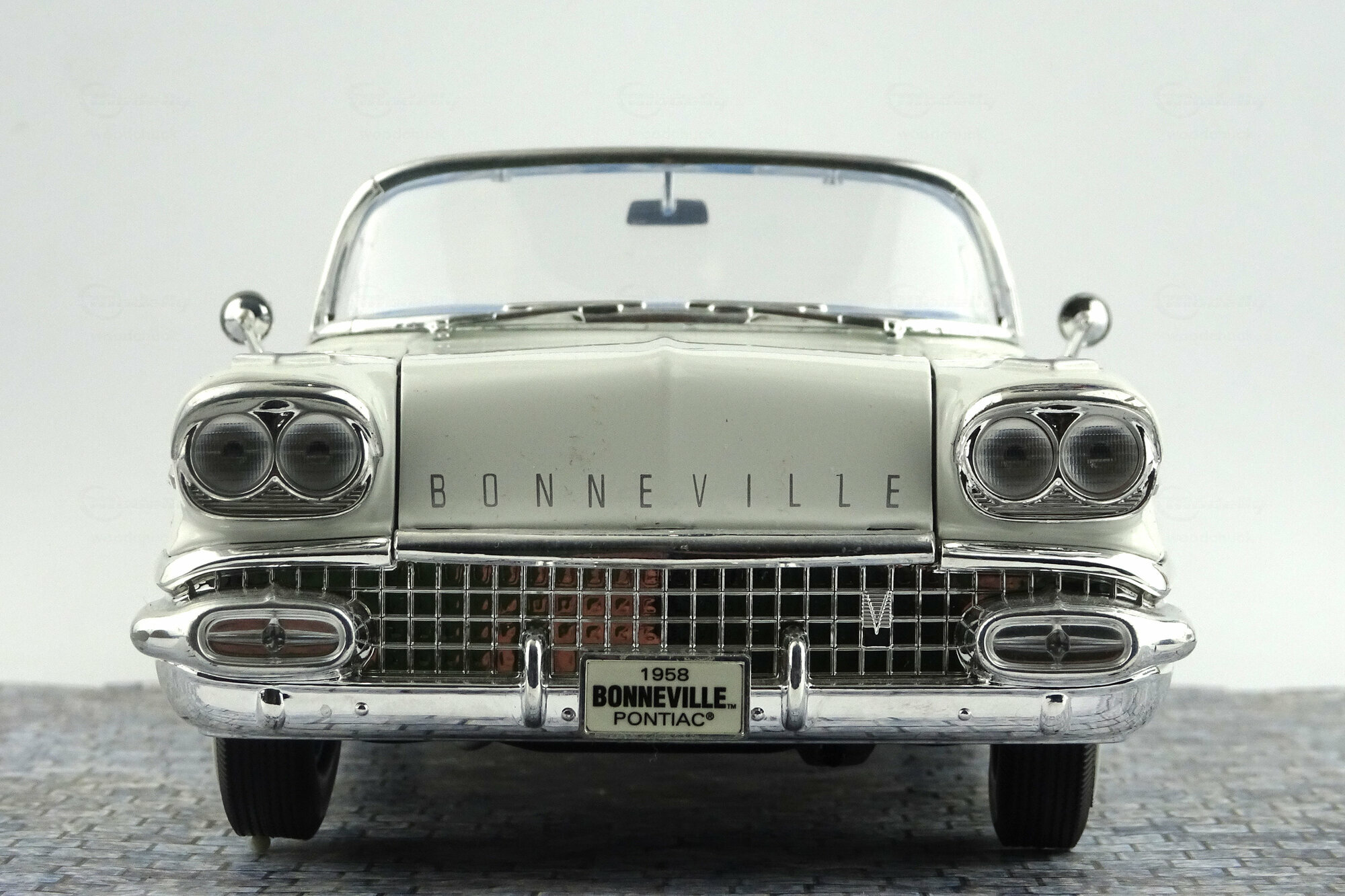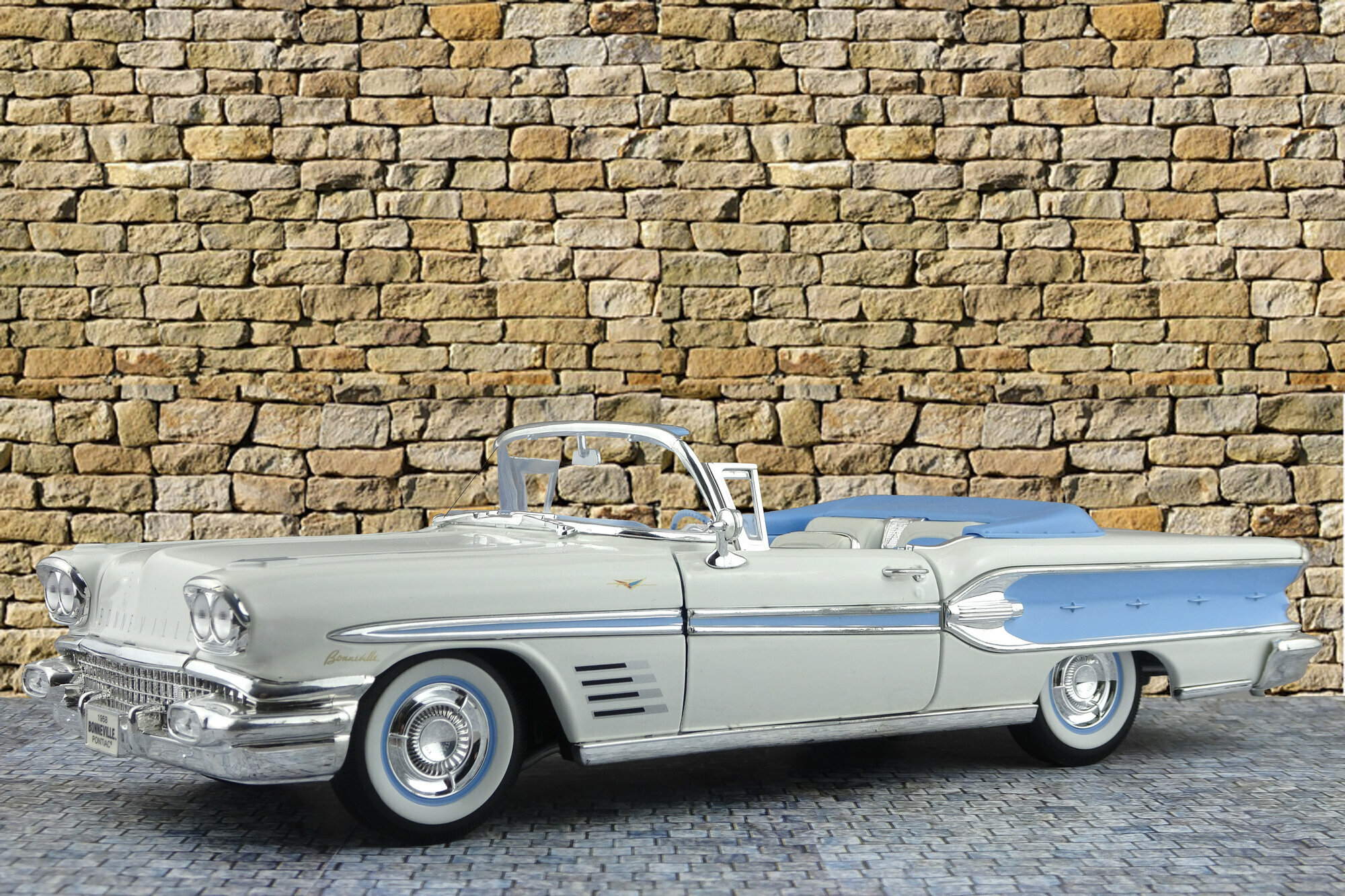 Von YatMing erschien 2002 in der Road Signature Serie ein DieCast-Modell des 1958 Pontiac Bonneville Cabriolet in Weiß/blauer Lackierung. Die Verarbeitung wie auch die Lackierung ist soweit in Ordnung , die äußeren Details wie der umfangreiche chromschmuck sind vollzählig, wenn auch sehr einfach (Kühlergrill) vorbildgerecht dargestellt. Gleiches gilt auch für Räder und Unterseite auf welche aber die Wesentlichen Merkmale wie doppelte Auspuffanlage und X Rahmen vorhanden sind. Es lassen sich die Türen sowie die Motorhaube öffnen. Unter dieser kommt leider nur ein sehr einfach dargestellter V8 Motor zu Vorschein. Im Innenraum fallen sofort die vielen Chrom-applikationen auf waren aber ebenso beim Vorbild vorhanden. Leider sind die beiden Hauptinstrumente im Armaturenbrett zu klein und das Lenkrad steht zu weit vor und hatte zu wenig Neigung. Die Sitze und Türverkleidungen gefallen jedoch recht gut. Das Modell weis bei allen geprüften Maßen (L/B/H/WB) ca. 2 mm mehr als der Maßstab 1:18 auf was jedoch akzeptabel ist. Trotz allem, eingedenk des niedrigen Einstandspreises von unter 25 € ein schönes Modell was aktuell auch vom Yatming-Nachfolger Lucky-DieCast nicht mehr gefertigt wird. Im netzt gibt es jedoch noch Angebote, meist aus USA, ab 35 €.