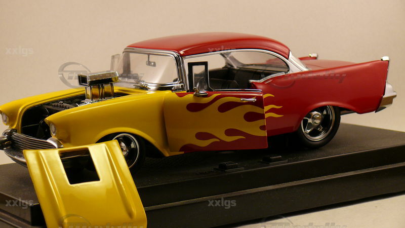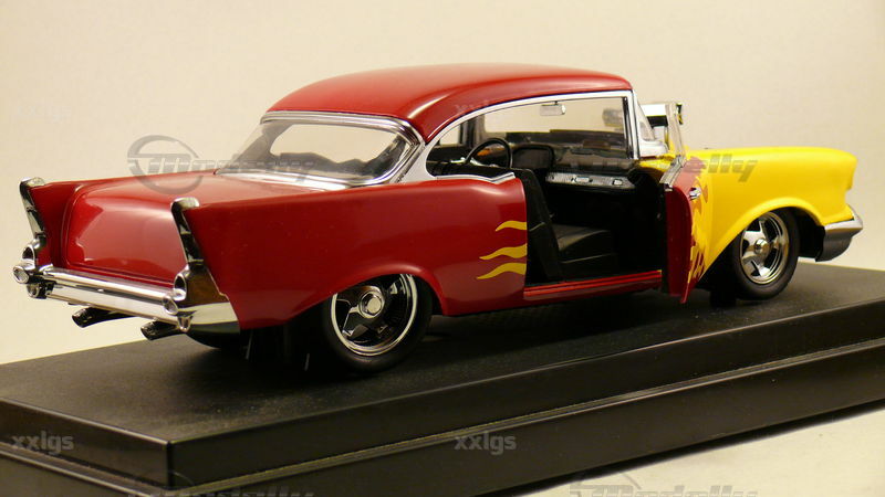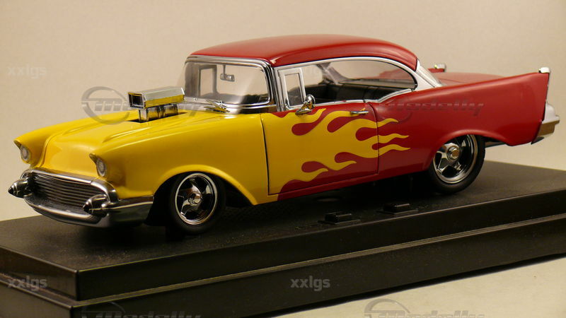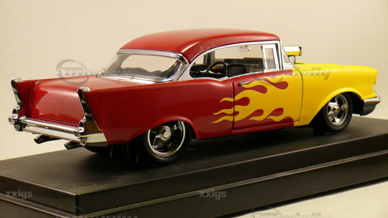 Die in 1:18 hergestellte Miniatur des Chevrolet Bel Air von Ertl fängt die charakteristische Optik und das Detailreichtum des Originals perfekt ein. Diese sorgfältig gefertigte Nachbildung ist ein besonderes Stück in der Sammlung von "xxlgs" auf Modelly. Besonders auffallend sind die auffälligen Flammenmotive, die von der Motorhaube bis zu den Türen reichen, was dieser Miniatur einen sehr eigenen Look verleiht. Der gelbe vordere Bereich der Karosserie kontrastiert scharf mit dem roten hinteren Teil und den polierten Chromakzenten. Auch der Motorblock, der unter der Motorhaube hervorragt, wird präzise nachgebildet und verleiht dem Modell ein authentisches Aussehen. Diese Ertl-Nachbildung ist ein perfektes Beispiel für die Detailverliebtheit und Präzision, die Sammler an 1:18 Modellen schätzen.