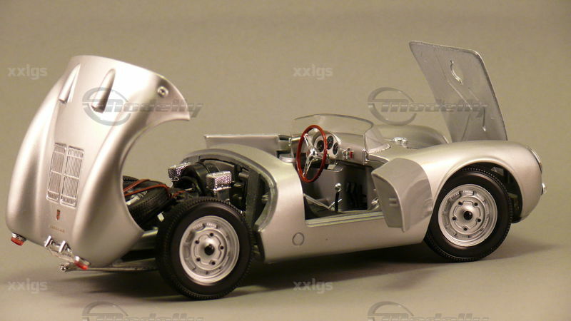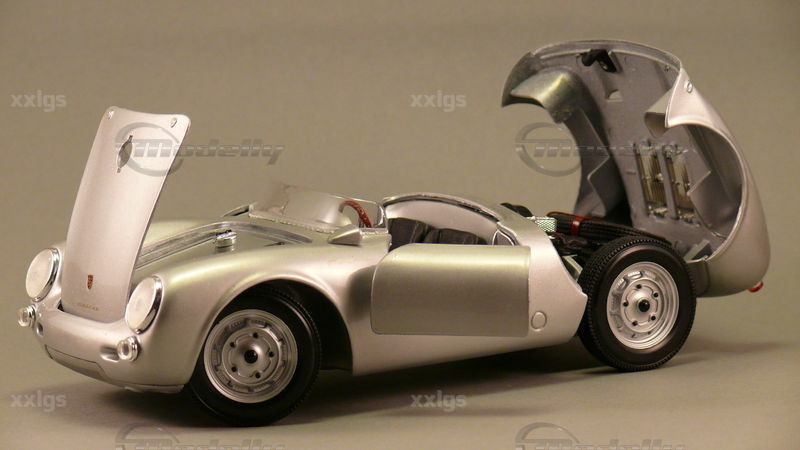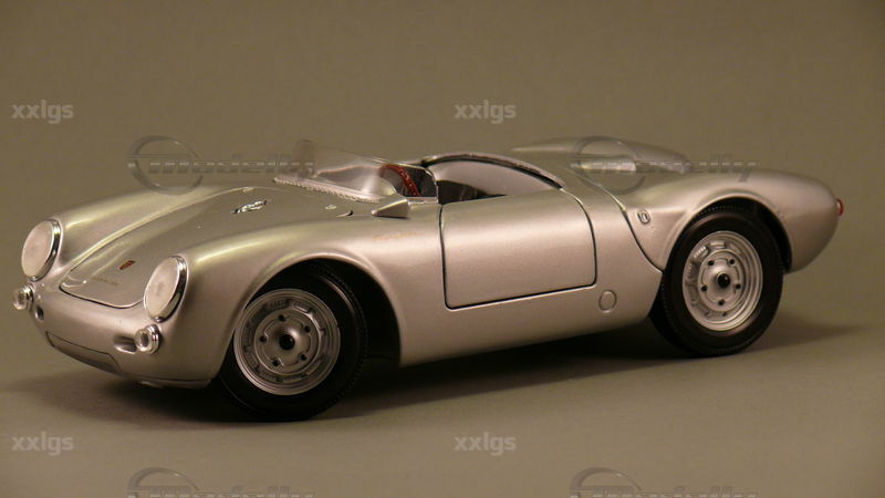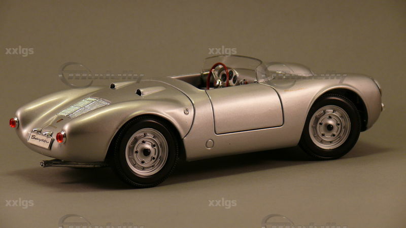 Das 1:18 Modellauto von Maisto fängt die Essenz und das Design des ursprünglichen Porsche 550 A perfekt ein. Die Lackierung in authentischem Silberspray lässt das Modell realistisch und hochwertig wirken. Die von "xxlgs" in seiner Sammlung präsentierte Miniatur zeigt beeindruckende Detaillierungen, wie z.B. die originalgetreuen Felgen und die korrekte Beschriftung auf der Rückseite. Die exakte Nachbildung des Innenraums mit den klar erkennbaren Instrumenten und Sitzpolstern unterstreicht die Präzision, mit der Maisto dieses Modell gefertigt hat. Die Frontscheinwerfer und die markanten Lufteinlässe sind exzellent modelliert, und die gesamte Karosserie spiegelt die elegante, aber funktionale Form des Originalfahrzeugs wider. Die Aufschrift "550 A" und das korrekte Porsche-Emblem auf der Motorhaube zeigen die Liebe zum Detail und den Anspruch, ein möglichst genaues Modell zu kreieren.