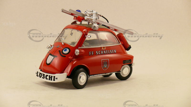 Das Modell stellt eine maßstabsgetreue Nachbildung des Originals BMW Isetta dar, die von Revell perfekt umgesetzt wurde. Zu den sichtbaren technischen Details gehören die verchromten Scheinwerferringe und Stoßfänger, die dem Fahrzeug einen klassischen Look verleihen. Zusätzlich sind die kleinen Räder im maßstabsgetreuen Design montiert, wobei die Felgen und Reifen originalgetreu nachempfunden wurden. Das Miniaturmodell in 1:18 zeigt auch die charakteristische Fronttür, die ein markantes Merkmal der echten Isetta ist.Besonderes Augenmerk verdient die Bemalung des Modells. Die Feuerwehrlackierung in leuchtendem Rot, kombiniert mit den blau-weißen Details und Beschriftungen, zieht alle Blicke auf sich. Der Aufdruck "LÖSCHI" an der Vorderseite des Fahrzeugs verleiht dem Modell einen charmanten und funktionalen Touch. Die silbernen Akzente der Leiter und die authentischen Feuerlöscher sind ebenfalls sorgfältig gestaltet und zeigen die Liebe zum Detail, die bei diesem Modell eine Rolle spielt.