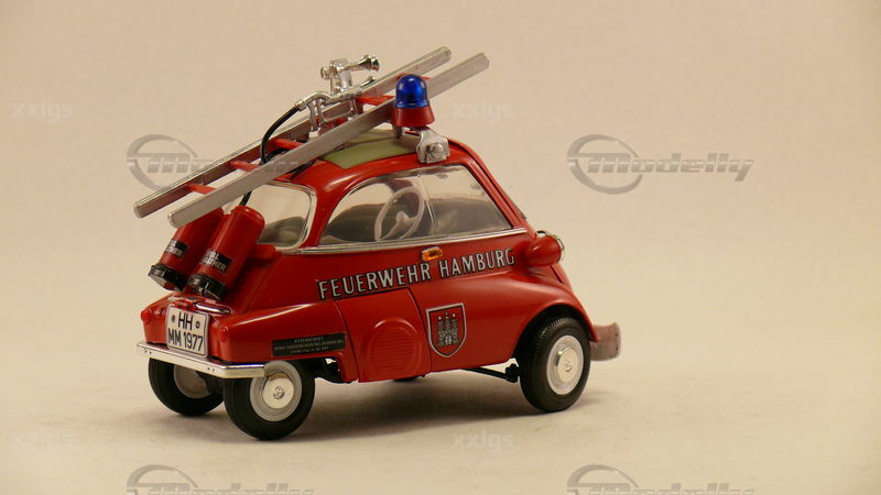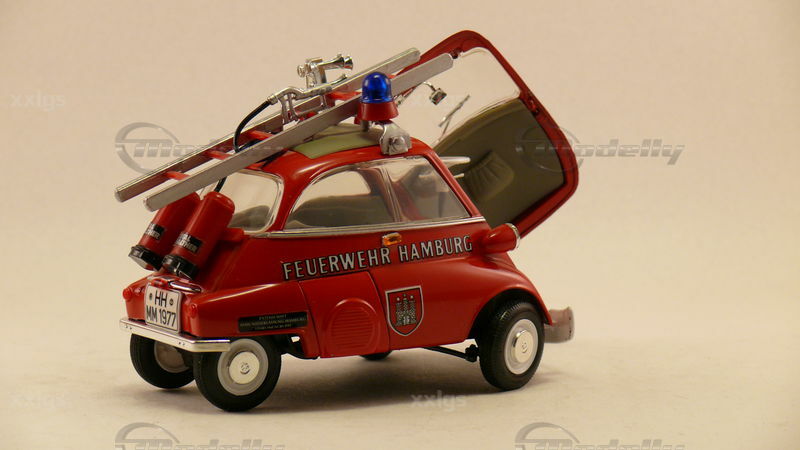 Für Sammler und Miniaturliebhaber präsentiert Revell dieses Modell der BMW Isetta im 1:18 Maßstab, das präzise Details und eine hochwertige Verarbeitung bietet. Mitglieder der Modellgemeinde, wie "xxlgs" auf Modelly, wissen die hochwertige Ausführung zu schätzen. Dieses Modellauto zeigt die Isetta in einer Sonderausführung als Feuerwehrfahrzeug, erkennbar an der roten Lackierung und den entsprechenden Beschriftungen wie "FEUERWEHR HAMBURG".Auf den Fotos, die "xxlgs" hochladen hat, ist zu erkennen, dass das Modell detailgetreu mit einer Leiter und Feuerlöschern auf dem Dach ausgestattet ist. Auf der Seite sind die Buchstaben "FF SCHNELSEN" aufgedruckt, was auf ein fiktives oder historisches Feuerwehrabzeichen hinweist. Der Schriftzug "FEUERWEHR HAMBURG" auf der Rückseite und die speziellen Feuerwehrsymbole geben dem Modell ein authentisches Aussehen.