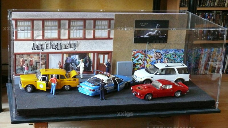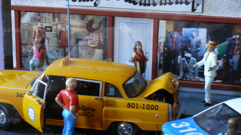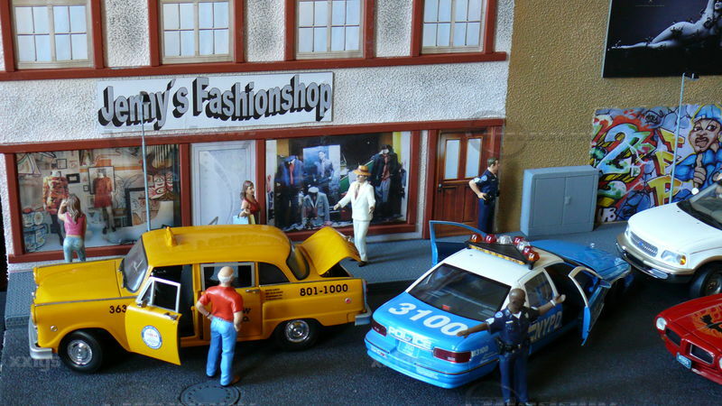 Das Modell steht in einem Diorama "Straßenscene NY" und der Fahrer soll eine Frau vom Einkaufen abholen.