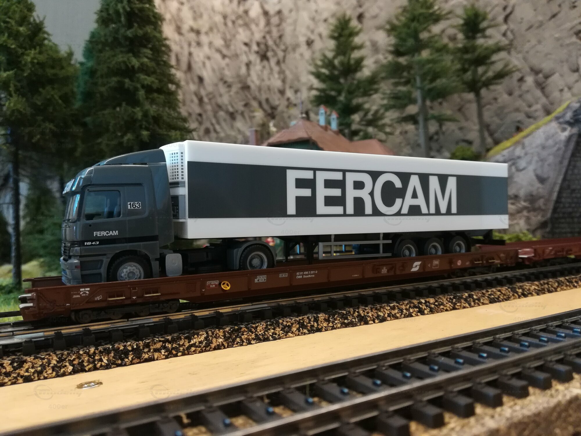 Rola-Niederflurwagen der ÖBB, beladen mit einem Actros mit Kühlauflieger der Spedition Fercam