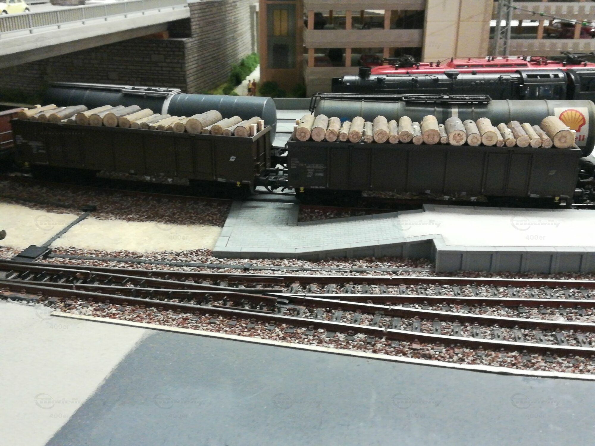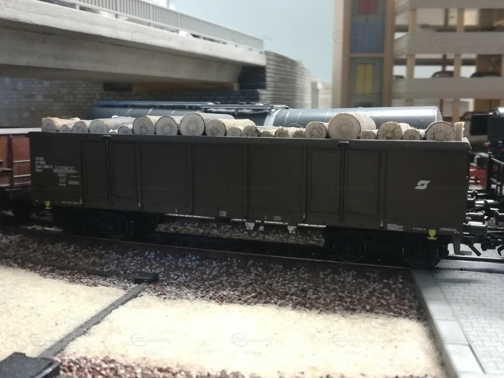 Hier handelt es sich um ein Set mit 3 Waggons unterschiedlicher Betriebsnummer, werksseitig gealtert und mit Stammholz beladen. Die Waggons sind mit Wechselstrom-Radsätzen ausgestattet