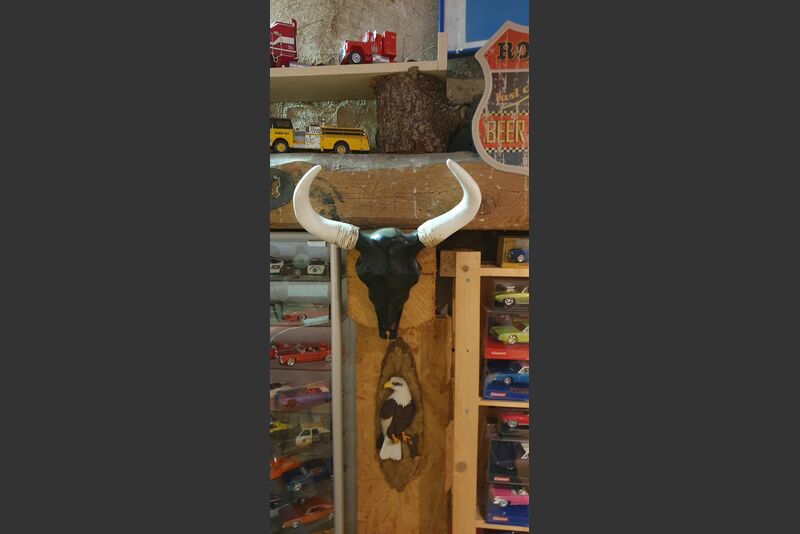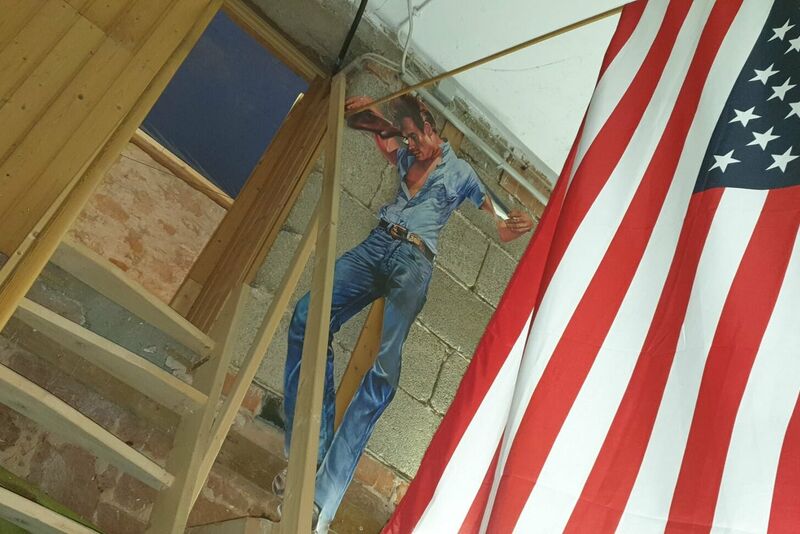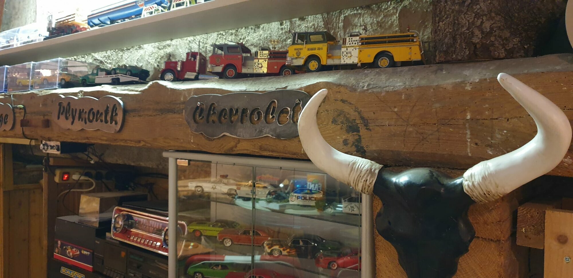 Der Raum wurde als "American Barn" gestaltet, also Steinwände und Holzbalken
